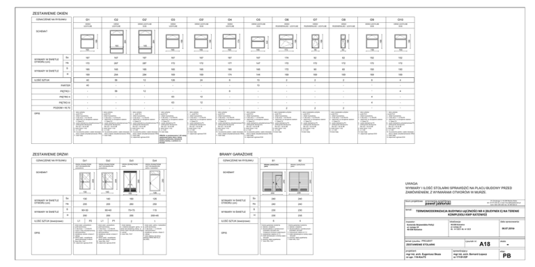ZESTAWIENIE OKIEN OZNACZENIE NA RYSUNKU O1 O2 O2' O3 O3' O4 O5 O6 O7 O8 O9 O10 OKNO UCHYLNE OKNO UCHYLNE OKNO UCHYLNE EI30 OKNO UCHYLNE OKNO UCHYLNE EI30 OKNO UCHYLNE OKNO UCHYLNE EI30 OKNO ROZWIERALNO - UCHYLNE OKNO ROZWIERALNO - UCHYLNE OKNO ROZWIERALNO - UCHYLNE OKNO UCHYLNE EI30 OKNO UCHYLNE EI30 165 169 169 169 169 169 144 174 169 169 284 284 169 SCHEMAT 165 165 165 165 165 165 172 90 60 150 150 So 167 167 167 167 167 167 167 174 92 62 152 152 Ho 172 287 287 172 172 177 147 172 172 172 172 172 S 165 165 165 165 165 165 165 172 90 60 150 150 H 169 284 284 169 169 174 144 169 169 169 169 169 40 58 12 126 24 6 13 2 2 2 8 4 PARTER 40 - - - - - 13 - - - - - PIĘTRO I - 58 12 - - 6 - - - - - 4 PIĘTRO II - - - 63 12 - - - - - 4 - PIĘTRO III - - - 63 12 - - - - - 4 - POZIOM +16.70 - - - - - - - 2 2 2 - - okno uchylne profil PCV wkład trzyszybowy U dla okna = 0,9 W/m²K odporność na obciążenie wiatrem => klasa C4 6. szyba zewnętrzna antywłamaniowa P4 7. izolacyjność akustyczna Rw min = 32-34 dB 8. Solar factor =<42 9. Lt =>60 10. na poziomie parteru i piętra stosować okna o klasie antywłamaniowości WK2 11. kolor biały 1. okno uchylne 2. profil PCV 3. wkład trzyszybowy 4. U dla okna = 0,9 W/m²K 5. odporność na obciążenie wiatrem => klasa C4 2. szyba zewnętrzna antywłamaniowa P4 7. izolacyjność akustyczna Rw min = 32-34 dB 8. Solar factor =<42 9. Lt =>60 10. na poziomie parteru i piętra stosować okna o klasie antywłamaniowości WK2 11. kolor biały WYMIARY W ŚWIETLE OTWORU (cm) WYMIARY W ŚWIETLE ILOŚĆ SZTUK 1. 2. 3. 4. 5. OPIS 1. 2. 3. 4. 5. okno uchylne 2. profil PCV wkład trzyszybowy U dla okna = 1,4 W/m²K odporność na obciążenie wiatrem => klasa C4 6. szyba zewnętrzna antywłamaniowa P4 7. izolacyjność akustyczna Rw min = 32-34 dB 8. Solar factor =<42 9. Lt =>60 10. na poziomie parteru i piętra stosować okna o klasie antywłamaniowości WK2 11. kolor biały 12. odporność ogniowa EI30 1. okno uchylne 2. profil PCV 3. wkład trzyszybowy 4. U dla okna = 0,9 W/m²K 5. odporność na obciążenie wiatrem => klasa C4 6. szyba zewnętrzna P2 7. izolacyjność akustyczna Rw min = 32-34 dB 8. Solar factor =<42 9. Lt =>60 10. kolor biały 1. 2. 3. 4. 5. okno uchylne 2. profil PCV wkład trzyszybowy U dla okna = 1,4 W/m²K odporność na obciążenie wiatrem => klasa C4 6. szyba zewnętrzna P2 7. izolacyjność akustyczna Rw min = 32-34 dB 8. Solar factor =<42 9. Lt =>60 10. kolor biały 11. odporność ogniowa EI30 1. 2. 3. 4. 5. okno uchylne profil PCV wkład trzyszybowy U dla okna = 0,9 W/m²K odporność na obciążenie wiatrem => klasa C4 6. szyba zewnętrzna antywłamaniowa P4 7. izolacyjność akustyczna Rw min = 32-34 dB 8. Solar factor =<42 9. Lt =>60 10. na poziomie parteru i piętra stosować okna o klasie antywłamaniowości WK2 11. kolor biały 1. 2. 3. 4. 5. okno uchylne profil PCV wkład trzyszybowy U dla okna = 1,4 W/m²KK odporność na obciążenie wiatrem => klasa C4 6. szyba zewnętrzna antywłamaniowa P4 7. izolacyjność akustyczna Rw min = 32-34 dB 8. Solar factor =<42 9. Lt =>60 10. na poziomie parteru i piętra stosować okna o klasie antywłamaniowości WK2 11. kolor biały 12. odporność ogniowa EI30 1. okno rozwieralno-uchylne 2. profil PCV 3. wkład trzyszybowy 4. U dla okna = 0,9 W/m²K 5. odporność na obciążenie wiatrem => klasa C4 6. szyba zewnętrzna P2 7. izolacyjność akustyczna Rw min = 32-34 dB 8. Solar factor =<42 9. Lt =>60 10.kolor biały 1. okno rozwieralno-uchylne 2. profil PCV 3. wkład trzyszybowy 4. U dla okna = 0,9 W/m²K 5. odporność na obciążenie wiatrem => klasa C4 6. szyba zewnętrzna P2 7. izolacyjność akustyczna Rw min = 32-34 dB 8. Solar factor =<42 9. Lt =>60 10.kolor biały 1. okno rozwieralno-uchylne 2. profil PCV 3. wkład trzyszybowy 4. U dla okna = 0,9 W/m²K 5. odporność na obciążenie wiatrem => klasa C4 6. szyba zewnętrzna P2 7. izolacyjność akustyczna Rw min = 32-34 dB 8. Solar factor =<42 9. Lt =>60 10.kolor biały 1. 2. 3. 4. 5. okno uchylne profil PCV wkład trzyszybowy U dla okna = 1,4 W/m²K odporność na obciążenie wiatrem => klasa C4 6. szyba zewnętrzna P2 7. izolacyjność akustyczna Rw min = 32-34 dB 8. Solar factor =<42 9. Lt =>60 10. kolor biały 11. odporność ogniowa EI30 1. okno uchylne 2. profil PCV 3. wkład trzyszybowy 4. U dla okna = 1,4 W/m²K 5. odporność na obciążenie wiatrem => klasa C4 6. szyba zewnętrzna antywłamaniowa P4 7. izolacyjność akustyczna Rw min = 32-34 dB 8. Solar factor =<42 9. Lt =>60 10. na poziomie parteru i piętra stosować okna o klasie antywłamaniowości WK2 11. kolor biały 12.odporność ogniowa EI30 kluczyk. ZESTAWIENIE DRZWI BRAMY GARAŻOWE OZNACZENIE NA RYSUNKU Dz1 Dz2 DRZWI ZEWNĘTRZNE ANTYWŁAMANIOWE przeszklone Dz3 DRZWI ZEWNĘTRZNE ANTYWŁAMANIOWE przeszklone OZNACZENIE NA RYSUNKU Dz4 DRZWI ZEWNĘTRZNE pełne 160 125 130 140 160 125 Ho 205 205 260 250 S 90+30 90+40 75+75 115 200 200 255 200+45 2 1 H L1 P2 1. drzwi zewn. przeszklone 2. profil aluminiowy 3. U dla drzwi = 1,8 W/m²K 4. szyba z folią antywłamaniową 5. samozamykacz 6. dodatkowy zamek w klasie C 7. odboje 8. dolna część - wypełnienie: panel aluminiowy h=90cm 9. kolor RAL 7037 10. odporność ogniowa EI30 L1 P1 1. drzwi zewn. przeszklone 2. profil aluminiowy 3. U dla drzwi = 1,8 W/m²K 4. szyba z folią antywłamaniową 5. samozamykacz 6. dodatkowy zamek w klasie C 7. odboje 8. dolna część - wypełnienie: panel aluminiowy h=90cm 9. kolor RAL 7037 10. odporność ogniowa EI30 1. drzwi stalowe, 1. drzwi zewn. pełne z naświetlem 2. z dwiema żaluzjami: górną - w 2. profil aluminiowy ramie nad ościeżnicą, dolną - w 3. U dla drzwi = 1,3 W/m²K dolnej części skrzydła drzwiowego 4. samozamykacz 3. zamek 5. dodatkowy zamek w klasie C 4. kolor RAL 7037 6. odboje 7. kolor zbliżony do koloru elewacji (RR40 METALIC SILVER) 240 WYMIARY W ŚWIETLE OTWORU (cm) OPIS 240 So 240 240 Ho 240 240 S 230 230 H 235 235 6 4 1.brama garażowa rozwierna 2. 