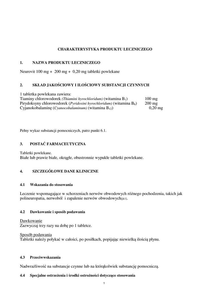 CHARAKTERYSTYKA PRODUKTU LECZNICZEGO 1. NAZWA PRODUKTU LECZNICZEGO Neurovit 100 mg + 200 mg + 0,20 mg tabletki powlekane 2. SKŁAD JAKOŚCIOWY I ILOŚCIOWY SUBSTANCJI CZYNNYCH 1 tabletka powlekana zawiera: Tiaminy chlorowodorek (Thiamini hyrochloridum) (witamina B1) Pirydoksyny chlorowodorek (Pyridoxini hyrochloridum) (witamina B6) Cyjanokobalaminę (Cyanocobalaminum) (witamina B12) 100 mg 200 mg 0,20 mg Pełny wykaz substancji pomocniczych, patrz punkt 6.1. 3. POSTAĆ FARMACEUTYCZNA Tabletki powlekane. Białe lub prawie białe, okrągłe, obustronnie wypukłe tabletki powlekane. 4. 4.1 SZCZEGÓŁOWE DANE KLINICZNE Wskazania do stosowania Leczenie wspomagające w schorzeniach nerwów obwodowych różnego pochodzenia, takich jak polineuropatia, nerwoból i zapalenie nerwów obwodowych[jk1]. 4.2 Dawkowanie i sposób podawania Dawkowanie Zazwyczaj trzy razy na dobę po 1 tabletce. Sposób podawania Tabletki należy połykać w całości, po posiłkach, popijając niewielką ilością płynu. 4.3 Przeciwwskazania Nadwrażliwość na substancje czynne lub na którąkolwiek substancję pomocniczą. 4.4 Specjalne ostrzeżenia i środki ostrożności dotyczące stosowania 1 Nie należy stosować dużych dawek produktu leczniczego Neurovit dłużej niż przez cztery tygodnie, ponieważ może on wywołać objawy neurologiczne. Preparaty witaminy B12 mogą maskować obraz kliniczny i wyniki badań laboratoryjnych typowych dla powrózkowego zwyrodnienia rdzenia i niedokrwistości złośliwej. 4.5 Interakcje z innymi lekami i inne rodzaje interakcji Jednoczesne podawanie witaminy B6 może zmniejszać skuteczność L-dopy. 4.6 Ciąża i laktacja Ze względu na ograniczone doświadczenie kliniczne, nie zaleca się skojarzonego podawania wysokich dawek witaminy B1, B6 i B12 obecnych w produkcie leczniczym Neurovit[jk2] podczas ciąży i laktacji. 4.7 Wpływ na zdolność prowadzenia pojazdów mechanicznych i obsługiwania urządzeń mechanicznych w ruchu Z wyjątkiem przypadków nasilonych działań niepożądanych, nie należy spodziewać się wpływu na zdolność do prowadzenia pojazdów i obsługi maszyn. 4.8 Działania niepożądane Rzadko (≥ 1/10 000 do < 1/1000) występują niespecyficzne działania niepożądane takie jak nudności, ból głowy oraz zawroty głowy. Mniej prawdopodobne działania niepożądane to reakcje nadwrażliwości, obejmujące głównie skórę po podaniu witaminy B1 lub B12. Po długotrwałym lub nieprawidłowym zażywaniu skrajnie dużych dawek witaminy B6 obserwowano zaburzenia o charakterze nadwrażliwości. 4.9 Przedawkowanie Nie zgłoszono żadnego przypadku przedawkowania. 5. WŁAŚCIWOŚCI FARMAKOLOGICZNE 5.1 Właściwości farmakodynamiczne Grupa farmakoterapeutyczna: witaminy Kod ATC: A11DB Aktywną pochodną witaminy B1 jest pirofosforan tiaminy, pełniący w metabolizmie węglowodanów rolę koenzymu podczas dekarboksylacji alfa-ketokwasów, takich jak pirogronian i alfa-ketoglutaran. Tiamina jest wykrywana w błonach komórkowych tkanek nerwowych, wpływając na czynność neuronów poprzez biosyntezę neuroprzekaźników. Pirydoksyna jest ważnym koenzymem uczestniczącym w metabolizmie aminokwasów, służącym jako grupa prostetyczna ważnych enzymów w tkance nerwowej. Ponadto pirydoksyna wpływa na biosyntezę i stężenie wielu neuroprzekaźników, takich jak dopamina, noradrenalina, adrenalina, 5-hydroksytryptamina, histamina i GABA. 2 Cyjanokobalamina wpływa na syntezę kwasów nukleinowych, która jest szczególnie nasilona w układzie nerwowym, oraz na skład kwasów tłuszczowych w cerebrozydach i fosfolipidach obecnych w komórkach układu nerwowego. Aktywne koenzymy metylokobalamina i 5’-deoksyadenozylokobalamina mają kluczowe znaczenie w procesie wzrostu i replikacji komórek. 5.2 Właściwości farmakokinetyczne Spożycie pokarmu zwiększa wchłanianie tiaminy z przewodu pokarmowego. Tiaminę wykrywa się w niemal wszystkich tkankach organizmu, gdzie pozostaje ona w postaci niezmienionej, zaś w moczu i kale w postaci metabolitów. Pirydoksyna ulega szybkiemu i całkowitemu wchłonięciu z przewodu pokarmowego, a następnie jest przenoszona do krwinek czerwonych. Pochodne witaminy B6, pirydoksal i fosforan pirydoksalu wiążą się z białkami surowicy. Głównym metabolitem obecnym w moczu jest kwas 4-pirydoksylowy. Wchłanianie cyjanokobalaminy następuje w mechanizmie czynnym i biernym. Po związaniu z czynnikiem wewnętrznym (IF), kompleks białko-witamina ulega wchłonięciu w jelicie krętym. Biernym mechanizm dyfuzji może mieć znaczenie w przypadku zwiększonych zasobów związku w całym jelicie cienkim. Witamina B12 wiąże się z białkami surowicy: transkobalaminą I – III. Witamina B12 jest wydalana z moczem, żółcią i kałem. 5.3 Przedkliniczne dane o bezpieczeństwie Ze względu na fizjologiczne występowanie witamin wchodzących w skład produktu leczniczego Neurovit oraz dostępne wyniki badań nieklinicznych, brak jest zagrożenia dla człowieka. 6. DANE FARMACEUTYCZNE 6.1 Wykaz substancji pomocniczych Celuloza mikrokrystaliczna Magnezu stearynian Powidon. Skład otoczki: Makrogol 6000 Tytanu dwutlenek, Talk Hypromeloza Poliakrylanu dyspersja 30[jk3]% 6.2 Niezgodności farmaceutyczne Nie dotyczy. 6.3 Okres ważności 3 lata 3 6.4 Specjalne środki ostrożności przy przechowywaniu Przechowywać w temperaturze poniżej[jk4] 25°C. W celu ochrony przed światłem przechowywać w oryginalnym opakowaniu 6.5 Rodzaj i zawartość opakowania Blistry z folii PVC/PVdC/Al w[jk5] tekturowym pudełku 20 lub 100 tabletek powlekanych Nie wszystkie rodzaje opakowań muszą znajdować się w obrocie. 6.6 Szczególne środki ostrożności dotyczące usuwania Brak szczególnych wymagań. 7. PODMIOT ODPOWIEDZIALNY POSIADAJĄCY POZWOLENIE NA DOPUSZCZENIE DO OBROTU G.L. Pharma 8. NUMER(-Y) POZWOLENIA NA DOPUSZCZENIE DO OBROTU Pozwolenie numer 16360 9. DATA WYDANIA PIERWSZEGO POZWOLENIA NA DOPUSZCZENIE DO OBROTU / DATA PRZEDŁUŻENIA POZ