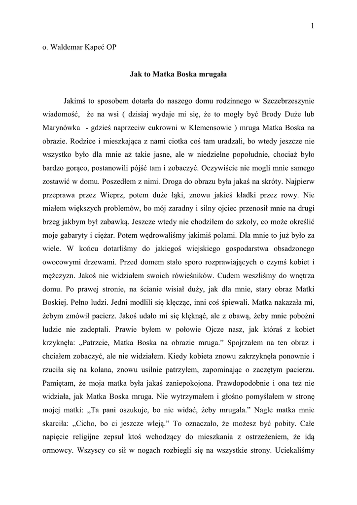 1 o. Waldemar Kapeć OP Jak to Matka Boska mrugała Jakimś to sposobem dotarła do naszego domu rodzinnego w Szczebrzeszynie wiadomość, że na wsi ( dzisiaj wydaje mi się, że to mogły być Brody Duże lub Marynówka - gdzieś naprzeciw cukrowni w Klemensowie ) mruga Matka Boska na obrazie. Rodzice i mieszkająca z nami ciotka coś tam uradzali, bo wtedy jeszcze nie wszystko było dla mnie aż takie jasne, ale w niedzielne popołudnie, chociaż było bardzo gorąco, postanowili pójść tam i zobaczyć. Oczywiście nie mogli mnie samego zostawić w domu. Poszedłem z nimi. Droga do obrazu była jakaś na skróty. Najpierw przeprawa przez Wieprz, potem duże łąki, znowu jakieś kładki przez rowy. Nie miałem większych problemów, bo mój zaradny i silny ojciec przenosił mnie na drugi brzeg jakbym był zabawką. Jeszcze wtedy nie chodziłem do szkoły, co może określić moje gabaryty i ciężar. Potem wędrowaliśmy jakimiś polami. Dla mnie to już było za wiele. W końcu dotarliśmy do jakiegoś wiejskiego gospodarstwa obsadzonego owocowymi drzewami. Przed domem stało sporo rozprawiających o czymś kobiet i mężczyzn. Jakoś nie widziałem swoich rówieśników. Cudem weszliśmy do wnętrza domu. Po prawej stronie, na ścianie wisiał duży, jak dla mnie, stary obraz Matki Boskiej. Pełno ludzi. Jedni modlili się klęcząc, inni coś śpiewali. Matka nakazała mi, żebym zmówił pacierz. Jakoś udało mi się klęknąć, ale z obawą, żeby mnie pobożni ludzie nie zadeptali. Prawie byłem w połowie Ojcze nasz, jak któraś z kobiet krzyknęła: „Patrzcie, Matka Boska na obrazie mruga.” Spojrzałem na ten obraz i chciałem zobaczyć, ale nie widziałem. Kiedy kobieta znowu zakrzyknęła ponownie i rzuciła się na kolana, znowu usilnie patrzyłem, zapominając o zaczętym pacierzu. Pamiętam, że moja matka była jakaś zaniepokojona. Prawdopodobnie i ona też nie widziała, jak Matka Boska mruga. Nie wytrzymałem i głośno pomyślałem w stronę mojej matki: „Ta pani oszukuje, bo nie widać, żeby mrugała.” Nagle matka mnie skarciła: „Cicho, bo ci jeszcze wleją.” To oznaczało, że możesz być pobity. Całe napięcie religijne zepsuł ktoś wchodzący do mieszkania z ostrzeżeniem, że idą ormowcy. Wszyscy co sił w nogach rozbiegli się na wszystkie strony. Uciekaliśmy 2 jakimś zaoranym polem. Przewracałem się. Raz ojciec ciągnął mnie za rękę, a jakbym już fruwał, potem niósł mnie na rękach. Za nami uciekały moja matka i ciotka. Po oddaleniu się na bezpieczną odległość nieco odpoczęliśmy i znowu dość szybko wracaliśmy w stronę Szczebrzeszyna. Nie pamiętam, jak znalazłem się w domu, ponieważ musiałem po drodze zasnąć na rękach ojca lub matki. Rano już nikt nie mówił o mruganiu Matki Boskiej na obrazie. Chociaż mam wielkie nabożeństwo do Matki Boskiej, od dziecka to nabożeństwo nie było naiwne i podatne na sugestie. Pan Jezus powiedział, że nie wejdziemy do Królestwa niebieskiego, skoro nie staniemy się jako dzieci. Wydaje się, że można tutaj to rozumieć jako proste odniesienie do Maryi – Matki bez poddawania się emocjom, które mogłyby zepsuć to proste odniesienie.