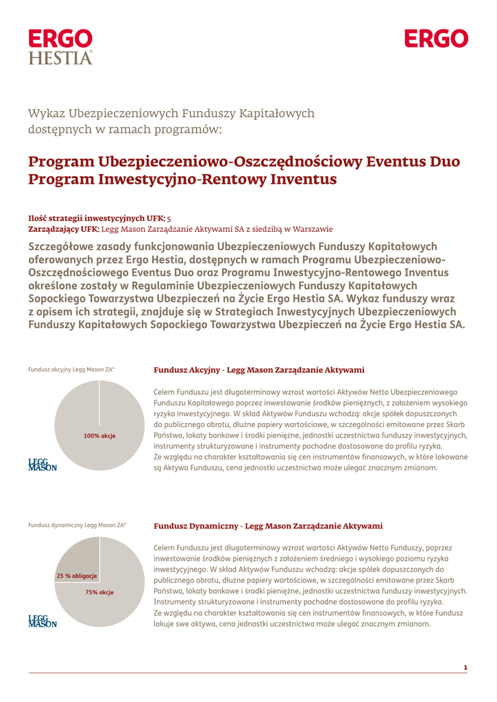 Wykaz Ubezpieczeniowych Funduszy Kapitałowych dostępnych w ramach programów: Program Ubezpieczeniowo-Oszczędnościowy Eventus Duo Program Inwestycyjno-Rentowy Inventus Ilość strategii inwestycyjnych UFK: 5 Zarządzający UFK: Legg Mason Zarządzanie Aktywami SA z siedzibą w Warszawie Szczegółowe zasady funkcjonowania Ubezpieczeniowych Funduszy Kapitałowych oferowanych przez Ergo Hestia, dostępnych w ramach Programu UbezpieczeniowoOszczędnościowego Eventus Duo oraz Programu Inwestycyjno-Rentowego Inventus określone zostały w Regulaminie Ubezpieczeniowych Funduszy Kapitałowych Sopockiego Towarzystwa Ubezpieczeń na Życie Ergo Hestia SA. Wykaz funduszy wraz z opisem ich strategii, znajduje się w Strategiach Inwestycyjnych Ubezpieczeniowych Funduszy Kapitałowych Sopockiego Towarzystwa Ubezpieczeń na Życie Ergo Hestia SA. Fundusz akcyjny Legg Mason ZA* 100% akcje Fundusz dynamiczny Legg Mason ZA* 25 % obligacje 75% akcje Fundusz Akcyjny - Legg Mason Zarządzanie Aktywami Celem Funduszu jest długoterminowy wzrost wartości Aktywów Netto Ubezpieczeniowego Funduszu Kapitałowego poprzez inwestowanie środków pieniężnych, z założeniem wysokiego ryzyka inwestycyjnego. W skład Aktywów Funduszu wchodzą: akcje spółek dopuszczonych do publicznego obrotu, dłużne papiery wartościowe, w szczególności emitowane przez Skarb Państwa, lokaty bankowe i środki pieniężne, jednostki uczestnictwa funduszy inwestycyjnych, instrumenty strukturyzowane i instrumenty pochodne dostosowane do profilu ryzyka. Ze względu na charakter kształtowania się cen instrumentów finansowych, w które lokowane są Aktywa Funduszu, cena jednostki uczestnictwa może ulegać znacznym zmianom. Fundusz Dynamiczny - Legg Mason Zarządzanie Aktywami Celem Funduszu jest długoterminowy wzrost wartości Aktywów Netto Funduszy, poprzez inwestowanie środków pieniężnych z założeniem średniego i wysokiego poziomu ryzyka inwestycyjnego. W skład Aktywów Funduszu wchodzą: akcje spółek dopuszczonych do publicznego obrotu, dłużne papiery wartościowe, w szczególności emitowane przez Skarb Państwa, lokaty bankowe i środki pieniężne, jednostki uczestnictwa funduszy inwestycyjnych. Instrumenty strukturyzowane i instrumenty pochodne dostosowane do profilu ryzyka. Ze względu na charakter kształtowania się cen instrumentów finansowych, w które Fundusz lokuje swe aktywa, cena jednostki uczestnictwa może ulegać znacznym zmianom. 1 Fundusz zrównoważony Legg Mason ZA* 50% akcje 50% obligacje Fundusz stabilnego wzrostu Legg Mason ZA* 25% akcje 75 % obligacje Fundusz pieniężny Legg Mason ZA* 100 % instrumenty rynku pieniężnego Fundusz Zrównoważony - Legg Mason Zarządzanie Aktywami Celem Funduszu jest długoterminowy wzrost wartości Aktywów Netto Funduszu, poprzez inwestowanie środków pieniężnych przy zachowaniu średniego poziomu ryzyka inwestycyjnego. W skład Aktywów Funduszu wchodzą: akcje spółek dopuszczonych do publicznego obrotu, dłużne papiery wartościowe, w szczególności emitowane przez Skarb Państwa, lokaty bankowe i środki pieniężne, jednostki uczestnictwa funduszy inwestycyjnych, instrumenty strukturyzowane i instrumenty pochodne dostosowane do profilu ryzyka. Ze względu na charakter kształtowania się cen instrumentów finansowych, w które lokowane są aktywa, cena jednostki uczestnictwa może ulegać istotnym zmianom. Fundusz Stabilnego Wzrostu - Legg Mason Zarządzanie Aktywami Celem Funduszu jest długoterminowy wzrost wartości Aktywów Netto Ubezpieczeniowego Funduszu Kapitałowego, poprzez inwestowanie środków pieniężnych, przy zachowaniu niskiego i średniego ryzyka inwestycyjnego. W skład Aktywów Funduszu wchodzą: akcje spółek dopuszczonych do publicznego obrotu, dłużne papiery wartościowe, w szczególności emitowane przez Skarb Państwa, lokaty bankowe i środki pieniężne, jednostki uczestnictwa funduszy inwestycyjnych, instrumenty strukturyzowane i instrumenty pochodne dostosowane do profilu ryzyka. Ze względu na charakter kształtowania się cen instrumentów finansowych, w które lokowane są Aktywa Funduszu, cena jednostki uczestnictwa może ulegać niewielkim zmianom. Fundusz Pieniężny - Legg Mason Zarządzanie Aktywami Celem Funduszu jest ochrona wartości Aktywów Netto Ubezpieczeniowego Funduszu Kapitałowego poprzez inwestowanie środków pieniężnych przy zachowaniu niskiego poziomu ryzyka inwestycyjnego. W skład Aktywów Funduszu wchodzą: instrumenty rynku pieniężnego, dłużne papiery wartościowe, w szczególności emitowane przez Skarb Państwa, lokaty bankowe i środki pieniężne, jednostki uczestnictwa funduszy inwestycyjnych, instrumenty strukturyzowane i instrumenty pochodne dostosowane do profilu ryzyka. Ze względu na charakter kształtowania się cen instrumentów finansowych, w które lokowane są Aktywa Funduszu, cena jednostki uczestnictwa może ulegać niewielkim zmianom. Lista UFK Akcje Obligacje UFK Akcyjny - Legg Mason ZA 100% 0% UFK Dynamiczny - Legg Mason ZA 75% 25% UFK Zrównoważony - Legg Mason ZA 50% 50% UFK Stabilnego Wzrostu - Legg Mason ZA 25% 75% 0% 100% UFK Akcyjny - LM ZA jna UFK Dynamiczny- LM ZA ycy est w n i gia UFK Zrównoważony- LM ZA ate Str UFK Stabilnego Wzrostu - LM ZA UFK Pieniężny - LM ZA Oczekiwana stopa zwrotu z inwestycji Fundusze alternatywne UFK Pieniężny - Legg Mason ZA Ryzyko Profil ryzyka* Ryzyko Fundusze podstawowe UFK na mapie ryzyka 100% rynek pieniężny Zalecany okres inwestycji * Prezentacja modelowej struktury Aktywów Funduszu nie stanowi zobowiązania zarządzającego funduszem do zachowania określonej struktury aktywów w procesie inwestycyjnym a jedynie ma charakter informacyjny, dla zobrazowania profilu ryzyka charakteryzującego dany fundusz. 2