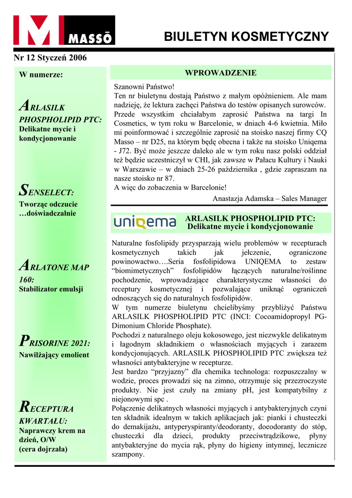BIULETYN KOSMETYCZNY Nr 12 Styczeń 2006 W numerze: ARLASILK PHOSPHOLIPID PTC: Delikatne mycie i kondycjonowanie SENSELECT: Tworząc odczucie …doświadczalnie ARLATONE MAP 160: Stabilizator emulsji PRISORINE 2021: Nawilżający emolient RECEPTURA KWARTAŁU: Naprawczy krem na dzień, O/W (cera dojrzała) WPROWADZENIE Szanowni Państwo! Ten nr biuletynu dostają Państwo z małym opóźnieniem. Ale mam nadzieję, że lektura zachęci Państwa do testów opisanych surowców. Przede wszystkim chciałabym zaprosić Państwa na targi In Cosmetics, w tym roku w Barcelonie, w dniach 4-6 kwietnia. Miło mi poinformować i szczególnie zaprosić na stoisko naszej firmy CQ Masso – nr D25, na którym będę obecna i także na stoisko Uniqema - J72. Być może jeszcze daleko ale w tym roku nasz polski oddział też będzie uczestniczył w CHI, jak zawsze w Pałacu Kultury i Nauki w Warszawie – w dniach 25-26 października , gdzie zapraszam na nasze stoisko nr 87. A więc do zobaczenia w Barcelonie! Anastazja Adamska – Sales Manager ARLASILK PHOSPHOLIPID PTC: Delikatne mycie i kondycjonowanie Naturalne fosfolipidy przysparzają wielu problemów w recepturach kosmetycznych takich jak jełczenie, ograniczone powinowactwo….Seria fosfolipidowa UNIQEMA to zestaw “biomimetycznych” fosfolipidów łączących naturalne/roślinne pochodzenie, wprowadzające charakterystyczne własności do receptury kosmetycznej i pozwalające uniknąć ograniczeń odnoszących się do naturalnych fosfolipidów. W tym numerze biuletynu chcielibyśmy przybliżyć Państwu ARLASILK PHOSPHOLIPID PTC (INCI: Cocoamidopropyl PGDimonium Chloride Phosphate). Pochodzi z naturalnego oleju kokosowego, jest niezwykle delikatnym i łagodnym składnikiem o własnościach myjących i zarazem kondycjonujących. ARLASILK PHOSPHOLIPID PTC zwiększa też własności antybakteryjne w recepturze. Jest bardzo “przyjazny” dla chemika technologa: rozpuszczalny w wodzie, proces prowadzi się na zimno, otrzymuje się przezroczyste produkty. Nie jest czuły na zmiany pH, jest kompatybilny z niejonowymi spc . Połączenie delikatnych własności myjących i antybakteryjnych czyni ten składnik idealnym w takich aplikacjach jak: pianki i chusteczki do demakijażu, antyperyspiranty/deodoranty, doeodoranty do stóp, chusteczki dla dzieci, produkty przeciwtrądzikowe, płyny antybakteryjne do mycia rąk, płyny do higieny intymnej, lecznicze szampony. Strona 2 Biuletyn Kosmetyczny SENSELECT: Tworząc odczucie …doświadczalnie Od kiedy Uniqema wprowadziła SenSelect, prawie 3 lata temu (pisaliśmy o tym w nr 3 biuletynu), “narzędzie” to jest w ciągłym udoskonalaniu aby zapewnić lepszy serwis dla „społeczności kosmetycznej”. Uznaliśmy, że warto przypomnieć i odświeżyć informacje, zachęcić do przyłączania się do światowego klubu kosmetologów korzystających regularnie z SenSelect. SenSelect pomaga technologom zaprojektować kosmetyk w układzie: emulgator/emolient (E/E) i przez to też pomaga w identyfikacji surowców firmy UNIQEMA do zastosowania w recepturach o żądanych (zdefiniowanych i określonych ilościowo) cechach. Analiza komputerowa, już poza SenSelect, pokazuje właściwy dobór składników (E/E) ułatwiający znacząco przygotowanie receptur. PYTANIE: wymagane odczucie na skórze ODPOWIEDŹ: składniki receptury SenSelect jest bardzo pomocny w tworzeniu emulsji do pielęgnacji twarzy i ciała, kosmetyków przeciwsłonecznych, płynnych podkładów (make-up’y). A teraz dostępna jest już II wersja SenSelect. !! Sensory attributes Pick-up Firmness Cohesiveness Rub-Out Spreadability Thickness after 12 rubs Grease after 15-20 rubs/ Oil after 15-20 rubs/ Wetness Absorbency Afterfeel Slipperiness Gloss Waxy % (Type of residue) Greasy % (Type of residue) Levels (very low, low, medium, high, very high ….jej dodatkowe zalety 1. można wyselekcjonować do 12 cech sensorycznych (rozprowadzanie, zwilżenie, tłustość..) 2. każda cecha sensoryczna może być zgrupowana w 5 stopniowy profil sensoryczny (levels) 3. dodanych zostało wiele nowych receptur 4. użycie różnych kolorów na stronie z wynikiem ułatwia szybkie znalezienie receptury najbardziej pasującej do zadanych parametrów 5. wprowadzenie tabeli punktowej wskazuje jak wyselekcjonowana receptura jest bliska wymaganej/oczekiwanej 6. SenSelect jest dostępny w 5 językach! Zainteresowanych prosimy o kontakt z CQ Masso, o dostęp do SenSelect „on line”! ARLATONE MAP 160K: stabilizator emulsji ARLATONE MAP 160K (INCI: Potassium Cetyl Phosphate) jest rozpuszczalnym w wodzie długołańcuchowym organicznym estrem kwasu fosforowego, występuje jako sól potasowa, jest w postaci proszku. Ten składnik kosmetyczny działa jako stabilizator emulsji , można wprowadzić do receptury różne rodzaje olejów. Receptury zawierające ARLATONE MAP 160K wykazują zwiększoną stabilność w podwyższonej i niskiej temperaturze. ARLATONE MAP 160K jest ogólnie używany jako koemulgator z niejonowymi spc o niskim HLB, ale może być też używany jako główny emulgator dostarczając świetnych własności w naturalnym pH skóry. Nie nastręcza trudności w pracy. Jest rozpuszczalny w gorącej wodzie więc może być rozpuszczony w fazie wodnej podczas tworzenia emulsji. ARLATONE MAP 160K może być zamiennikiem polimerów poliakrylowych w większości receptur, z tą przewagą, że fizycznie łatwiej jest go użyć niż polimery. W przypadku ARLATONE MAP 160K nie ma żadnych problemów z dyspergowaniem, zobojętnianiem czy zwilżaniem. I warto podkreślić, że ARLATONE MAP 160K wzmacnia połysk kremów, wpływa na dobre rozprowadzanie i lekkie odczucie na skórze. Strona 3 Biuletyn Kosmetyczny PRISORINE 2021: Nawilżający emolient W nr 8 naszego biuletynu przedstawiliśmy Państwu serię emolientów Uniqema pod nazwą handlową PRISORINE, otrzymanych z (roślinnego) kwasu izostearynowego. Oprócz cennych własności wspólnych dla całej serii warto po