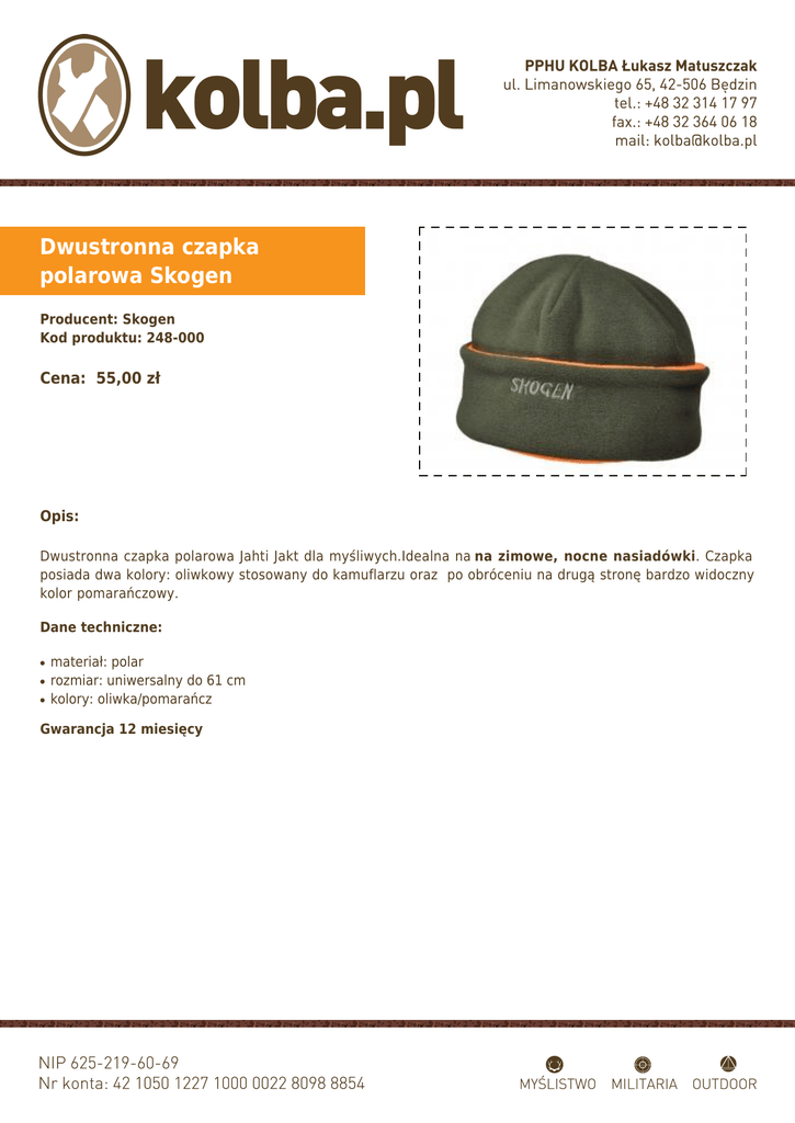Dwustronna czapka polarowa Skogen Producent: Skogen Kod produktu: 248-000 Cena: 55,00 zł Opis: Dwustronna czapka polarowa Jahti Jakt dla myśliwych.Idealna na na zimowe, nocne nasiadówki. Czapka posiada dwa kolory: oliwkowy stosowany do kamuflarzu oraz po obróceniu na drugą stronę bardzo widoczny kolor pomarańczowy. Dane techniczne: ● ● ● materiał: polar rozmiar: uniwersalny do 61 cm kolory: oliwka/pomarańcz Gwarancja 12 miesięcy