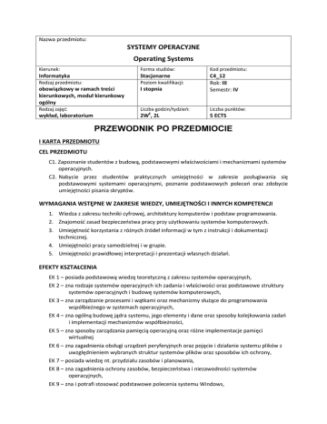 Nazwa przedmiotu: SYSTEMY OPERACYJNE Operating Systems Kierunek: Forma studiów: Kod przedmiotu: Informatyka Stacjonarne Rodzaj przedmiotu: Poziom kwalifikacji: obowiązkowy w ramach treści kierunkowych, moduł kierunkowy ogólny I stopnia C4_12 Rok: III Semestr: IV Rodzaj zajęć: Liczba godzin/tydzień: Liczba punktów: wykład, laboratorium 2WE, 2L 5 ECTS PRZEWODNIK PO PRZEDMIOCIE I KARTA PRZEDMIOTU CEL PRZEDMIOTU C1. Zapoznanie studentów z budową, podstawowymi właściwościami i mechanizmami systemów operacyjnych. C2. Nabycie przez studentów praktycznych umiejętności w zakresie posługiwania się podstawowymi systemami operacyjnymi, poznanie podstawowych poleceń oraz zdobycie umiejętności pisania skryptów. WYMAGANIA WSTĘPNE W ZAKRESIE WIEDZY, UMIEJĘTNOŚCI I INNYCH KOMPETENCJI 1. Wiedza z zakresu techniki cyfrowej, architektury komputerów i podstaw programowania. 2. Znajomość zasad bezpieczeństwa pracy przy użytkowaniu systemów komputerowych. 3. Umiejętność korzystania z różnych źródeł informacji w tym z instrukcji i dokumentacji technicznej. 4. Umiejętności pracy samodzielnej i w grupie. 5. Umiejętności prawidłowej interpretacji i prezentacji własnych działań. EFEKTY KSZTAŁCENIA EK 1 – posiada podstawową wiedzę teoretyczną z zakresu systemów operacyjnych, EK 2 – zna rodzaje systemów operacyjnych ich zadania i właściwości oraz podstawowe struktury systemów operacyjnych i budowę systemów komputerowych, EK 3 – zna zarządzanie procesami i wątkami oraz mechanizmy służące do programowania współbieżnego w systemach operacyjnych, EK 4 – zna ogólną budowę jądra systemu, jego elementy i dane oraz sposoby kolejkowania zadań i implementacji mechanizmów współbieżności, EK 5 – zna sposoby zarządzania pamięcią operacyjną oraz różne implementacje pamięci wirtualnej EK 6 – zna zagadnienia obsługi urządzeń peryferyjnych oraz pojęcie i działanie systemu plików z uwzględnieniem wybranych struktur systemów plików oraz sposobów ich ochrony, EK 7 – posiada wiedzę nt. przydziału zasobów i planowania, EK 8 – zna zagadnienia ochrony zasobów, bezpieczeństwa i niezawodności systemów operacyjnych, EK 9 – zna i potrafi stosować podstawowe polecenia systemu Windows, EK 10 – potrafi przygotowywać skrypty dla systemu Windows, EK 11– zna i potrafi stosować podstawowe polecenia systemu Unix (Linux), EK 12 – potrafi przygotowywać skrypty dla systemu Unix (Linux). TREŚCI PROGRAMOWE Forma zajęć – WYKŁADY W 1 – Rodzaje systemów operacyjnych. W 2 – Zadania i właściwości systemu operacyjnego. W 3 – Procesy współbieżne. W 4 – Jądro systemu. W 5 – Zarządzanie pamięcią operacyjną. Pamięć wirtualna. W 6 – Obsługa wejścia i wyjścia. W 7 – System plików. W 8 – Przydział zasobów i planowanie. W 9 – Ochrona zasobów. W 10 – Bezpieczeństwo systemu. W 11 – Niezawodność systemu. Forma zajęć – LABORATORIUM L 1 – Wprowadzenie do systemu Windows. L 2 – Podstawy użytkowania wiersza poleceń systemu Windows. L 3 – Zaawansowane użytkowanie wiersza poleceń. L 4 – Strumienie danych, potoki danych oraz pliki wsadowe. L 5 – Podstawy administracji systemem Windows. L 6 – Host skryptów systemu Windows. L 7 – Podstawowe polecenia systemu Linux. L 8 – Mechanizmy wejścia/wyjścia systemu Linux. L 9 – Edytor vi. Podstawy pisania skryptów w systemie Linux. L 10 – Instrukcje warunkowe i pętli w skryptach w systemie Linux. L 11 –Poznanie podstaw obsługi sieci w systemie Linux. L 12 – Obsługa i konfiguracja X Windows w systemie Linux. L 13 – Zaawansowane polecenia systemu Linux. L 14 – Zapoznanie się z Symulatorem działania Systemu Operacyjnego. L 15 – Ćwiczenia z wykorzystaniem Symulatora działania Systemu Operacyjnego. Liczba godzin 2 2 4 2 5 3 4 2 2 2 2 Liczba godzin 2 2 2 2 2 2 2 2 2 2 2 2 2 2 2 NARZĘDZIA DYDAKTYCZNE 1. – Wykład z wykorzystaniem prezentacji multimedialnych 2. – Ćwiczenia laboratoryjne, opracowanie sprawozdań z realizacji przebiegu ćwiczeń 3. – Przykładowe systemy operacyjne zainstalowane na komputerach laboratoryjnych 4. – Instrukcje do wykonania ćwiczeń laboratoryjnych 5. – Symulator systemu operacyjnego 6. – Strona internetowa nt. systemów operacyjnych SPOSOBY OCENY ( F – FORMUJĄCA, P – PODSUMOWUJĄCA) F1. – ocena przygotowania do ćwiczeń laboratoryjnych F2. – ocena umiejętności stosowania zdobytej wiedzy podczas wykonywania ćwiczeń 2 F3. – ocena sprawozdań z realizacji ćwiczeń objętych programem nauczania F4. – ocena aktywności podczas zajęć P1. – ocena znajomości poszczególnych systemów operacyjnych oraz umiejętności rozwiązywania postawionych problemów– zaliczenie na ocenę* P2. – ocena opanowania materiału nauczania będącego przedmiotem wykładu – zaliczenie wykładu (lub egzamin) * warunkiem uzyskania zaliczenia jest otrzymanie pozytywnych ocen ze wszystkich kolokwiów, OBCIĄŻENIE PRACĄ STUDENTA Forma aktywności Średnia liczba godzin na zrealizowanie aktywności 30W 30L 60 h Godziny kontaktowe z prowadzącym Godziny kontaktowe z prowadzącym - egzamin 3h Godziny konsultacji z prowadzącym 5h Zapoznanie się ze wskazaną literaturą 12 h Przygotowanie do ćwiczeń laboratoryjnych 15 h Wykonanie sprawozdań z realizacji ćwiczeń laboratoryjnych i 10 h utrwalenie materiału (czas poza zajęciami laboratoryjnymi) Przygotowanie do egzaminu (kolokwium) 20 h Suma SUMARYCZNA LICZBA PUNKTÓW ECTS DLA PRZEDMIOTU Liczba punktów ECTS, którą student uzyskuje na zajęciach wymagających bezpośredniego udziału prowadzącego Liczba punktów ECTS, którą student uzyskuje w ramach zajęć o charakterze praktycznym, w tym zajęć laboratoryjnych i projektowych 125 h 5 ECTS 2.7 ECTS 2.2 ECTS LITERATURA PODSTAWOWA I UZUPEŁNIAJĄCA 1. Abraham Silberschatz, Peter B. Galvin, Greg Gagne: Podstawy systemów operacyjnych, WNT 2005, 2. William Stallings: Systemy o