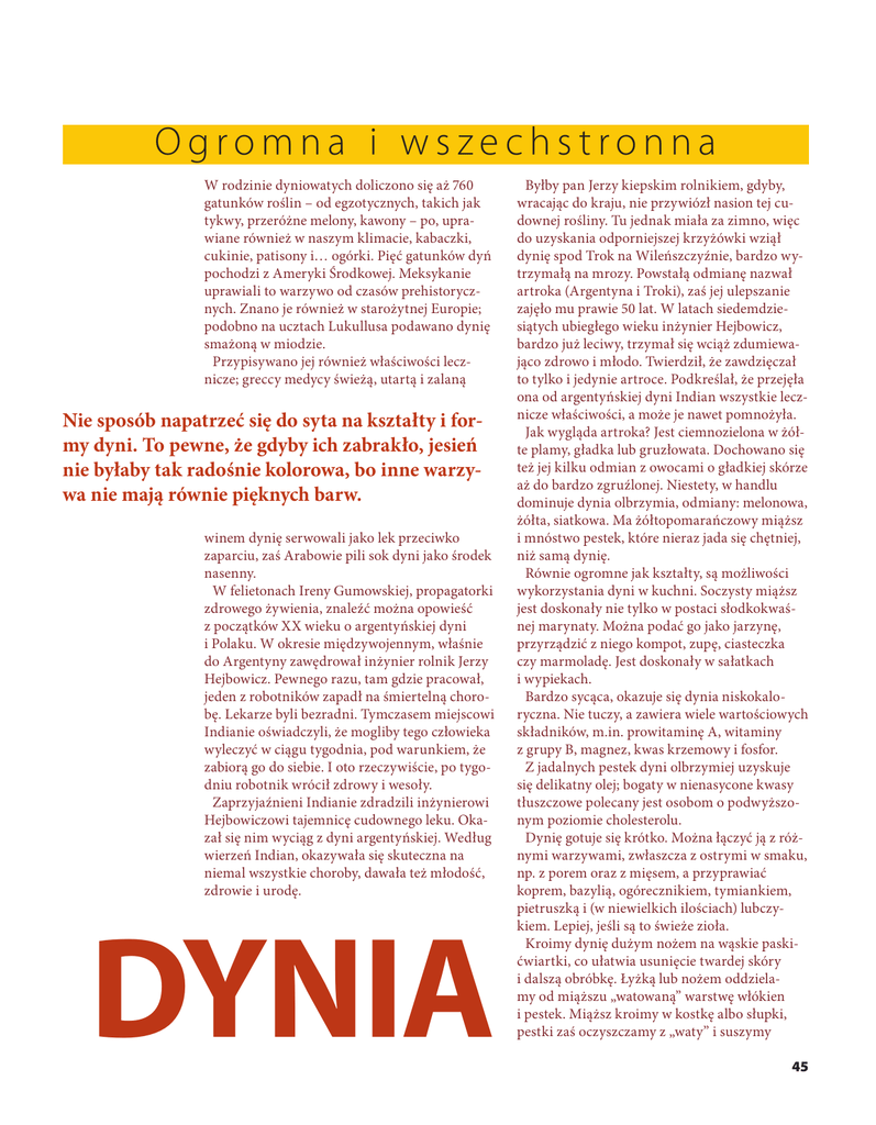 Ogromna i wszechstronna W rodzinie dyniowatych doliczono się aż 760 gatunków roślin – od egzotycznych, takich jak tykwy, przeróżne melony, kawony – po, uprawiane również w naszym klimacie, kabaczki, cukinie, patisony i… ogórki. Pięć gatunków dyń pochodzi z Ameryki Środkowej. Meksykanie uprawiali to warzywo od czasów prehistorycznych. Znano je również w starożytnej Europie; podobno na ucztach Lukullusa podawano dynię smażoną w miodzie. Przypisywano jej również właściwości lecznicze; greccy medycy świeżą, utartą i zalaną Nie sposób napatrzeć się do syta na kształty i formy dyni. To pewne, że gdyby ich zabrakło, jesień nie byłaby tak radośnie kolorowa, bo inne warzywa nie mają równie pięknych barw. winem dynię serwowali jako lek przeciwko zaparciu, zaś Arabowie pili sok dyni jako środek nasenny. W felietonach Ireny Gumowskiej, propagatorki zdrowego żywienia, znaleźć można opowieść z początków XX wieku o argentyńskiej dyni i Polaku. W okresie międzywojennym, właśnie do Argentyny zawędrował inżynier rolnik Jerzy Hejbowicz. Pewnego razu, tam gdzie pracował, jeden z robotników zapadł na śmiertelną chorobę. Lekarze byli bezradni. Tymczasem miejscowi Indianie oświadczyli, że mogliby tego człowieka wyleczyć w ciągu tygodnia, pod warunkiem, że zabiorą go do siebie. I oto rzeczywiście, po tygodniu robotnik wrócił zdrowy i wesoły. Zaprzyjaźnieni Indianie zdradzili inżynierowi Hejbowiczowi tajemnicę cudownego leku. Okazał się nim wyciąg z dyni argentyńskiej. Według wierzeń Indian, okazywała się skuteczna na niemal wszystkie choroby, dawała też młodość, zdrowie i urodę. DYNIA Byłby pan Jerzy kiepskim rolnikiem, gdyby, wracając do kraju, nie przywiózł nasion tej cudownej rośliny. Tu jednak miała za zimno, więc do uzyskania odporniejszej krzyżówki wziął dynię spod Trok na Wileńszczyźnie, bardzo wytrzymałą na mrozy. Powstałą odmianę nazwał artroka (Argentyna i Troki), zaś jej ulepszanie zajęło mu prawie 50 lat. W latach siedemdziesiątych ubiegłego wieku inżynier Hejbowicz, bardzo już leciwy, trzymał się wciąż zdumiewająco zdrowo i młodo. Twierdził, że zawdzięczał to tylko i jedynie artroce. Podkreślał, że przejęła ona od argentyńskiej dyni Indian wszystkie lecznicze właściwości, a może je nawet pomnożyła. Jak wygląda artroka? Jest ciemnozielona w żółte plamy, gładka lub gruzłowata. Dochowano się też jej kilku odmian z owocami o gładkiej skórze aż do bardzo zgruźlonej. Niestety, w handlu dominuje dynia olbrzymia, odmiany: melonowa, żółta, siatkowa. Ma żółtopomarańczowy miąższ i mnóstwo pestek, które nieraz jada się chętniej, niż samą dynię. Równie ogromne jak kształty, są możliwości wykorzystania dyni w kuchni. Soczysty miąższ jest doskonały nie tylko w postaci słodkokwaśnej marynaty. Można podać go jako jarzynę, przyrządzić z niego kompot, zupę, ciasteczka czy marmoladę. Jest doskonały w sałatkach i wypiekach. Bardzo sycąca, okazuje się dynia niskokaloryczna. Nie tuczy, a zawiera wiele wartościowych składników, m.in. prowitaminę A, witaminy z grupy B, magnez, kwas krzemowy i fosfor. Z jadalnych pestek dyni olbrzymiej uzyskuje się delikatny olej; bogaty w nienasycone kwasy tłuszczowe polecany jest osobom o podwyższonym poziomie cholesterolu. Dynię gotuje się krótko. Można łączyć ją z różnymi warzywami, zwłaszcza z ostrymi w smaku, np. z porem oraz z mięsem, a przyprawiać koprem, bazylią, ogórecznikiem, tymiankiem, pietruszką i (w niewielkich ilościach) lubczykiem. Lepiej, jeśli są to świeże zioła. Kroimy dynię dużym nożem na wąskie paskićwiartki, co ułatwia usunięcie twardej skóry i dalszą obróbkę. Łyżką lub nożem oddzielamy od miąższu „watowaną” warstwę włókien i pestek. Miąższ kroimy w kostkę albo słupki, pestki zaś oczyszczamy z „waty” i suszymy 45 w piekarniku. Są świetne do chrupania „przed telewizorem”, ale też jako dodatek do surówek. O ich wartości najlepiej świadczy fakt, że wykorzystuje się je do produkcji leków. Dynia z pomarańczami 3 pomarańcze sparzyć i osuszyć. Skórkę cienko obrać, pokroić w paski, a miąższ pokroić w kostkę. Dynię (około 3 kg) obrać. Miąższ pokroić w kostkę grubości 2 cm, włożyć do miski, dodać skórkę i miąższ pomarańczy. Szklankę cukru rozpuścić w szklance octu winnego, zalać dynię. Przykryć, odstawić na noc. Powstały sok zlać do rondla, dodać 2 szklanki cukru i szklankę białego octu winnego, po czym zagotować. Włożyć dynię, gotować 20 minut. Przełożyć do słoików i zamknąć. Sałatka z dyni 70 dag dyni, 3 strąki różnokolorowej papryki, 15 dag wędliny, 2 ząbki czosnku, kwasek cytrynowy, po 1 łyżeczce posiekanej natki pietruszki i szczypiorku, 2 łyżki majonezu, oleju lub śmietany, sól, pieprz. Dynię obrać, pokroić w grubą kostkę i wrzucić na kilka minut do wrzącej, osolonej wody z dodatkiem kwasku cytrynowego. Na wpół miękką wyjąć z wody i odcedzić. Z papryki usunąć gniazda nasienne, pokroić ją w kostkę – podobnie jak wędlinę. Składniki połączyć. Doprawić do smaku solą, pieprzem i roztartym czosnkiem. Wymieszać z majonezem, śmietaną lub olejem. Podawać na liściach sałaty. Złocista zapiekanka Przygotowanie: 25 minut, zapiekanie 35 minut. Danie dla 6 osób. 75 dag dyni, 40 dag surowej szynki wieprzowej, szklanka śmietany, 4 łyżki mleka, 15 dag startego żółtego sera, cebula, ząbek czosnku, łyżka masła, łyżka oleju, sól, pieprz, łyżka ziół prowansalskich. Cebulę i czosnek obrać, posiekać. Mięso pokroić w małą, a dynię w dużą kostkę. Olej i masło rozgrzać na patelni, wrzucić mięso, oprószyć solą, pieprzem i ziołami prowansalskimi, smażyć 5 minut. Dodać dynię i smażyć 3 minuty. Dynię z mięsem przełożyć do żaroodpornego naczynia, polać śmietaną wymieszaną z mlekiem