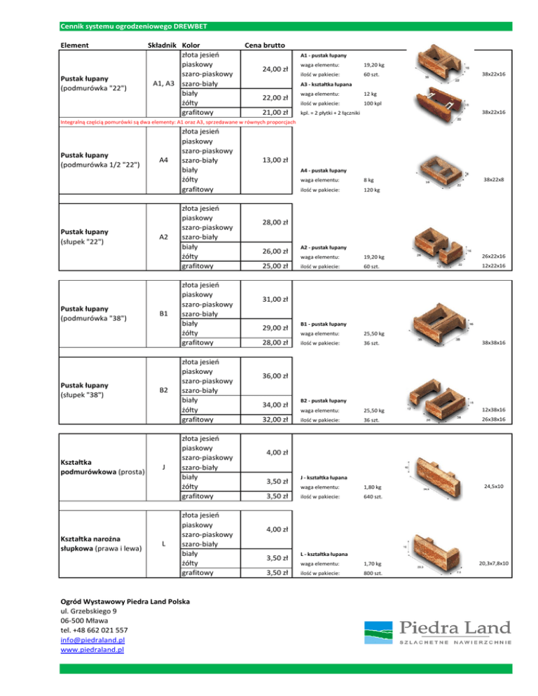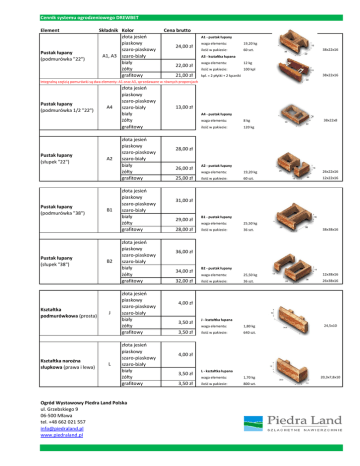 Cennik systemu ogrodzeniowego DREWBET Element Pustak łupany (podmurówka "22") Składnik Kolor złota jesień piaskowy szaro-piaskowy A1, A3 szaro-biały biały żółty grafitowy Cena brutto A1 - pustak łupany 24,00 zł waga elementu: 19,20 kg ilość w pakiecie: 60 szt. 38x22x16 A3 - kształtka łupana 22,00 zł 21,00 zł waga elementu: 12 kg ilość w pakiecie: 100 kpl 38x22x16 kpl. = 2 płytki + 2 łączniki Integralną częścią pomurówki są dwa elementy: A1 oraz A3, sprzedawane w równych proporcjach Pustak łupany (podmurówka 1/2 "22") Pustak łupany (słupek "22") Pustak łupany (podmurówka "38") Pustak łupany (słupek "38") Kształtka podmurówkowa (prosta) Kształtka narożna słupkowa (prawa i lewa) A4 A2 B1 B2 J L złota jesień piaskowy szaro-piaskowy szaro-biały biały żółty grafitowy złota jesień piaskowy szaro-piaskowy szaro-biały biały żółty grafitowy złota jesień piaskowy szaro-piaskowy szaro-biały biały żółty grafitowy złota jesień piaskowy szaro-piaskowy szaro-biały biały żółty grafitowy złota jesień piaskowy szaro-piaskowy szaro-biały biały żółty grafitowy złota jesień piaskowy szaro-piaskowy szaro-biały biały żółty grafitowy Ogród Wystawowy Piedra Land Polska ul. Grzebskiego 9 06-500 Mława tel. +48 662 021 557 [email protected] www.piedraland.pl 13,00 zł A4 - pustak łupany waga elementu: 8 kg ilość w pakiecie: 120 kg 38x22x8 28,00 zł 26,00 zł 25,00 zł A2 - pustak łupany waga elementu: 19,20 kg 26x22x16 ilość w pakiecie: 60 szt. 12x22x16 31,00 zł 29,00 zł 28,00 zł B1 - pustak łupany waga elementu: 25,50 kg ilość w pakiecie: 36 szt. 38x38x16 waga elementu: 25,50 kg 12x38x16 ilość w pakiecie: 36 szt. 26x38x16 waga elementu: 1,80 kg 24,5x10 ilość w pakiecie: 640 szt. 36,00 zł 34,00 zł 32,00 zł B2 - pustak łupany 4,00 zł 3,50 zł 3,50 zł J - kształtka łupana 4,00 zł 3,50 zł 3,50 zł L - kształtka łupana waga elementu: 1,70 kg ilość w pakiecie: 800 szt. 20,3x7,8x10
