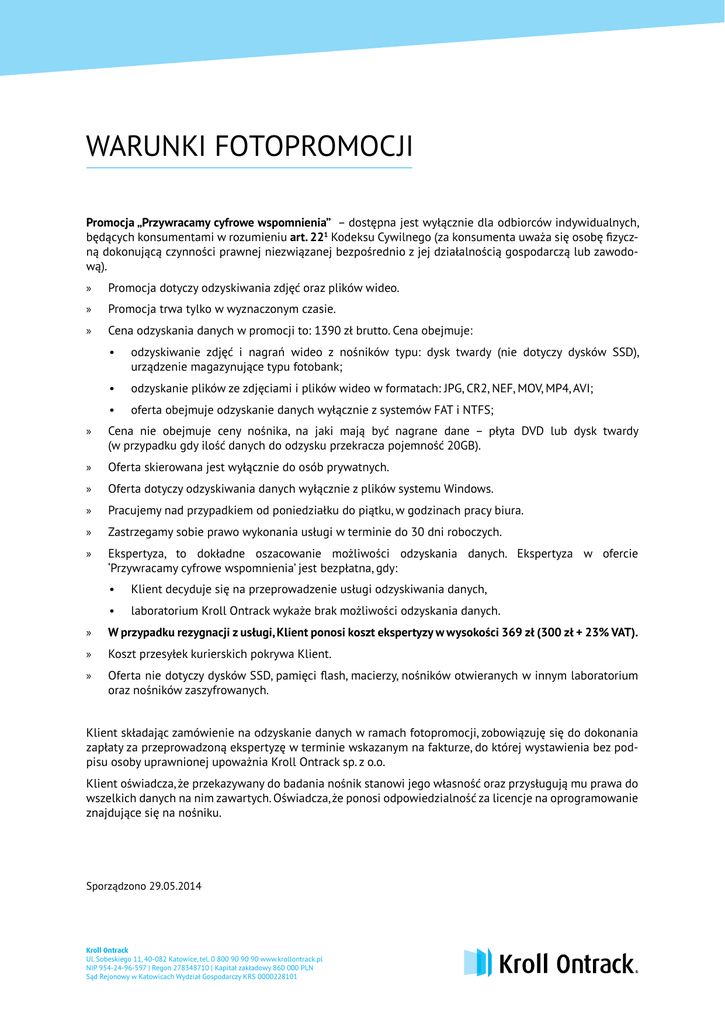 WARUNKI FOTOPROMOCJI Promocja „Przywracamy cyfrowe wspomnienia” – dostępna jest wyłącznie dla odbiorców indywidualnych, będących konsumentami w rozumieniu art. 221 Kodeksu Cywilnego (za konsumenta uważa się osobę fizyczną dokonującą czynności prawnej niezwiązanej bezpośrednio z jej działalnością gospodarczą lub zawodową). »» Promocja dotyczy odzyskiwania zdjęć oraz plików wideo. »» Promocja trwa tylko w wyznaczonym czasie. »» Cena odzyskania danych w promocji to: 1390 zł brutto. Cena obejmuje: • odzyskiwanie zdjęć i nagrań wideo z nośników typu: dysk twardy (nie dotyczy dysków SSD), urządzenie magazynujące typu fotobank; • odzyskanie plików ze zdjęciami i plików wideo w formatach: JPG, CR2, NEF, MOV, MP4, AVI; • oferta obejmuje odzyskanie danych wyłącznie z systemów FAT i NTFS; »» Cena nie obejmuje ceny nośnika, na jaki mają być nagrane dane – płyta DVD lub dysk twardy (w przypadku gdy ilość danych do odzysku przekracza pojemność 20GB). »» Oferta skierowana jest wyłącznie do osób prywatnych. »» Oferta dotyczy odzyskiwania danych wyłącznie z plików systemu Windows. »» Pracujemy nad przypadkiem od poniedziałku do piątku, w godzinach pracy biura. »» Zastrzegamy sobie prawo wykonania usługi w terminie do 30 dni roboczych. »» Ekspertyza, to dokładne oszacowanie możliwości odzyskania danych. Ekspertyza w ofercie ‘Przywracamy cyfrowe wspomnienia’ jest bezpłatna, gdy: • Klient decyduje się na przeprowadzenie usługi odzyskiwania danych, • laboratorium Kroll Ontrack wykaże brak możliwości odzyskania danych. »» W przypadku rezygnacji z usługi, Klient ponosi koszt ekspertyzy w wysokości 369 zł (300 zł + 23% VAT). »» Koszt przesyłek kurierskich pokrywa Klient. »» Oferta nie dotyczy dysków SSD, pamięci flash, macierzy, nośników otwieranych w innym laboratorium oraz nośników zaszyfrowanych. Klient składając zamówienie na odzyskanie danych w ramach fotopromocji, zobowiązuję się do dokonania zapłaty za przeprowadzoną ekspertyzę w terminie wskazanym na fakturze, do której wystawienia bez podpisu osoby uprawnionej upoważnia Kroll Ontrack sp. z o.o. Klient oświadcza, że przekazywany do badania nośnik stanowi jego własność oraz przysługują mu prawa do wszelkich danych na nim zawartych. Oświadcza, że ponosi odpowiedzialność za licencje na oprogramowanie znajdujące się na nośniku. Sporządzono 29.05.2014 Kroll Ontrack Ul. Sobeskiego 11, 40-082 Katowice, tel. 0 800 90 90 90 www.krollontrack.pl NIP 954-24-96-597 | Regon 278348710 | Kapitał zakładowy 860 000 PLN Sąd Rejonowy w Katowicach Wydział Gospodarczy KRS 0000228101