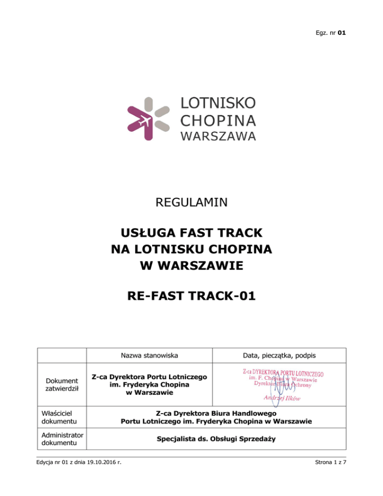 Egz. nr 01 REGULAMIN USŁUGA FAST TRACK NA LOTNISKU CHOPINA W WARSZAWIE RE-FAST TRACK-01 Nazwa stanowiska Dokument zatwierdził Właściciel dokumentu Data, pieczątka, podpis Z-ca Dyrektora Portu Lotniczego im. Fryderyka Chopina w Warszawie Z-ca Dyrektora Biura Handlowego Portu Lotniczego im. Fryderyka Chopina w Warszawie Administrator dokumentu Edycja nr 01 z dnia 19.10.2016 r. Specjalista ds. Obsługi Sprzedaży Strona 1 z 7 USŁUGA FAST TRACK NA LOTNISKU CHOPINA W WARSZAWIE RE-FAST TRACK-01 SPIS TREŚCI 1. CZĘŚĆ OGÓLNA 3 1.1. Cel i zakres stosowania dokumentu 3 1.2. Postanowienia ogólne 3 2. CZEŚĆ SZCZEGÓŁOWA 3 2.1. Osoby uprawnione do korzystania z usługi FAST TRACK 3 2.2. Zakup Vouchera 3 2.3. Zakup karty FAST TRACK 4 2.4. Rodzaje oraz zasady korzystania z kart FAST TRACK oraz Vouchera 5 2.5. Weryfikacja uprawnień do skorzystania z usługi Fast Track 5 2.6. Lokalizacja stanowisk dedykowanych usłudze Fast Track 6 3. DEFINICJE 6 3.1. Definicje 6 3.2. Skróty 7 4. WYKAZ DOKUMENTÓW ZWIĄZANYCH 7 5. WYKAZ UŻYTKOWNIKÓW DOKUMENTU 7 6. WYKAZ ZAŁĄCZNIKÓW 7 Edycja nr 01 z dnia 19.10.2016 r. Strona 2 z 7 USŁUGA FAST TRACK NA LOTNISKU CHOPINA W WARSZAWIE RE-FAST TRACK-01 1. CZĘŚĆ OGÓLNA 1.1. Cel i zakres stosowania dokumentu 1. Celem niniejszego Regulaminu jest opisanie zasad korzystania z usługi FAST TRACK przez pasażerów odlatujących z Lotniska Chopina w Warszawie. 1.2. Postanowienia ogólne 1. Niniejszy Regulamin obowiązuje od dnia 19 października 2016 roku. 2. Kolejne edycje z wprowadzanymi zmianami Regulaminu zamieszczane będą na stronie Lotniska Chopina w Warszawie w zakładce FAST TRACK. 3. Biuro Handlowe (OH) jako właściciel usługi FAST TRACK odpowiada za sprzedaż kart FAST TRACK, za tworzenie Polityki FAST TRACK wraz z cennikiem, dostarczanie Voucherów jednorazowych oraz opłaconych kart FAST TRACK do Biura Rzeczy Znalezionych oraz za rozpatrywanie skarg pasażerów. 4. Służba Zarządzania Ochroną (SZ) odpowiedzialna jest za poinformowanie podmiotu dokonującego kontroli dostępu i kontroli bezpieczeństwa o postanowieniach oraz zmianach do Regulaminu FAST TRACK po wcześniejszym powiadomieniu przez Biuro Handlowe (OH). 5. Dział Technologii i Jakości Obsługi Pasażerów (OLT) w ramach usługi FAST TRACK odpowiedzialny jest za wydawanie i sprzedaż Voucherów jednorazowych oraz wydawanie opłaconych kart FAST TRACK. 2. CZEŚĆ SZCZEGÓŁOWA 2.1. Osoby uprawnione do korzystania z usługi FAST TRACK 1. Osobami uprawnionymi do korzystania usługi FAST TRACK są pasażerowie odlatujący z Lotniska Chopina w Warszawie posiadający: jedną z kart FAST TRACK lub Voucher wydany przez Biuro Rzeczy Znalezionych. 2.2. Zakup Vouchera 1. Zakup Vouchera umożliwiającego skorzystanie z jednorazowego przejścia przez FAST TRACK, możliwy jest w Biurze Rzeczy Znalezionych, (od poniedziałku do piątku w godzinach 06:00-22:00 oraz z weekendy i święta w godzinach 6:00-18:00), zlokalizowanym w strefie CDE na poziomie odlotów Terminala A Lotniska Chopina w Warszawie. Edycja nr 01 z dnia 19.10.2016 r. Strona 3 z 7 USŁUGA FAST TRACK NA LOTNISKU CHOPINA W WARSZAWIE RE-FAST TRACK-01 2. Płatności można dokonać gotówką lub kartą płatniczą. 3. Voucher uprawnia do jednorazowego skorzystania z usługi FAST TRACK i nie podlega zwrotowi. 4. Voucher może być wykorzystany w innym dniu niż w dniu zakupu w Biurze Rzeczy Znalezionych. 2.3. Zakup karty FAST TRACK 1. W celu zamówienia karty uprawniającej do okresowego korzystania z usługi FAST TRACK, należy wypełnić formularz „Zamówienie imiennej karty FAST TRACK” (F01-FAST TRACK-01). 2. Wypełniony, podpisany i zeskanowany formularz należy przesłać na adres e-mail: [email protected]. 3. Na podstawie przesłanego formularza oraz informacji w nim zawartych, P.P. „Porty Lotnicze” wystawi fakturę na kwotę zgodną z Cennikiem. 4. Terminem spełnienia świadczenia jest dzień uznania rachunku bankowego PPL wymaganą należnością. 5. Odbiór karty będzie możliwy od dnia następującego po dniu, w którym wysłano potwierdzenie przygotowania karty. 6. Dzień przekazania karty Fast Track do odbioru jest równocześnie pierwszym dniem obowiązywania abonamentu, chyba że termin ten został ustalony z Zamawiającym indywidulanie. 7. Miejscem odbioru karty Fast Track jest Biuro Rzeczy Znalezionych, czynne codziennie (od poniedziałku do piątku w godzinach 06:00-22:00, w weekendy i święta w godzinach 06:00-18:00), zlokalizowane w strefie CDE na poziomie odlotów Terminala A Lotniska Chopina w Warszawie. 8. Możliwe jest również wysłanie karty FAST TRACK za pomocą poczty, w sytuacji otrzymania pisemnej prośby Zamawiającego w tym zakresie, z podaniem danych na jaki adres karta FAST TRACK ma zostać wysłana. Edycja nr 01 z dnia 19.10.2016 r. Strona 4 z 7 USŁUGA FAST TRACK NA LOTNISKU CHOPINA W WARSZAWIE RE-FAST TRACK-01 2.4. Rodzaje oraz zasady korzystania z kart FAST TRACK oraz Vouchera 1. Wyróżniamy 3 rodzaje Kart FAST TRACK: a) Karta Srebrna – uprawnia do korzystania z usługi FAST TRACK. Usługa ta jest dostępna dla posiadacza karty wraz z jednym towarzyszem podróży. b) Karta Złota – uprawnia do korzystania z usługi FAST TRACK oraz do korzystania z Salonu PRELUDIUM Executive Lounge wraz z jednym towarzyszem podróży. c) Karta Czarna – uprawnia do korzystania z usługi FAST TRACK oraz Salonu FANTAZJA Executive Lounge, PRELUDIUM Executive Lounge lub BOLERO Executive Lounge wraz z jednym towarzyszem podróży. 2. Wzory rodzajów ww. kart znajdują się w załączniku „Wzory rodzajów kart FAST TRACK” (Z01-RE-FAST TRACK-01). 3. W przypadku możliwości skorzystania z Salonów Executive Lounge, odbywa się ono zgodnie z „Zasadami korzystania z Salonów Executive Lounge na Lotnisku Chopina w Warszawie”, które dostępne są w recepcji Salonów Executive na Lotnisku Chopina w Warszawie oraz na stronie Lotniska Chopina. 4. Karty FAST TRACK mają charakter imienny. 5. Dzieci do u