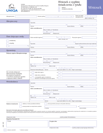 Wniosek o wyplate swiadczenia z tytulu UNIQA Towarzystwo Ubezpieczeñ na ¯ycie Spó³ka Akcyjna 90-520 £ódŸ, ul. Gdañska 132 tel. (42) 63 44 700, fax (42) 63 65 003 S¹d Rejonowy dla £odzi-Œródmieœcia w £odzi KRS 0000005751 * Numer polisy Ubezpieczenie Wniosek zgonu urodzenia dziecka / Data pocz¹tku ubezpieczenia - dzieñ, miesi¹c, rok Ubezpieczony Nazwisko Imiona Numer klienta PESEL Adres zameldowania Ulica, nr domu, nr mieszkania Kod pocztowy Dane dotyczace osoby Miejscowoœæ * Data narodzin/zgonu/ Przyczyna zgonu dzieñ, miesi¹c, rok urodzonej zmar³ej Nazwisko Stopieñ pokrewieñstwa lub wiêzi rodzinnej * Imiona Uprawniony Numer klienta PESEL Numer klienta PESEL Nazwisko Dotyczy zgonu Ubezpieczonego Imiona Adres zameldowania Ulica, nr domu, nr mieszkania Kod pocztowy Miejscowoœæ 0Telefon, fax Adres e-mail Dokument identyfikacyjny Do wniosku do³¹czam dokumentacjê niezbêdn¹ do ustalenia zasadnoœci i wysokoœci œwiadczeñ zgodnie z zapisami OWU i OWUD Wnioskodawca Data wyd. (dzieñ, m-c, rok) Organ wystawiaj¹cy Numer 1. odpis aktu zgonu 4. 2. odpis aktu urodzenia 5. 3. w przypadku zgonu œwiadectwo lekarskie stwierdzaj¹ce przyczynê zgonu 6. Nazwisko Imiona PESEL Numer klienta Adres zameldowania Ulica, nr domu, nr mieszkania Kod pocztowy Miejscowoœæ 0Telefon, fax Adres e-mail Data wyd. (dzieñ, m-c, rok) Organ wystawiaj¹cy Numer Nale¿ne œwiadczenie odbiorê w kasie przedstawicielstwa proszê przes³aæ poczt¹ na mój adres domowy proszê przelaæ na moje konto osobiste w nr konta nazwa banku Naruszenie obowi¹zku zg³oszenia prawid³owych danych Oœwiadczam, ¿e jako Wnioskodawca udzieli³em/am odpowiedzi na pytania zawarte we wniosku zgodnie z prawd¹ i wyczerpuj¹co. Jednoczeœnie przyjmujê do wiadomoœci, ¿e œwiadome podanie informacji niezgodnych z prawd¹ lub zatajenie informacji stanowi naruszenie umowy ubezpieczenia i mo¿e skutkowaæ jej niewa¿noœci¹. miejscowoœæ, data czytelny podpis Wnioskodawcy Wype³nia Poœrednik TU Uwagi UNI - S01 Przyjêto dnia miejscowoœæ, data w³aœciwe zakreœliæ * w³aœciwe wpisaæ czytelny podpis przyjmuj¹cego dokumenty Wypelnia osoba potwierdzajaca ubezpieczenie Potwierdza siê, ¿e / Nazwisko, imiê - Nr polisy PESEL jest objêty ubezpieczeniem nazwa ubezpieczenia wraz z ryzykiem dodatkowym Pocz¹tek odpowiedzialnoœci wobec Ubezpieczonego dzieñ miesi¹c (s³ownie) Suma ubezpieczenia z³ Sk³adka z³ czêstotliwoœæ wp³aty Czy w chwili zajœcia zdarzenia ubezpieczeniowego obowi¹zywa³a karencja? rok tak nie tak nie s³ownie z³otych Ostatni¹ sk³adkê op³acono dnia za dzieñ miesi¹c (s³ownie) rok Uwagi W przypadku nieterminowych lub nieregularnych wp³at - nale¿y za³¹czyæ wykaz zawieraj¹cy daty, wysokoœci i sposoby dokonania wp³at. miejscowoœæ, data podpis osoby potwierdzaj¹cej ubezpieczenie Wypelnia Towarzystwo Ubezpieczen Numer roszczenia w Przedstawicielstwie Czy w umowie ubezpieczenia maj¹ zastosowanie szczególne warunki ubezpieczenia? tak nie Czy w chwili zajœcia zdarzenia ubezpieczeniowego istnia³a odpowiedzialnoœæ wobec Ubezpieczonego? Na podstawie niniejszego zg³oszenia stwierdza siê, ¿e: * Œwiadczenie z tytu³u urodzenia/zgonu/ OWU mo¿e byæ wyp³acone na podstawie paragrafu OWUD Suma ubezpieczenia X Kwota nale¿nego œwiadczenia z³ % s³ownie z³otych Roszczenie o wyp³atê œwiadczenia kwalifikuje siê do odmowy z powodu Sporz¹dzi³ dnia dzieñ, miesi¹c, rok pieczêæ i podpis dzieñ, miesi¹c, rok pieczêæ i podpis Sprawdzi³ dnia Zatwierdzi³ kwotê do wyp³aty z³ dnia dzieñ, miesi¹c, rok s³ownie z³otych w³aœciwe zakreœliæ pieczêæ i podpis * w³aœciwe wpisaæ