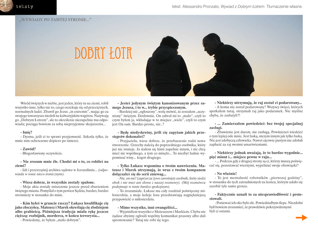 tekst: Alessandro Pronzato, Wywiad z Dobrym Łotrem. Tłumaczenie własne. teksty „WYWIADY PO TAMTEJ STRONIE...” DOBRY ŁOTR Wśród świętych w niebie, jest jeden, który tu na ziemi, robił wszystko inne, tylko nie to, czego oczekuje się od przeciętnych, normalnych ludzi. Zbawił go Jezus „in extremis”, mając go za swojego towarzysza niedoli na kalwaryjskim wzgórzu. Nazywają go „Dobrym Łotrem”, ale to określenie niezupełnie mu odpowiada; pociąga bowiem za sobą nieprzyjemne skojarzenia... - Jesteś jedynym świętym kanonizowanym przez samego Jezusa, i to w... trybie przyspieszonym. - Bardziej niż „ogłoszony”, wolę mówić, że zostałem „uczyniony” świętym. Dosłownie. On zabrał mi to „mało”, czyli to czym byłem ja, wkładając w to miejsce „wiele”, czyli to czym jest On sam. Bardzo proste, nie..? - Imię? - Dyzma, jeśli ci to sprawi przyjemność. Szkoda tylko, że mnie nim ochrzczono dopiero po śmierci. - Będę niedyskretny, jeśli cię zapytam jakich przestępstw dokonałeś? - Przyjacielu, wiesz dobrze, że przebaczenie rodzi nowe stworzenie. Grzechy należą do poprzedniego osobnika, który już nie istnieje. Ja stałem się kimś zupełnie innym, i nic chcę mieć nic wspólnego, a tym co minęło... To niezbyt ładnie wypominać winy... kogoś drugiego. - Zawód? - Błogosławiony oczywiście. - Nie zrozum mnie źle. Chodzi mi o to, co robiłeś na ziemi? - Idź i przetrząśnij archiwa sądowe w Jerozolimie... (odpowiada w tonie nieco ironicznym). - Wiesz dobrze, że wszystkie zostały spalone. - Moje akta zostały zniszczone jeszcze przed zburzeniem świętego miasta. Pomyślał o tym pewien Sędzia, bardzo, bardzo stronniczy w stosunku do mnie. - Kim byłeś w gruncie rzeczy? Łukasz kwalifikuje cię jako złoczyńcę. Mateusz i Marek określają cię złodziejem albo grabieżcą. Późniejsza tradycja miała rękę jeszcze cięższą: rozbójnik, morderca, w końcu terrorysta... - Powiedzmy, że byłem „mało dobrym”. - Tylko Łukasz wspomina o twoim nawróceniu. Mateusz i Marek utrzymują, że wraz z twoim kompanem dołączałeś się do serii zniewag... - Nie, on nie! (zaprzecza żywo zarośnięty osobnik, który siedzi obok i nie traci ani słowa z naszej rozmowy). (Mój rozmówca podejmuje w tonie bardzo spokojnym). - To zrozumiałe. Łukasz ma cały rozdział poświęcony miłosierdziu, a moje koleje losu przedstawiają najpiękniejszą przypowieść o miłosierdziu. - Mimo wszystko, inni ewangeliści... - Wyjaśniłem wszystko z Mateuszem i Markiem. Chyba nic żądasz abyśmy ogłosili wspólny komunikat prasowy albo dali sprostowanie? Tutaj nie robi się tego. - Niektórzy utrzymują, że raj został ci podarowany... - A komu nie został podarowany? Wszyscy święci, których spotkałem tutaj, otrzymali raj jako podarunek. Nie myślisz chyba, że zasłużyli?! - ... Zamierzałem powiedzieć: bez twojej specjalnej zasługi. - Zbawienie jest darem, nie zasługą. Powinieneś wiedzieć o tym lepiej ode mnie. Jest łaską, niczym innym jak tylko łaską. Nie jest zdobyczą człowieka. Nawet ojcowie pustyni nie zdołali zapłacić za raj swoimi umartwieniami. - Niektórzy jednak uważają, że to bardzo wygodnie... pięć minut i... miejsce pewne w raju... - ... Podczas gdy z drugiej strony są ci, którzy muszą poświęcać się, pozostawać wiernymi, wypełniać swoje obowiązki? - No właśnie! - To jest mentalność robotników „pierwszej godziny”, w stosunku do tych zatrudnionych na końcu, którym udało się zarobić tyle samo grosza. - Faktycznie uznali to za niesprawiedliwość i protestowali. - Ponieważ ich oko było złe. Powiedziałbym ślepe. Niezdolni byli bowiem zrozumieć, że prawdziwie pokrzywdzonymi byli ci ostatni. teksty tekst: Alessandro Pronzato, Wywiad z Dobrym Łotrem. Tłumaczenie własne. ponieważ chcą uniknąć nieprzyjemnych konsekwencji w wiecz- W jakim sensie? - Ponieważ byli pozbawieni radości bycia powołanymi ności... Ale gdyby nie ta myśl o piekle...?! prędzej. Nie dane im było pracować w pełnym wymiarze, - Wydaje mi się, że przesadzasz. w winnicy Pana. - Być może. W każdym razie ten tzw. „posłuszny” syn, nie - Problem jednak leży w zapłacie, w fakcie, że wszyscy zrozumiał właściwie nic. Nie znalazł radości w posłuszeństwie, w przeżywaniu przyjaźni ojca, w wypełnianiu jego woli. Potrzeoni otrzymali tę samą stawkę. - Właśnie w tym przejawia się ich zaślepienie. Zapłatę bował baranka, aby w gronie przyjaciół znaleźć wyrównanie, przesunęli na koniec pracy, zapominając, że jest nią już sama za swoje uciążliwe, synowskie świadczenia na rzecz ojca. Myślał, że jego młodszy brat przehulał swoje życie, podczas gdy możliwość pracy dla Pana, radość z Jego przyjaźni. on musiał giąć kark pod ciężarem pracy. I dlatego protestuje - Także i Piotr, jeśli jesteśmy już przy tym temacie, przeciwko uczcie... Jakiż przerażający błąd uważać, że grzech, że oddalenie od Ojca może być źródłem prawdziwego szczęścia. przykładał niemałą wagę do zapłaty. - Na miłość boską, nie ja jestem od dawania mu pouczeń, Wprost przeciwnie natomiast... jednak i on nie rozumiał, że pójście za Chrystusem stanowi już - Utrzymujesz więc, że owa uczta była rodzajem odnajwiększą zapłatę. szkodowania za straty poniesione przez to chłopaczysko, spowodowane smutkiem i upokorzeniem. - Widzę, że jesteś ekspertem w tej sprawie. - W pewnym sensie tak, bez wykluczenia jednak satysfakcji - To są sprawy bardzo proste. Weź dla przykładu przypadek starszego syna z przypowieści. Dla niego dom i praca to ojcowskiego „odnalezienia”. Pozostaje fakt, którego często wszystko. Polecam ci go, jeśli to jest prawdziwa wierność... nie bierzemy pod uwagę, że posłuszeństwo wobec woli BoWierność znoszona, odczuwana jako ciężar, jako uciążli- żej winno być motywem radości. Tak więc wierność widziana w perspe