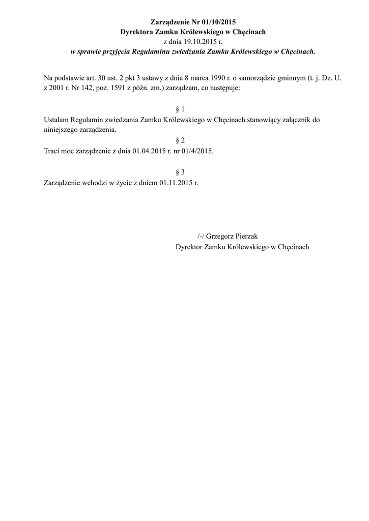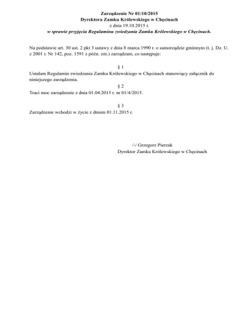 Zarządzenie Nr 01/10/2015 Dyrektora Zamku Królewskiego w Chęcinach z dnia 19.10.2015 r. w sprawie przyjęcia Regulaminu zwiedzania Zamku Królewskiego w Chęcinach. Na podstawie art. 30 ust. 2 pkt 3 ustawy z dnia 8 marca 1990 r. o samorządzie gminnym (t. j. Dz. U. z 2001 r. Nr 142, poz. 1591 z późn. zm.) zarządzam, co następuje: §1 Ustalam Regulamin zwiedzania Zamku Królewskiego w Chęcinach stanowiący załącznik do niniejszego zarządzenia. §2 Traci moc zarządzenie z dnia 01.04.2015 r. nr 01/4/2015. §3 Zarządzenie wchodzi w życie z dniem 01.11.2015 r. /-/ Grzegorz Pierzak Dyrektor Zamku Królewskiego w Chęcinach Załącznik do Zarządzenia Nr 01/10/2015 Dyrektora Zamku Królewskiego w Chęcinach z dnia 19.10.2015 Regulamin zwiedzania Zamku Królewskiego w Chęcinach §1 Teren, na którym znajduje się Zamek Królewski, jest własnością Gminy Chęciny przekazaną w trwały zarząd jednostce Zamek Królewski w Chęcinach i z tego tytułu Jednostka jest uprawniona do zarządzania tym terenem. §2 Osoby znajdujące się na terenie Zamku Królewskiego są zobowiązane do przestrzegania postanowień niniejszego Regulaminu. §3 1. Zamek Królewski udostępniany jest zwiedzającym w następujących godzinach: 1) styczeń – luty : codziennie od 9:00 do 15:00 2) marzec: codziennie od 9:00 do 16:00 3) kwiecień: codziennie 9:00 do 18:00 4) maj- czerwiec: codziennie od 9:00 do 19:00 5) lipiec-sierpień: codziennie od 9:00 do 20:00 6) wrzesień: codziennie od 9:00 do 19:00 7) październik: codziennie od 9:00 do 17:00 8) listopad - grudzień: codziennie od 9:00 do 15:00 2. Zamek nie będzie otwarty w następujące dni: 01 stycznia, Niedzielę Wielkanocną, 01 listopada, od 24 do 31 grudnia. 3. W przypadku niekorzystnych warunków atmosferycznych (np. śnieg, oblodzenie itp.) Zarządzający zastrzega sobie zmianę godzin udostępniania obiektu, o których mowa w ust. 1 §4 Bez uzyskania zezwolenia Dyrektora Zamku Królewskiego w Chęcinach na terenie Zamku Królewskiego zakazuje się: 1) prowadzenia działalności artystycznej, gospodarczej i handlowej (w tym akwizycji usług), 2) wykonywania filmów i fotografii przedstawiających architekturę Zamku Królewskiego w celach komercyjnych, 3) organizowania zgromadzeń, akcji reklamowych, protestacyjnych, prezentacji transparentów, symboli i emblematów, 4) wstępu osobom poniżej 15 roku życia bez opieki osoby dorosłej. §5 Na terenie Zamku Królewskiego zabrania się: 1) wnoszenia broni, przedmiotów i środków, mogących zagrażać życiu lub zdrowiu, 2) wprowadzania i wnoszenia zwierząt z wyłączeniem psów – przewodników, 3) wchodzenia na mury, baszty oraz inne miejsca wyłączone z ruchu turystycznego, 4) spożywania alkoholu na terenie obiektu oraz zwiedzania po spożyciu alkoholu, narkotyków lub innych środków odurzających, 5) hałaśliwego zachowania, biegania, 6) palenia tytoniu, 7) wchodzenia na wieże w czasie burzy. §6 1. Zwiedzanie Zamku Królewskiego odbywa się na podstawie ważnego biletu wstępu. 2. Zakup biletu wstępu jest równoznaczny z akceptacją niniejszego regulaminu. 3. Sprzedaż biletów prowadzona jest w kasach biletowych 4. Na podstawie paragonu, wydanego przy zakupie biletu wstępu zwiedzający, w terminie 7 dni od daty jego pobrania, może zażądać wystawienia faktury VAT. 5. Zwiedzający mają obowiązek opuścić zamek w ciągu 30 minut po zamknięcia obiektu. §7 W zakresie bezpieczeństwa i porządku na Zamku Królewskim zwiedzający są zobowiązani do stosowania się do poleceń pracowników i innych przedstawicieli Zarządzającego. §8 Naruszenie postanowień niniejszego Regulaminu skutkuje odpowiedzialnością odszkodowawczą. §9 Regulamin obowiązuje od dnia 01.11.2015 r.