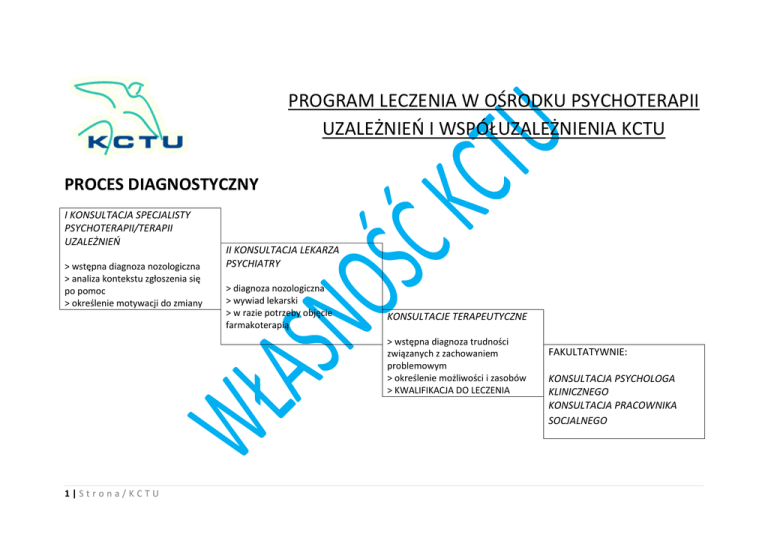 PROGRAM LECZENIA W OŚRODKU PSYCHOTERAPII UZALEŻNIEŃ I WSPÓŁUZALEŻNIENIA KCTU PROCES DIAGNOSTYCZNY I KONSULTACJA SPECJALISTY PSYCHOTERAPII/TERAPII UZALEŻNIEŃ > wstępna diagnoza nozologiczna > analiza kontekstu zgłoszenia się po pomoc > określenie motywacji do zmiany II KONSULTACJA LEKARZA PSYCHIATRY > diagnoza nozologiczna > wywiad lekarski > w razie potrzeby objęcie farmakoterapią KONSULTACJE TERAPEUTYCZNE > wstępna diagnoza trudności związanych z zachowaniem problemowym > określenie możliwości i zasobów > KWALIFIKACJA DO LECZENIA 1|Strona/KCTU FAKULTATYWNIE: KONSULTACJA PSYCHOLOGA KLINICZNEGO KONSULTACJA PRACOWNIKA SOCJALNEGO PROGRAM PODSTAWOWY TERAPII DLA OSÓB UZALEŻNIONYCH PSYCHOTERAPIA INDYWIDUALNA - wzmacnianie motywacji do zmiany - pogłębienie diagnozy zasobów i trudności - praca nad radzeniem sobie z bieżącym kryzysem - nawiązanie relacji terapeutycznej - określenie indywidualnych celów terapeutycznych - ustalenie indywidulanego planu terapii PSYCHOTERAPIA GRUPOWA GRUPA EDUKACYJNOMOTYWACYJNA (6 spotkań, 2 razy w tygodniu x 2 sesje) GRUPA WSPARCIA - wzmacnianie motywacji do zmiany - praca nad świadomością problemu - praca nad rozwijaniem umiejętności utrzymywania abstynencji (6 miesięcy, raz w tygodniu x 2 sesje) GRUPA PSYCHOEDUKACYJNA (12 spotkań, raz w tygodniu x 2 sesje) - zdobycie wiedzy z zakresu uzależnień - analiza siebie i swojej sytuacji w odniesieniu do w/w wiedzy - praca nad rozwijaniem umiejętności utrzymywania abstynencji 2|Strona/KCTU GRUPA UMIEJĘTNOŚCI SŁUŻĄCYCH ZDROWIENIU * trening radzenia sobie z głodem (4 spotkania, raz w tygodniu x 2 sesje) * trening radzenia sobie ze złością (4 spotkania, raz w tygodniu x 2 sesje) *trening komunikowania się (3 spotkania, raz w tygodniu x 2 sesje) - praca nad motywacją do leczenia poprzez znajdowanie indywidualnych korzyści z niego wynikających - zdobywanie umiejętności i wiedzy wzmacniających utrzymanie abstynencji - praca nad indywidualnymi problemami związanymi z uzależnieniem, innymi chorobami, sytuacją bytowo - materialnej PROGRAM POGŁĘBIONY TERAPII DLA OSÓB UZALEŻNIONYCH PSYCHOTERAPIA INDYWIDUALNA - utrwalenie wprowadzonych zmian - pogłębienie wiedzy na temat własnej choroby - analiza wpływu mechanizmów choroby na funkcjonowanie - praca korekcyjna w obszarach funkcjonowania uszkodzonych w wyniku choroby - możliwość wglądowej pracy terapeutycznej nad urazami i niekonstruktywnymi sposobami radzenia sobie w odniesieniu do historii życia PSYCHOTERAPIA GRUPOWA GRUPA WSPARCIA (6 miesięcy, raz w tygodniu x 2 sesje) GRUPA TERAPEUTYCZNA (12 miesięcy, raz na tydzień x 2 sesje) - wzmacnianie wprowadzonych zmian - zmiana funkcjonowania w obszarze uczuć, myśli i zachowania - analiza wpływu mechanizmów choroby na funkcjonowanie GRUPA PRACY NAD UCZUCIAMI (8 spotkań, raz w tygodniu x 2 sesje) - nauka rozpoznawania i konstruktywnego wyrażania uczuć TRENING ZAPOBIEGANIA NAWROTOM (maratonowo) - zdobycie wiedzy na temat procesu nawrotu - tworzenie indywidualnego planu zapobiegawczego GRUPA PSYCHOTERAPEUTYCZNA (ok.12 miesięcy, raz na tydzień x 3 sesje) - praca terapeutyczna nad urazami i niekonstruktywnymi sposobami radzenia sobie w odniesieniu do historii życia 3|Strona/KCTU - praca nad motywacją do leczenia poprzez znajdowanie indywidualnych korzyści z niego wynikających - zdobywanie umiejętności i wiedzy wzmacniających utrzymanie abstynencji - praca nad indywidualnymi problemami związanymi z uzależnieniem, innymi chorobami, sytuacją bytowo - materialnej PROGRAM PODSTAWOWY TERAPII DLA OSÓB WSPÓŁUZALEŻNIONYCH PSYCHOTERAPIA INDYWIDUALNA - wzmacnianie motywacji do zmiany - praca nad radzeniem sobie z przeżywanymi trudnościami - pogłębienie diagnozy zasobów i trudności - nawiązanie relacji terapeutycznej - określenie indywidualnych celów terapeutycznych - ustalenie indywidulanego planu terapii PSYCHOTERAPIA GRUPOWA GRUPA PSYCHOEDUKACYJNA GRUPA PSYCHOEDUKACYJNA DLA OSÓB DOŚWIADCZAJĄCYCH PRZEMOCY (10 spotkań, raz w tygodniu x 3 sesje) - zdobycie wiedzy z zakresu uzależnień (objawy, mechanizmy, wpływ na otoczenie, współuzależnienie) - analiza siebie i swojej sytuacji w odniesieniu do w/w wiedzy - autodiagnoza cech współuzależnienia (12 spotkań, raz w tygodniu x 3 sesje) - zdobycie wiedzy z zakresu przemocy (cechy, rodzaje, cykl przemocy, konsekwencje) - zapoznanie z podstawowymi sposobami przeciwstawiania się - analiza siebie i swojej sytuacji w odniesieniu do w/w wiedzy GRUPA TRENINGOWA (15 spotkań w 3 blokach tematycznych, raz w tygodniu x 3 sesje) - pogłębienie autodiagnozy cech współuzależnienia - uświadomienie sobie psychologicznych konsekwencji współuzależnienia - rozwijanie konstruktywnych zachowań: komunikacja, asertywność, myślenie pozytywne, identyfikacja i wyrażanie własnych uczuć i potrzeb 4|Strona/KCTU PROGRAM POGŁĘBIONY TERAPII DLA OSÓB WSPÓŁUZALEŻNIONYCH PSYCHOTERAPIA INDYWIDUALNA - pogłębienie wiedzy na temat współuzaleznienia i rozumienia siebie w tym kontekście - praca nad konstruktywnym radzeniem sobie z uczuciami i potrzebami – rozpoznawanie, wyrażanie i zaspokajanie ich - rozwijanie umiejętności realizowania ról i zadań życiowych sposób konstruktywny i odpowiedzialny - możliwość wglądowej pracy terapeutycznej nad urazami i niekonstruktywnymi sposobami radzenia sobie w odniesieniu do historii życia PSYCHOTERAPIA GRUPOWA GRUPA TERAPEUTYCZNA (12 miesięcy, raz w tygodniu x 3 sesje) - wzmacnianie wprowadzonych zmian - zmiana funkcjonowania w obszarze uczuć, myśli i zachowania - rozwijanie samoświadomości GRUPA PRACY NAD UCZUCIAMI (8 spotkań, raz w tygodniu x 2 sesje) - nauka rozpoznawania i konstruktywnego wyrażania uczuć GRUPA PSYCHOTERAPEUTYCZNA (ok.12 miesięcy, raz na tydzień x 3 sesje) - praca terapeutyczna nad urazami i niekonstruktywnymi sposobami radzenia sobie w odniesieniu do historii życia 5|Strona/KCTU