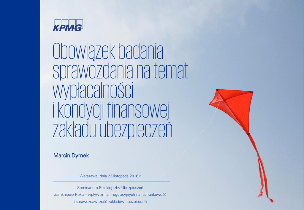 Obowiązek badania sprawozdania na temat wypłacalności i kondycji finansowej zakładu ubezpieczeń Marcin Dymek Warszawa, dnia 22 listopada 2016 r. Seminarium Polskiej Izby Ubezpieczeń Zamknięcie Roku – wpływ zmian regulacyjnych na rachunkowość i sprawozdawczość zakładów ubezpieczeń Obowiązek badania sprawozdania na temat wypłacalności i kondycji finansowej zakładu ubezpieczeń Agenda SFCR Ustawa Projekt Rozporządzenia Kolejne kroki Agenda Sprawozdanie na temat wypłacalności i kondycji finansowej zakładu ubezpieczeń i zakładu reasekuracji („SFCR”) – wybrane zagadnienia Ustawa o działalności ubezpieczeniowej i reasekuracyjnej z dnia 11 września 2015 r. („Ustawa”) – wymogi badania, kryterium istotności Projekt z dnia 16 września 2016 r. rozporządzenia w sprawie badania SFCR przez podmiot uprawniony do badania sprawozdań finansowych („Projekt Rozporządzenia”) – kluczowe zagadnienia Zmiany w ustawodawstwie dotyczącym usług poświadczających Terminy ujawniania SFCR © 2016 KPMG Audyt Sp. z o.o. sp. k. jest polską spółką z ograniczoną odpowiedzialnością i członkiem sieci KPMG składającej się z niezależnych spółek członkowskich stowarzyszonych z KPMG International Cooperative (“KPMG International”), podmiotem prawa szwajcarskiego. Wszelkie prawa zastrzeżone. 1 Obowiązek badania sprawozdania na temat wypłacalności i kondycji finansowej zakładu ubezpieczeń Agenda SFCR Ustawa Projekt Rozporządzenia Kolejne kroki SFCR – wybrane zagadnienia Obowiązek ujawniania SFCR: • SFCR jednostkowy – art. 284 ust. 1 Ustawy • SFCR grupowy – art. 412 Ustawy Elementy i zakres SFCR • Art. 335 ust. 9 i 10 Ustawy • Załącznik XX do Rozporządzenia delegowanego Komisji (UE) 2015/35 z dnia 10 października 2014 r. uzupełniającego Dyrektywę Parlamentu Europejskiego i Rady 2009/138/WE w sprawie podejmowania i prowadzenia działalności ubezpieczeniowej i reasekuracyjnej (Wypłacalność II) Wymóg zatwierdzenia przez Radę Nadzorczą („RN”) przed publikacją • Art. 289 ust. 2 Ustawy © 2016 KPMG Audyt Sp. z o.o. sp. k. jest polską spółką z ograniczoną odpowiedzialnością i członkiem sieci KPMG składającej się z niezależnych spółek członkowskich stowarzyszonych z KPMG International Cooperative (“KPMG International”), podmiotem prawa szwajcarskiego. Wszelkie prawa zastrzeżone. 2 Obowiązek badania sprawozdania na temat wypłacalności i kondycji finansowej zakładu ubezpieczeń Agenda SFCR Ustawa Projekt Rozporządzenia Kolejne kroki SFCR – wybrane zagadnienia Kryterium istotności – art. 291 Rozporządzenia delegowanego UE „[…] informacje, które podlegają ujawnieniu w SFCR, uznaje się za istotne, jeżeli ich pominięcie lub zniekształcenie może wpłynąć na proces decyzyjny lub ocenę użytkowników tego dokumentu, w tym organów nadzoru” Brak jest określonego w przepisach prawa sposobu wyznaczania poziomu istotności. Poziom istotności może być ustalany w oparciu o jedną z miar (jako pewien % tej miary), która najbardziej charakteryzuje dany zakład ubezpieczeń oraz która najbardziej wpływa na decyzje ekonomiczne użytkowników SCFR – przykładowo: • Suma aktywów, • Środki własne, • Nadwyżka aktywów nad zobowiązaniami. Inną możliwością jest wykorzystanie metodologii wyznaczania poziomu istotności opracowanej przez audyt wewnętrzny. © 2016 KPMG Audyt Sp. z o.o. sp. k. jest polską spółką z ograniczoną odpowiedzialnością i członkiem sieci KPMG składającej się z niezależnych spółek członkowskich stowarzyszonych z KPMG International Cooperative (“KPMG International”), podmiotem prawa szwajcarskiego. Wszelkie prawa zastrzeżone. 3 Obowiązek badania sprawozdania na temat wypłacalności i kondycji finansowej zakładu ubezpieczeń Agenda SFCR za 2016 r. – kluczowe kamienie milowe w 2017 r. SFCR Publikacja SFCR do 20/05/2017 (sobota) Badanie SFCR Badanie grupowego SFCR Ustawa Marzec 2017 Kwiecień 2017 Maj 2017 Czerwiec 2017 Projekt Rozporządzenia Kolejne kroki Zatwierdzenie SFCR przez RN Zatwierdzenie grupowego SFCR przez RN Publikacja grupowego SFCR do 01/07/2017 (sobota) © 2016 KPMG Audyt Sp. z o.o. sp. k. jest polską spółką z ograniczoną odpowiedzialnością i członkiem sieci KPMG składającej się z niezależnych spółek członkowskich stowarzyszonych z KPMG International Cooperative (“KPMG International”), podmiotem prawa szwajcarskiego. Wszelkie prawa zastrzeżone. 4 Obowiązek badania sprawozdania na temat wypłacalności i kondycji finansowej zakładu ubezpieczeń Agenda SFCR Wymóg badania Obowiązek badania SFCR – art. 290 Ustawy Art. 290 ust. 1 SFCR podlega badaniu przez podmiot uprawniony do badania sprawozdań finansowych. Ustawa Projekt Rozporządzenia Kolejne kroki Art. 290 ust. 2 Celem badania SFCR jest wyrażenie przez biegłego rewidenta pisemnej opinii wraz z raportem, o tym czy SFCR jest sporządzone zgodnie z obowiązującymi przepisami, w szczególności dotyczącymi: a) ujmowania i wyceny aktywów dla celów wypłacalności, b) ujmowania i wyceny zobowiązań dla celów wypłacalności innych niż rezerwy techniczno-ubezpieczeniowe dla celów wypłacalności, c) ustalania wartości rezerw techniczno-ubezpieczeniowych dla celów wypłacalności, d) wymogów kapitałowych, e) jakości i wysokości dopuszczonych środków własnych. © 2016 KPMG Audyt Sp. z o.o. sp. k. jest polską spółką z ograniczoną odpowiedzialnością i członkiem sieci KPMG składającej się z niezależnych spółek członkowskich stowarzyszonych z KPMG International Cooperative (“KPMG International”), podmiotem prawa szwajcarskiego. Wszelkie prawa zastrzeżone. 5 Obowiązek badania sprawozdania na temat wypłacalności i kondycji finansowej zakładu ubezpieczeń Agenda SFCR Wymóg badania Obowiązek badania SFCR – art. 290 Ustawy Art. 290 ust. 3 Opinia wraz z raportem jest publikowana razem z SFCR. Ustawa Projekt Rozporzą