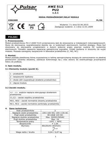 AWZ 512 PU2 v.2.1 MODUŁ PRZEKAŹNIKOWY/RELAY MODULE 03062009 PL/EN Wydanie: 3 z dnia 02.06.2010 Zastępuje wydanie: 2 z dnia 12.01.2009 POLSKI 1. Przeznaczenie. Moduł przekaźnikowy PU-2 (AWZ 512) przeznaczony jest do stosowania w instalacjach niskonapięciowych. Służy do sterowania, sygnalizowania stanów np. w systemach alarmowych, kontroli dostępu. Może być stosowany do sterowania urządzeniami o dużym poborze prądu poprzez wyjścia OC systemów alarmowych. Ponadto zapewnia separację galwaniczną sygnałów, źródeł zasilania w stosunku do wyjść modułu. Posiada szeregowy bezpiecznik w obwodzie przekaźnika (C, NO, NC). 2. Montaż. Moduł posiada plastikową listwę wyposażoną w taśmę samoprzylepną służącą do zamocowania na płaskiej powierzchni (ścianka obudowy, zasilacza buforowego itp.) oraz otwory do ewentualnego przykręcenia listwy do podłoża. 3. Opis modułu. 3.1 Elementy modułu (punkt 6). 1 - przekaźnik 2 - bezpiecznik topikowy 3 - dioda LED (sygnalizuje działanie przekaźnika) 4 - złącza modułu 3.2 Zaciski modułu. +/- -/+ wejścia napięcia sterującego działaniem przekaźnika C1,C2 – zacisk wspólny przekaźnika NO1, NO2 - zacisk normalnie otwarty przekaźnika NC1, NC2 - zacisk normalnie zamknięty przekaźnika 4. Dane techniczne. Ilość przekaźników Napięcie cewki przekaźnika Prąd cewki przekaźnika Napięcie styków przekaźnika Prąd styków przekaźnika Temperatura pracy Bezpieczniki Wymiary 2 10V÷16V DC/ 10V÷13V AC 30 mA@ 12V DC Max. 30VDC/50VAC Max. 1A -10ºC ÷ 40ºC F 1,5A 80x20x43 (WxHxD) H W D Waga netto / brutto 0,04 / 0,07 kg 1 ENGLISH 1. Destination. The relay module PU-2 (AWZ 512) is designed for used in low-voltage circuits. They are intended for indicating status, i. e. in alarm and access control systems. The module can be used to control devices which draw large currents through OC outputs of alarm systems. They also ensure full galvanic separation of signals, power supply sources from outputs module. The module is fitted with serial fuses in the output circuits (C, NO, NC). 2. Mounting. The module is fixed with plastic bar with holes and adhesive tape for plain surface (metal casing, buffer power supplies etc.) 3. Module description. 3.1 Module elements (point 6). 1 – relay 2 – fuse 3 - LED (indicates relay operations) 4 - module terminals 3.2 Module terminals. +/- -/+ relay control voltage inputs C1,C2 - common relay terminal NO1,NO2 - normally open relay terminal NC1, NC2 - normally closed relay terminal 4. Technical data. Number of relays Voltage of relay coil Current of relay coil Voltage of relay contacts Current of relay contacts Operating temperature Fuses Dimensions 2 10V÷16V DC/ 10V÷13V AC 30 mA@ 12V DC Max. 30VDC/50VAC Max. 1A -10ºC ÷ 40ºC F 1,5A 80x20x43 (WxHxD) H W D Net / gross weight 0,04 / 0,07 kg 2 5. Schemat elektryczny / Electrical diagram. 6. Widok ogólny modułu / General view of the module. 2 2 3 3 L1 I1 L2 F1 I2 4 F2 4 3 OGÓLNE WARUNKI GWARANCJI 1. Pulsar K. Bogusz Sp.j. (producent) udziela dwuletniej gwarancji jakości na urządzenia, począwszy od daty nabycia zamieszczonej na dowodzie zakupu. 2. W przypadku braku dowodu zakupu przy zgłoszeniu reklamacji, trzyletni okres gwarancji jest liczony od daty produkcji urządzenia. 3. Gwarancja obejmuje nieodpłatną naprawę lub wymianę na odpowiednik funkcjonalny (wyboru dokonuje producent) niesprawnego urządzenia z przyczyn zależnych od producenta, w tym wad produkcyjnych i materiałowych, o ile wady zostały zgłoszone w okresie gwarancji (pkt.1 i 2). 4. Podlegający gwarancji sprzęt należy dostarczyć do punktu, w którym został on zakupiony lub bezpośrednio do siedziby producenta. 5. Gwarancją objęte są urządzenia kompletne z pisemnie określonym rodzajem wady w poprawnie wypełnionym zgłoszeniu reklamacyjnym. 6. Producent, w razie uwzględnienia reklamacji, zobowiązuje się do dokonania napraw gwarancyjnych w możliwie najkrótszym terminie, nie dłuższym jednak niż 14 dni roboczych od daty dostarczenia urządzenia do serwisu producenta. 7. Okres naprawy z pkt.5 może być przedłużony w przypadku braku możliwości technicznych dokonania naprawy oraz w przypadku sprzętu przyjętego warunkowo do serwisu ze względu na niedopełnienie warunków gwarancji przez reklamującego. 8. Wszelkie usługi serwisowe wynikające z gwarancji dokonywane są wyłącznie w serwisie producenta. 9. Gwarancją nie są objęte wady urządzenia wynikłe z: - przyczyn niezależnych od producenta, - uszkodzeń mechanicznych, - nieprawidłowego przechowywania i transportu, - użytkowania niezgodnego z zaleceniami instrukcji obsługi lub przeznaczeniem urządzenia, - zdarzeń losowych, w tym wyładowań atmosferycznych, awarii sieci energetycznej, pożaru, zalania, działania wysokich temperatur i czynników chemicznych, - niewłaściwej instalacji i konfiguracji (niezgodnej z zasadami zawartymi w instrukcji), 10. Utratę uprawnień wynikających z gwarancji w każdym wypadku powoduje stwierdzenie dokonania zmian konstrukcyjnych lub napraw poza serwisem producenta lub, gdy w urządzeniu w jakikolwiek sposób zmieniono lub uszkodzono numery seryjne lub nalepki gwarancyjne. 11. Odpowiedzialność producenta względem nabywcy ogranicza się do wartości urządzenia ustalonej według ceny hurtowej sugerowanej przez producenta z dnia zakupu. 12. Producent nie ponosi odpowiedzialności za szkody powstałe w wyniku uszkodzenia, wadliwego działania lub niemożliwości korzystania z urządzenia, w szczególności, jeśli wynika to z niedostosowania się do zaleceń i wymagań zawartych w instrukcji lub zastosowania urządzenia. OZNAKOWANIE WEEE Zużytego sprzętu elektrycznego i elektronicznego nie wolno wyrzucać razem ze zwykłymi domowymi odpadami. Według dyrektywy WEEE obowiązującej w UE dla zużytego sprzętu elektrycznego i elektronicznego należy stosować oddzielne sposoby utylizacji. W Polsce zgodnie z przepisami ustawy o zużytym sp