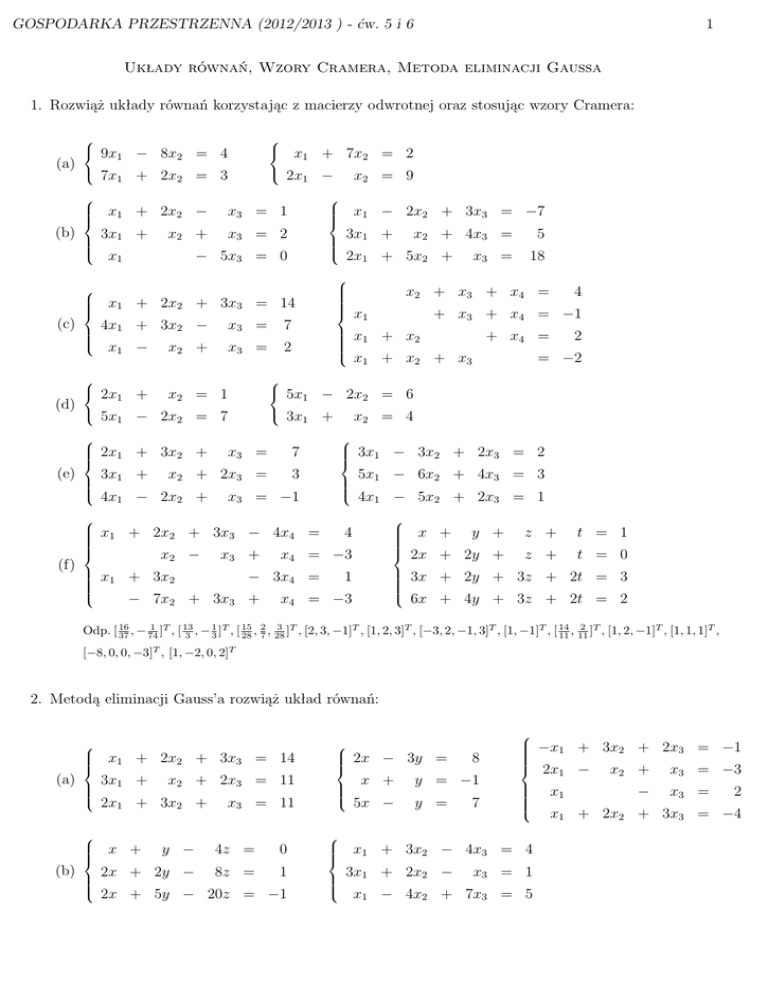 GOSPODARKA PRZESTRZENNA (2012/2013 ) - ćw. 5 i 6 1 Układy równań, Wzory Cramera, Metoda eliminacji Gaussa 1. Rozwiąż układy równań korzystając z macierzy odwrotnej oraz stosując wzory Cramera: 9x1 − 8x2 = 4 (a) 7x1 + 2x2 = 3 (b) (e) x3 = 1 x2 + x3 = 2 3x1 + − 5x3 = 0 x1 7 x3 = 2 x1 − 2x2 + 3x3 = −7 3x1 + x1 + x2 5x1 − 2x2 = 7 3x1 + 2x1 + 3x2 + 3 4x1 − 2x2 + x1 + 2x2 + 3x3 − 4x4 = x1 + 3x2 x2 − x3 + = −2 3x1 − 3x2 + 2x3 = 2 4x1 − 5x2 + 2x3 = 1 5x1 − 6x2 + 4x3 = 3 4 x4 = −3 − 3x4 = − 7x2 + 3x3 + 2 x2 = 4 x3 = −1 4 + x4 = x1 + x2 + x 3 5x1 − 2x2 = 6 x2 + 2x3 = 18 + x3 + x4 = −1 3x1 + x3 = x1 x2 = 1 7 5 x2 + x3 + x4 = 2x1 + x3 = x2 + 4x3 = 2x1 + 5x2 + x1 + 2x2 + 3x3 = 14 x3 = x2 = 9 (f) 2x1 − x1 + 2x2 − (c) 4x1 + 3x2 − x − x2 + 1 (d) x1 + 7x2 = 2 1 x4 = −3 x + y + z + t = 1 2x + 2y + z + t = 0 3x + 2y + 3z + 2t = 3 6x + 4y + 3z + 2t = 2 1 T 13 1 T 15 2 3 T 14 2 T T T T T T T Odp. [ 16 37 , − 74 ] , [ 3 , − 3 ] , [ 28 , 7 , 28 ] , [2, 3, −1] , [1, 2, 3] , [−3, 2, −1, 3] , [1, −1] , [ 11 , 11 ] , [1, 2, −1] , [1, 1, 1] , [−8, 0, 0, −3]T , [1, −2, 0, 2]T 2. Metodą eliminacji Gauss’a rozwiąż układ równań: (a) (b) x1 + 2x2 + 3x3 = 14 3x1 + x2 + 2x3 = 11 2x + 3x + x3 = 11 1 2 y − 4z = 0 2x + 2y − 8z = 1 x + 2x + 5y − 20z = −1 2x − 3y = x + 5x − 8 y = −1 y = 7 x1 + 3x2 − 4x3 = 4 3x1 + 2x2 − x3 = 1 x1 − 4x2 + 7x3 = 5 −x1 + 3x2 + 2x3 = −1 2x1 − x1 x2 + − x3 = −3 x3 = 2 x1 + 2x2 + 3x3 = −4 GOSPODARKA PRZESTRZENNA (2012/2013 ) - ćw. 5 i 6 (c) (d) (e) (f) x + y + z = −1 2x − y + z= 2 5x − y + 3z = 3 7x − 2y + 4z = 5 2x1 − x2 + 3x3 = 1 −x1 + x2 − 2x3 = 2 x1 x1 − 2x2 + 3x3 = −7 3x1 + x2 + 4x3 = 2x + 5x + x3 = 1 2 y + 4z = 3x + 2x + 5y + 2x1 + x2 − z = 18 x3 + 18 5 + 5 x − 2y + 3z = −7 x3 − x3 = 3 x + 5y = x − 2y + z + t= x − 2y + z − t = −1 x − 2y + z + 5t = 2 −3x + 6y = 15 x1 + 2x2 − 3x3 4x1 + 8x2 − 7x3 + x1 + 2x2 − −x1 + x4 = 1 x2 + 3x3 − 3x4 = 1 x1 + x2 + 2 x4 = 1 x3 + = 0 x4 = 1 x4 = 1 x2 + 4x3 + 6x4 = 0 x + 2y − z − 3x + 5y − z + x + t = 1 y + z + 3t = 2 t = 3 Odp. (a) [1, 2, 3]T , [1, −2]T , [0, 1, −2]T ; (b) sprzeczny, sprzeczny; (c) nieoznaczony, nieoznaczony, nieoznaczony (d) [2, 3, −1]T , [−3, 1]T ; (e) [2, 3, −1]T , [4, −2, 0, 1]T ; (f) nieoznaczony, sprzeczny 3. Sieć trzech sklepów handluje kalkulatorami typu A, B i C. Tabela zawiera liczbę sprzedanych kalkulatorów każdego typu oraz ogólny przychód każdego ze sklepów. Znaleźć cenę każdego typu kalkulatora. A B C Przychód Sklep 1 1 2 5 156,00 zł Sklep 2 2 4 8 294,00 zł Sklep 3 3 3 7 321,00 zł 4. Sklep oponiarski sprzedaje trzy typy opon: diagonalne, radialne i luksusowe radialne. Tabela podaje liczbę opon każdego typu sprzedanych w czwartek, piątek i sobotę i ogólny dochód ze sprzedaży danego dnia. Jaka jest cena poszczególnych typów opon? Diagonalne Radialne Luksusowe radialne Dochód Czwartek 10 6 8 1 342,00 zł Piątek 12 8 4 1 158,00 zł Sobota 20 10 8 1 879,00 zł 5. Ogród wymaga 4 kg azotu, 8 kg fosforu i 8 kg potasu. Ogrodnik dysponuje dwoma nawozami. Nawóz A zawiera 4% azotu, 12% fosforu i 12% potasu a nawóz B po 10% każdego z tych składników. Ile kilogramów każdego z nawozów należy rozsypać w ogrodzie? 1 5