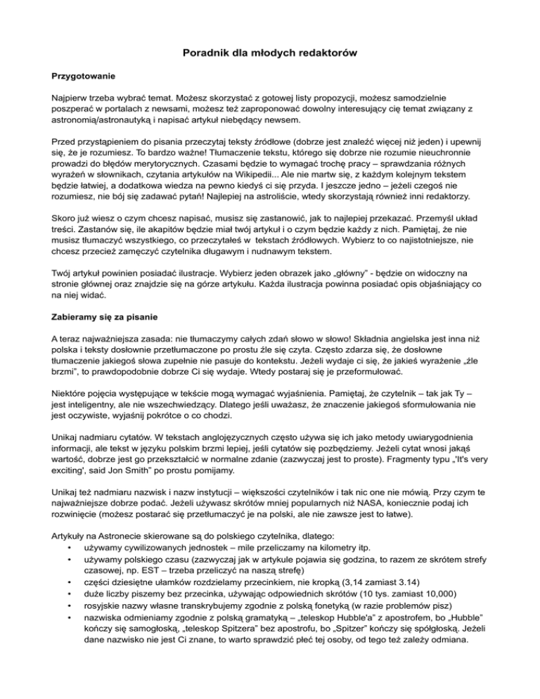 Poradnik dla młodych redaktorów Przygotowanie Najpierw trzeba wybrać temat. Możesz skorzystać z gotowej listy propozycji, możesz samodzielnie poszperać w portalach z newsami, możesz też zaproponować dowolny interesujący cię temat związany z astronomią/astronautyką i napisać artykuł niebędący newsem. Przed przystąpieniem do pisania przeczytaj teksty źródłowe (dobrze jest znaleźć więcej niż jeden) i upewnij się, że je rozumiesz. To bardzo ważne! Tłumaczenie tekstu, którego się dobrze nie rozumie nieuchronnie prowadzi do błędów merytorycznych. Czasami będzie to wymagać trochę pracy – sprawdzania różnych wyrażeń w słownikach, czytania artykułów na Wikipedii... Ale nie martw się, z każdym kolejnym tekstem będzie łatwiej, a dodatkowa wiedza na pewno kiedyś ci się przyda. I jeszcze jedno – jeżeli czegoś nie rozumiesz, nie bój się zadawać pytań! Najlepiej na astroliście, wtedy skorzystają również inni redaktorzy. Skoro już wiesz o czym chcesz napisać, musisz się zastanowić, jak to najlepiej przekazać. Przemyśl układ treści. Zastanów się, ile akapitów będzie miał twój artykuł i o czym będzie każdy z nich. Pamiętaj, że nie musisz tłumaczyć wszystkiego, co przeczytałeś w tekstach źródłowych. Wybierz to co najistotniejsze, nie chcesz przecież zamęczyć czytelnika długawym i nudnawym tekstem. Twój artykuł powinien posiadać ilustracje. Wybierz jeden obrazek jako „główny” - będzie on widoczny na stronie głównej oraz znajdzie się na górze artykułu. Każda ilustracja powinna posiadać opis objaśniający co na niej widać. Zabieramy się za pisanie A teraz najważniejsza zasada: nie tłumaczymy całych zdań słowo w słowo! Składnia angielska jest inna niż polska i teksty dosłownie przetłumaczone po prostu źle się czyta. Często zdarza się, że dosłowne tłumaczenie jakiegoś słowa zupełnie nie pasuje do kontekstu. Jeżeli wydaje ci się, że jakieś wyrażenie „źle brzmi”, to prawdopodobnie dobrze Ci się wydaje. Wtedy postaraj się je przeformułować. Niektóre pojęcia występujące w tekście mogą wymagać wyjaśnienia. Pamiętaj, że czytelnik – tak jak Ty – jest inteligentny, ale nie wszechwiedzący. Dlatego jeśli uważasz, że znaczenie jakiegoś sformułowania nie jest oczywiste, wyjaśnij pokrótce o co chodzi. Unikaj nadmiaru cytatów. W tekstach anglojęzycznych często używa się ich jako metody uwiarygodnienia informacji, ale tekst w języku polskim brzmi lepiej, jeśli cytatów się pozbędziemy. Jeżeli cytat wnosi jakąś wartość, dobrze jest go przekształcić w normalne zdanie (zazwyczaj jest to proste). Fragmenty typu „'It's very exciting', said Jon Smith” po prostu pomijamy. Unikaj też nadmiaru nazwisk i nazw instytucji – większości czytelników i tak nic one nie mówią. Przy czym te najważniejsze dobrze podać. Jeżeli używasz skrótów mniej popularnych niż NASA, koniecznie podaj ich rozwinięcie (możesz postarać się przetłumaczyć je na polski, ale nie zawsze jest to łatwe). Artykuły na Astronecie skierowane są do polskiego czytelnika, dlatego: • używamy cywilizowanych jednostek – mile przeliczamy na kilometry itp. • używamy polskiego czasu (zazwyczaj jak w artykule pojawia się godzina, to razem ze skrótem strefy czasowej, np. EST – trzeba przeliczyć na naszą strefę) • części dziesiętne ułamków rozdzielamy przecinkiem, nie kropką (3,14 zamiast 3.14) • duże liczby piszemy bez przecinka, używając odpowiednich skrótów (10 tys. zamiast 10,000) • rosyjskie nazwy własne transkrybujemy zgodnie z polską fonetyką (w razie problemów pisz) • nazwiska odmieniamy zgodnie z polską gramatyką – „teleskop Hubble'a” z apostrofem, bo „Hubble” kończy się samogłoską, „teleskop Spitzera” bez apostrofu, bo „Spitzer” kończy się spółgłoską. Jeżeli dane nazwisko nie jest Ci znane, to warto sprawdzić płeć tej osoby, od tego też zależy odmiana. Pilnuj poprawności gramatycznej, ortograficznej i interpunkcyjnej. Przydatny może się okazać słownik języka polskiego: http://sjp.pwn.pl/ Dopilnuj, aby w twoim tekście nie było literówek. Pewnie korzystasz z edytora tekstu z wbudowanym słownikiem, więc nie powinno to sprawić trudności. Na koniec jeszcze słówko o początku, tzn. o tytule i pierwszym akapicie – to bardzo ważne elementy artykułu, dlatego dobrze je przemyśl. Mają pokrótce przedstawić tematykę tekstu oraz zachęcić czytelnika do dalszej lektury. Staraj się sformułować je ciekawie, unikaj nadmiaru niepotrzebnych informacji. Czytelnik po przeczytaniu wstępu powinien odczuwać lekki niedosyt (i kontynuować lekturę), ale dopilnuj, aby początek artykułu zawierał kluczowe informacje i absolutnie nie wprowadzał w błąd – wiele osób przeczyta tylko to! Powodzenia!