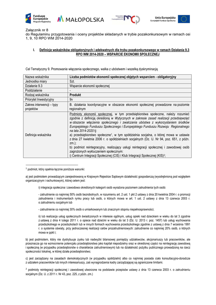 Załącznik nr 8 do Regulaminu przygotowania i oceny projektów składanych w trybie pozakonkursowym w ramach osi 1, 9, 10 RPO WM 2014-2020 I. Definicje wskaźników obligatoryjnych i adekwatnych dla trybu pozakonkursowego w ramach Działania 9.3 RPO WM 2014-2020 – WSPARCIE EKONOMII SPOŁECZNEJ Cel Tematyczny 9. Promowanie włączenia społecznego, walka z ubóstwem i wszelką dyskryminacją Nazwa wskaźnika Jednostka miary Działanie 9.3 Poddziałanie Rodzaj wskaźnika Priorytet Inwestycyjny Zakres interwencji – typy projektów Definicja wskaźnika 1 Liczba podmiotów ekonomii społecznej objętych wsparciem - obligatoryjny Szt. Wsparcie ekonomii społecznej Produkt 9v B. działania koordynacyjne w obszarze ekonomii społecznej prowadzone na poziomie regionalnym Podmioty ekonomii społecznej, w tym przedsiębiorstwa społeczne, należy rozumieć zgodnie z definicją określoną w Wytycznych w zakresie zasad realizacji przedsięwzięć w obszarze włączenia społecznego i zwalczania ubóstwa z wykorzystaniem środków Europejskiego Funduszu Społecznego i Europejskiego Funduszu Rozwoju Regionalnego na lata 2014-2020 tj: a) przedsiębiorstwo społeczne1, w tym spółdzielnia socjalna, o której mowa w ustawie z dnia 27 kwietnia 2006 r. o spółdzielniach socjalnych (Dz. U. Nr 94, poz. 651, z późn. zm.); b) podmiot reintegracyjny, realizujący usługi reintegracji społecznej i zawodowej osób zagrożonych wykluczeniem społecznym: i) Centrum Integracji Społecznej (CIS) i Klub Integracji Społecznej (KIS)2; podmiot, który spełnia łącznie poniższe warunki: a) jest podmiotem prowadzącym zarejestrowaną w Krajowym Rejestrze Sądowym działalność gospodarczą (wyodrębnioną pod względem organizacyjnym i rachunkowym), której celem jest: i) integracja społeczna i zawodowa określonych kategorii osób wyrażona poziomem zatrudnienia tych osób: - zatrudnienie co najmniej 50% osób bezrobotnych, w rozumieniu art. 2 ust. 1 pkt 2 ustawy z dnia 20 kwietnia 2004 r. o promocji zatrudnienia i instrumentach rynku pracy lub osób, o których mowa w art. 1 ust. 2 ustawy z dnia 13 czerwca 2003 r. o zatrudnieniu socjalnym lub - zatrudnienie co najmniej 30% osób o umiarkowanym lub znacznym stopniu niepełnosprawności; ii) lub realizacja usług społecznych świadczonych w interesie ogólnym, usług opieki nad dzieckiem w wieku do lat 3 zgodnie z ustawą z dnia 4 lutego 2011 r. o opiece nad dziećmi w wieku do lat 3 (Dz. U. 2013 r. poz. 1457) lub usług wychowania przedszkolnego w przedszkolach lub w innych formach wychowania przedszkolnego zgodnie z ustawą z dnia 7 września 1991 r. o systemie oświaty, przy jednoczesnej realizacji celów prozatrudnieniowych: zatrudnienie co najmniej 20% osób, o których mowa w ppkt i; b) jest podmiotem, który nie dystrybuuje zysku lub nadwyżki bilansowej pomiędzy udziałowców, akcjonariuszy lub pracowników, ale przeznacza go na wzmocnienie potencjału przedsiębiorstwa jako kapitał niepodzielny oraz w określonej części na reintegrację zawodową i społeczną (w przypadku przedsiębiorstw o charakterze zatrudnieniowym) lub na działalność pożytku publicznego prowadzoną na rzecz społeczności lokalnej, w której działa przedsiębiorstwo; c) jest zarządzany na zasadach demokratycznych (w przypadku spółdzielni) albo co najmniej posiada ciało konsultacyjno-doradcze z udziałem pracowników lub innych interesariuszy, zaś wynagrodzenia kadry zarządzającej są ograniczone limitami. 2 podmioty reintegracji społecznej i zawodowej utworzone na podstawie przepisów ustawy z dnia 13 czerwca 2003 r. o zatrudnieniu socjalnym (Dz. U. z 2011 r. Nr 43, poz. 225, z późn. zm.) ii) Zakład Aktywności Zawodowej (ZAZ) i Warsztaty Terapii Zajęciowej (WTZ), o których mowa w ustawie z dnia 27 sierpnia 1997 r. o rehabilitacji zawodowej i społecznej oraz zatrudnianiu osób niepełnosprawnych; c) organizacja pozarządowa lub podmiot, o którym mowa w art. 3 ust. 3 pkt 1 ustawy z dnia 24 kwietnia 2003 r. o działalności pożytku publicznego i o wolontariacie (Dz. U. z 2014 r. poz. 1118, z późn. zm.); d) podmiot sfery gospodarczej utworzony w związku z realizacją celu społecznego bądź dla którego leżący we wspólnym interesie cel społeczny jest racją bytu działalności komercyjnej. Grupę tę można podzielić na następujące podgrupy: i) organizacje pozarządowe, o których mowa w ustawie z dnia 24 kwietnia 2003 r. o działalności pożytku publicznego i o wolontariacie prowadzące działalność gospodarczą, z której zyski wspierają realizację celów statutowych; ii) spółdzielnie, których celem jest zatrudnienie tj. spółdzielnie pracy, inwalidów i niewidomych, działające w oparciu o ustawę z dnia 16 września 1982 r. - Prawo spółdzielcze (Dz. U. z 2013 r. poz. 1443, z późn. zm.); iii) spółki non-profit, o których mowa w ustawie z dnia 24 kwietnia 2003 r. o działalności pożytku publicznego i o wolontariacie, o ile udział sektora publicznego w spółce wynosi nie więcej niż 50%. We wskaźniku należy wykazać podmioty ekonomii społecznej, które otrzymały wsparcie bezpośrednie w ramach projektu. Wsparcie bezpośrednie dla instytucji należy rozumieć zgodnie z Wytycznymi w zakresie monitorowanie postępu rzeczowego programów realizacji operacyjnych (Rozdział 3): wsparcie realizowane na rzecz funkcjonowania tego podmiotu (np. w formie stworzenia dodatkowego miejsca pracy, wprowadzenia zmiany jakościowej w jego funkcjonowaniu) lub promowania zmiany organizacyjnej i innowacji w tej instytucji. Wsparciem bezpośrednim dla danego podmiotu nie jest przeszkolenie lub inna forma wsparcia jego pracownika w sytuacji, gdy nie wynika to z potrzeb tej instytucji (np. pracownik zgłasza się na szkolenie z własnej inicjatywy). Ponadto we wskaźniku możliwe jest wykazanie instytucji utworzonych w ramach projektu. Źródło danych Podmiot należy wykazać w momencie objęcia instytucji pierwszą formą wsparcia zaplanow