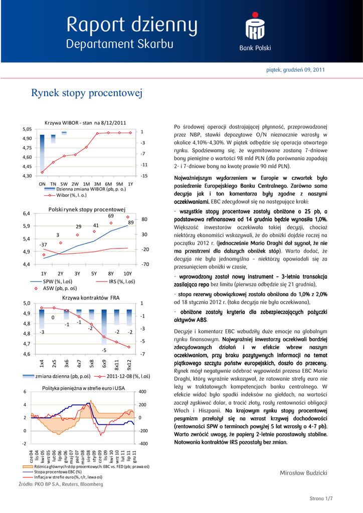 Raport dzienny Departament Skarbu piątek, grudzień 09, 2011 Rynek stopy procentowej Krzywa WIBOR - stan na 8/12/2011 5,05 1 4,90 -3 4,75 -7 4,60 4,45 -11 4,30 -15 ON TN SW 2W 1M 3M 6M 9M 1Y Dzienna zmiana WIBOR (pb, p. o.) Wibor (%, l. o.) Polski rynek stopy procentowej 6,4 69 5,9 89 41 29 80 30 3 5,4 -37 4,9 -20 4,4 -70 1Y 2Y 3Y SPW (%, l.oś) ASW (pb, p. oś) 5Y 8Y 10Y IRS (%, l.oś) 1 4,9 4,8 4,8 -1 0 -1 -1 -2 -3 -2 -2 -5 zmiana dzienna (pb, p.oś) 9x12 8x11 -7 6x9 5x8 4x7 3x6 2x5 1x4 4,6 6 -3 -5 4,7 2011-12-08 (%, l.oś) Polityka pieniężna w strefie euro i USA Najważniejszym wydarzeniem w Europie w czwartek było posiedzenie Europejskiego Banku Centralnego. Zarówno sama decyzja jak i ton komentarza były zgodne z naszymi oczekiwaniami. oczekiwaniami. EBC zdecydował się na następujące kroki: - wszystkie stopy procentowe zostały obniżone o 25 pb, a podstawowa refinansowa od 14 grudnia będzie wynosiła 1,0%. Większość inwestorów oczekiwała takiej decyzji, chociaż niektórzy ekonomiści wskazywali, że do obniżki dojdzie raczej na początku 2012 r. (jednocześnie jednocześnie Mario Draghi dał sygnał, że nie ma przestrzeni dla dalszych obniżek stóp). stóp Warto dodać, że decyzja nie była jednomyślna – niektórzy opowiadali się za przesunięciem obniżki w czasie, - wprowadzony wprowadzony został nowy instrument – 3-letnia transakcja zasilająca repo bez limitu (pierwsza odbędzie się 21 grudnia), Krzywa kontraktów FRA 5,0 Po środowej operacji dostrajającej płynność, przeprowadzonej przez NBP, stawki depozytowe O/N nieznacznie wzrosły w okolice 4,10%-4,30%. W piątek odbędzie się operacja otwartego rynku. Spodziewamy się, że wyemitowane zostaną 7-dniowe bony pieniężne o wartości 98 mld PLN (dla porównania zapadają 2- i 7-dniowe bony na kwotę prawie 90 mld PLN). 400 200 2 0 0 -200 -2 -400 - obniżone zostały kryteria kryteria dla zabezpieczających pożyczki aktywów ABS. ABS Decyzje i komentarz EBC wzbudziły duże emocje na globalnym rynku finansowym. Najwyraźniej inwestorzy oczekiwali bardziej zdecydowanych działań i w efekcie wbrew naszym oczekiwaniom, przy braku pozytywnych informacji informacji na temat piątkowego szczytu państw europejskich, doszło do przeceny. Rynek mógł negatywnie odebrać wypowiedzi prezesa EBC Maria Draghi, który wyraźnie wskazywał, że ratowanie strefy euro nie leży w traktatowych kompetencjach banku centralnego. W efekcie widać było spadki indeksów na giełdach, na wartości zaczął zyskiwać dolar, a tracić złoty, rosły rentowności obligacji Włoch i Hiszpanii. Na krajowym rynku stopy procentowej pesymizm przełożył się na wzrost krzywej dochodowości (rentowności SPW o terminach terminach powyżej 5 lat wzrosły o 44-7 pb). Warto zwrócić uwagę, że papiery 22-letnie pozostawały stabilne. Notowania kontraktów IRS pozostały bez zmian. cze 04 lis 04 kwi 05 wrz 05 lut 06 lip 06 gru 06 maj 07 paź 07 mar 08 sie 08 sty 09 cze 09 lis 09 kwi 10 wrz 10 lut 11 lip 11 gru 11 4 - stopa rezerwy obowiązkowej została obniżona do 1,0% z 2,0% od 18 stycznia 2012 r. (taka decyzja nie była oczekiwana), Różnica głównych stóp procentowych: EBC vs. FED (pb; prawa oś) Stopa procentowa EBC (%) Inflacja w strefie euro (%, r/r, lewa oś) Mirosław Budzicki Źródło: PKO BP S.A., Reuters, Bloomberg Strona 1/7 PKO Bank Polski Raport dzienny 09.12.2011 Rynek walutowy EUR/PLN 4,535 4,500 4,465 9 gru 8 gru 7 gru 6 gru 5 gru 2 gru 4,430 USD/PLN 3,400 3,370 3,340 3,310 9 gru 8 gru 7 gru 6 gru 5 gru 2 gru 3,280 CHF/PLN 3,670 3,640 3,610 9 gru 8 gru 7 gru 6 gru 5 gru 2 gru 3,580 EUR/USD 1,356 1,346 1,336 Źródło: PKO BP S.A., Reuters, Bloomberg 9 gru 8 gru 7 gru 6 gru 5 gru 2 gru 1,326 Czwartek na rynkach finansowych przebiegał w oczekiwaniu na decyzje banku centralnego Anglii (BoE) i EBC. Tego dnia rozpoczynał się też dwudniowy szczyt przywódców strefy euro, euro który w opinii wielu inwestorów miał przynieść konkretne propozycje rozwiązań kryzysu zadłużenia w strefie euro. Niepewność wyniku spotkania dodatkowo zwiększała napięcie na rynku. W rezultacie przez większą cześć czwartkowej sesji europejskiej kurs EUR/USD konsolidował się wokół 1,34. Zgodnie z oczekiwaniami BoE pozostawił stopy procentowe bez zmian na poziomie 0,50%, zaś EBC obniżył koszt pieniądza o 25 pb do 1,00%. O ile same decyzje banków pozostały bez większego wpływu na rynek euro/dolara, o tyle słowa padające podczas konferencji prezesa Mario Draghi mocno rozczarowały inwestorów. Bank dał bowiem wyraźnie do zrozumienia, iż nie zamierza agresywnie skupować obligacji krajów strefy euro borykających się ze znacznym zadłużeniem, na co liczyła spora grupa inwestorów. Draghi podkreślił, że to Europejski Fundusz Stabilizacji Finansowej (EFSF) powinien pozostać głównym instrumentem walki z kryzysem zadłużenia, a udzielanie pożyczek przez ECB Międzynarodowemu Funduszowi Walutowego (MFW) na zakupy obligacji krajów strefy euro nie może trwać w nieskończoność. Rozczarowanie wypowiedzią szefa ECB Mario Draghi przełożyło się na silne spadki spadki indeksów na giełdach od Europy przez Stany Zjednoczenie, po Japonię. Dow Jones tracił na zamknięciu 1,6% i po raz pierwszy od 29 listopada zakończył sesję poniżej 12 000 pkt, S&P500 spadł o 2,1%, a Nasdaq o 2,0%. Niemiecki DAX spadł o 2,1%, zaś japoński japoński Nikkei zamkną się z 1,48% stratą. Na rynku walutowym kurs EUR/USD spadł w okolice wsparcia na 1,33 złoty zaś osłabił się do 4,524 wobec euro i 3,39 wobec dolara. Dzisiaj we wczesnych godzinach porannych przywódcy państw UE zakończyli (jak to określają serwisy informacyjne) porażką rozmowy na szczycie dotyczące zmiany traktatu unijnego, za co obwiniany jest Londyn. Niemiej, nowe zasady dyscypliny finansów publicznych mają być wdrożone umową międzyrządową 17 państw strefy euro oraz 6 spoza niej. Przewodniczący Rady Europejskiej He