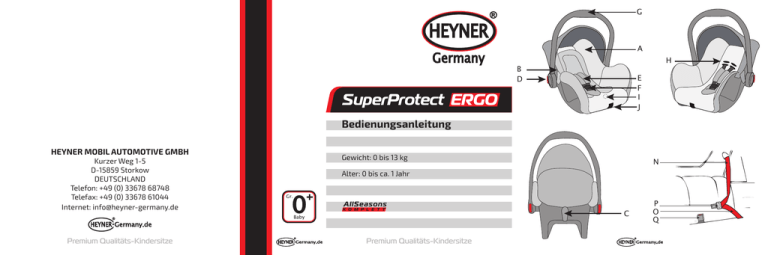 G A B D H E F I J SuperProtect ERGO Bedienungsanleitung HEYNER MOBIL AUTOMOTIVE GMBH Kurzer Weg 1-5 D-15859 Storkow DEUTSCHLAND Telefon: +49 (0) 33678 68748 Telefax: +49 (0) 33678 61044 Internet: [email protected] Premium Qualitäts-Kindersitze Gewicht: 0 bis 13 kg N Alter: 0 bis ca. 1 Jahr AllSeasons K O M P L E T T Premium Qualitäts-Kindersitze C P O Q Baby SuperProtect ERGO Gruppe 0+, für Kinder von 0 bis 13 kg, (0 Monate bis 1 Jahr) 1a 1b 1c 2b 3 4 5 7a 7b 7c 7d CapsulaProtect 3D Capsula MultiFix ERGO 3D Multi Protect ERGO SP 3D RBAG AI click 8 9 Bedienungsanleitung D Instruction Manual GB Инструкция по обслуживанию RUS Instrukcja obsługi PL 2a MultiProtect AERO MaxiProtect ERGO 3D-SP SafeUp ERGO M & XL Inhaltsverzeichnis 1. Verwendung der HEYNER®Baby SuperProtect ERGO 2. Anpassen der HEYNER®Baby SuperProtect ERGO an die Kindergröße 3. Einbau des HEYNER®Baby SuperProtect ERGO im Auto 4. Einstellung des Tragebügels 5. Verwendung des HEYNER®Baby SuperProtect ERGO mit einem Kinderwagen 6. Pflegeanleitung 7. Wichtige Hinweise Bedienungsanleitung A Babyschale B Seitliche Gurtführung C Rückseitige Gurtführung D Entriegelung Tragebügel E Schultergurte / Hosenträgergurte F Gurtschloss G Tragebügel H I J N O P Q Schultergurtdurchführungen Gurtversteller Gurtendstück Diagonalgurt Beckengurt Schlosszunge Gurtschloss S. 3 S. 3 S. 4 S. 6 S. 7 S. 8 S. 8 Deutsch 1. Verwendung der HEYNER®Baby SuperProtect ERGO Sie haben sich zur Sicherung Ihres Kindes für die HEYNER®Baby SuperProtect ERGO entschieden. Ihre optimalen Sicherheitseigenschaften kann sie erst dann zur Wirkung bringen, wenn sie vorschriftsmäßig verwendet wird. Achten Sie deshalb auf den korrekten Einbau im Auto und lesen Sie dazu die Bedienungsanleitung. Bitte führen Sie die Bedienungsanleitung immer mit der Babyschale mit. Die Montage darf nur von Erwachsenen ausgeführt werden! 2. Anpassen der HEYNER®Baby SuperProtect ERGO an die Kindergröße Abb. 1 Die Babyschale HEYNER®Baby SuperProtect ERGO besitzt ein eigenes Gurtsystem, ein Hosenträgergurt-System, dessen Verlauf Sie der Größe des Kindes anpassen müssen: Stellen Sie die Babyschale HEYNER®Baby SuperProtect ERGO auf einen Stuhl oder auf den Boden und legen Sie das Kind hinein. Um einen optimalen Gurtverlauf zu gewährleisten, müssen die Hosenträgergurte (E) je nach Größe des Kindes knapp über den Schultern verlaufen (Abb. 1c), nicht zu hoch (Abb. 1a) und nicht zu tief (Abb. 1b). Achtung: Lassen Sie Ihr Kind niemals unbeaufsichtigt im nicht befestigten Sitz. Deutsch Abb. 2 So verstellen sie die Schultergurte (Hosenträgergurte) in ihrer Höhe bzw. das Niveau der Schultergurte: Öffnen Sie das Gurtschloss (F) und ziehen Sie die Hosenträgergurte (E) durch die Schultergurtdurchführungen (H). Je nach Größe des Kindes führen Sie die Gurtenden in die passenden Schultergurt-Durchführungen (H) ein. D Verlängern (Abb. 2a) können Sie die Hosenträgergurte (E), indem Sie den metallenen Gurtversteller (I) drücken und gleichzeitig die Hosenträgergurte nach vorne ziehen. Verkürzen (Abb. 2b) können Sie die Hosenträgergurte (E), indem Sie nur am Gurtendstück (J) ziehen. Bitte überprüfen Sie den Gurtverlauf regelmäßig und passen ihn der neuen Größe des Kindes an. Gurtbänder müssen straff gezogen werden und dürfen nicht verdreht sein. Nachdem Sie sich vergewissert haben, dass die Schultergurte in der richtigen Höhe eingestellt sind, ziehen Sie die beiden Schultergurte (E) über die Schultern Ihres Babys. Führen Sie die Enden der Schultergurte zusammen in das Gurtschloss ein. Das Schloss ist eingerastet, wenn ein deutliches „Klick“ zu hören ist (Abb. 8). Straffen Sie die Hosenträgergurte nochmals, indem Sie am Gurtendstück (J) ziehen, bis die Gurte fest am Körper des Kindes anliegen. 3. Einbau des HEYNER®Baby SuperProtect ERGO im Auto 3.1. Vorbereitung (Abb. 3) Der Sitz kann auf allen Beifahrer- und Rücksitzen des Fahrzeugs verwendet werden, die mit einem Dreipunktgurt ausgestattet sind. Die HEYNER®Baby SuperProtect ERGO 3 4 Deutsch darf allerdings nicht auf einem Autositz befestigt werden, wenn nur ein Beckengurt vorhanden ist. Die Babyschale ist IMMER mit dem Rücken zur Fahrtrichtung zu montieren (Reboard). 3.2. Montage auf dem Beifahrersitz Wenn Sie den Kindersitz auf dem Beifahrersitz montieren, ist dieser soweit wie möglich nach hinten zu schieben, gleichzeitig muss die Rückenlehne des Fahrzeugsitzes in die aufrechte Position gebracht werden. Auch ist die Kopfstütze in die unterste Position einzustellen. ACHTUNG: Der Beifahrerairbag muss deaktiviert oder nicht vorhanden sein. Informieren Sie sich immer betreffend des Beifahrerairbags in einer offiziellen Autovertretung (Autohändler) der entsprechenden Fahrzeugmarke und lassen Sie die Abschaltung nur dort ausführen. Ein falsch oder nicht deaktivierter Beifahrerairbag kann im Falle eines Unfalls tödliche Verletzungen für Ihr Kind zur Folge haben. 3.3. Montage auf Beifahrer- oder Rücksitz (Abb. 4) Der Dreipunktgurt eines Fahrzeuges (Abb. 6) setzt sich aus 4 Teilen zusammen: Dem Beckengurt (O), dem Diagonalgurt (N), der Schlosszunge (P) und dem Gurtschloss (Q). Stellen Sie die Babyschale (A) mit dem Rücken zur Fahrtrichtung auf den Fahrzeugsitz (entgegen der Fahrtrichtung, »REBOARD«). Führen Sie den Beckengurt (O) in die seitlichen, durch blaue Pfeile markierten Gurtführungen links und rechts (B) der Babyschale (A) ein und schließen Sie den Dreipunktgurt des PKW mit einem deutlichen »Klick«. Straffen Sie die Gurte so stark wie möglich in Richtung des Rückhaltesystems des Autos. 5 Deutsch Abb. 5 Den Diagonalgurt (N) zuletzt in die rückseitige, in die blau markierte Gurtführung (C) einhängen. Den Tragebügel (G) in die waagerechte Stellung nach vorne zur Rückenlehne des Autositzes (siehe auch Punkt 4. „Einstellungen des Tragebügels“) einstellen. Warnung: Keine anderen, als die beschriebenen Lasteinleitungspunkte (Gurtführungen mit 