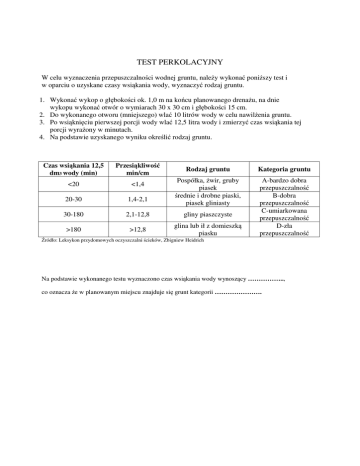 TEST PERKOLACYJNY W celu wyznaczenia przepuszczalności wodnej gruntu, należy wykonać poniższy test i w oparciu o uzyskane czasy wsiąkania wody, wyznaczyć rodzaj gruntu. 1. Wykonać wykop o głębokości ok. 1,0 m na końcu planowanego drenażu, na dnie wykopu wykonać otwór o wymiarach 30 x 30 cm i głębokości 15 cm. 2. Do wykonanego otworu (mniejszego) wlać 10 litrów wody w celu nawilżenia gruntu. 3. Po wsiąknięciu pierwszej porcji wody wlać 12,5 litra wody i zmierzyć czas wsiąkania tej porcji wyrażony w minutach. 4. Na podstawie uzyskanego wyniku określić rodzaj gruntu. Czas wsiąkania 12,5 dm3 wody (min) Przesiąkliwość min/cm <20 <1,4 20-30 1,4-2,1 30-180 2,1-12,8 gliny piaszczyste >180 >12,8 glina lub ił z domieszką piasku Rodzaj gruntu Kategoria gruntu Pospółka, żwir, gruby piasek średnie i drobne piaski, piasek gliniasty A-bardzo dobra przepuszczalność B-dobra przepuszczalność C-umiarkowana przepuszczalność D-zła przepuszczalność Źródło: Leksykon przydomowych oczyszczalni ścieków, Zbigniew Heidrich Na podstawie wykonanego testu wyznaczono czas wsiąkania wody wynoszący …………….., co oznacza że w planowanym miejscu znajduje się grunt kategorii ………………….