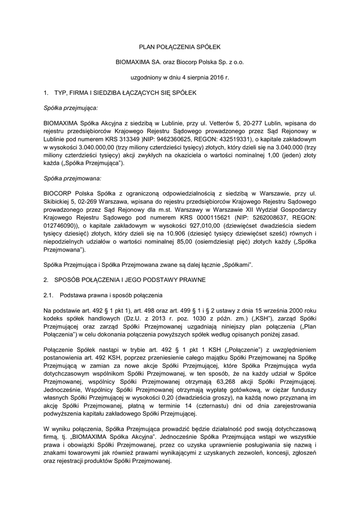 PLAN POŁĄCZENIA SPÓŁEK BIOMAXIMA SA. oraz Biocorp Polska Sp. z o.o. uzgodniony w dniu 4 sierpnia 2016 r. 1. TYP, FIRMA I SIEDZIBA ŁĄCZĄCYCH SIĘ SPÓŁEK Spółka przejmująca: BIOMAXIMA Spółka Akcyjna z siedzibą w Lublinie, przy ul. Vetterów 5, 20-277 Lublin, wpisana do rejestru przedsiębiorców Krajowego Rejestru Sądowego prowadzonego przez Sąd Rejonowy w Lublinie pod numerem KRS 313349 )NIP: 9462360625, REGON: 432519331), o kapitale zakładowym w wysokości 3.040.000,00 (trzy miliony czterdzieści tysięcy) złotych, który dzieli się na 3.040.000 (trzy miliony czterdzieści tysięcy) akcji zwykłych na okaziciela o wartości nominalnej 1,00 (jeden) złoty każda („Spółka Przejmująca”). Spółka przejmowana: BIOCORP Polska Spółka z ograniczoną odpowiedzialnością z siedzibą w Warszawie, przy ul. Skibickiej 5, 02-269 Warszawa, wpisana do rejestru przedsiębiorców Krajowego Rejestru Sądowego prowadzonego przez Sąd Rejonowy dla m.st. Warszawy w Warszawie XII Wydział Gospodarczy Krajowego Rejestru Sądowego pod numerem KRS 0000115621 (NIP: 5262008637, REGON: 012746090)), o kapitale zakładowym w wysokości 927,010,00 (dziewięćset dwadzieścia siedem tysięcy dziesięć) złotych, który dzieli się na 10.906 (dziesięć tysięcy dziewięćset sześć) równych i niepodzielnych udziałów o wartości nominalnej 85,00 (osiemdziesiąt pięć) złotych każdy („Spółka Przejmowana”). Spółka Przejmująca i Spółka Przejmowana zwane są dalej łącznie „Spółkami”. 2. SPOSÓB POŁĄCZENIA I JEGO PODSTAWY PRAWNE 2.1. Podstawa prawna i sposób połączenia Na podstawie art. 492 § 1 pkt 1), art. 498 oraz art. 499 § 1 i § 2 ustawy z dnia 15 września 2000 roku kodeks spółek handlowych (Dz.U. z 2013 r. poz. 1030 z późn. zm.) („KSH”), zarząd Spółki Przejmującej oraz zarząd Spółki Przejmowanej uzgadniają niniejszy plan połączenia („Plan Połączenia”) w celu dokonania połączenia powyższych spółek według opisanych poniżej zasad. Połączenie Spółek nastąpi w trybie art. 492 § 1 pkt 1 KSH („Połączenie”) z uwzględnieniem postanowienia art. 492 KSH, poprzez przeniesienie całego majątku Spółki Przejmowanej na Spółkę Przejmującą w zamian za nowe akcje Spółki Przejmującej, które Spółka Przejmująca wyda dotychczasowym wspólnikom Spółki Przejmowanej, w ten sposób, że na każdy udział w Spółce Przejmowanej, wspólnicy Spółki Przejmowanej otrzymają 63,268 akcji Spółki Przejmującej. Jednocześnie, Wspólnicy Spółki Przejmowanej otrzymają wypłatę gotówkową, w ciężar funduszy własnych Spółki Przejmującej w wysokości 0,20 (dwadzieścia groszy), na każdą nowo przyznaną im akcję Spółki Przejmowanej, płatną w terminie 14 (czternastu) dni od dnia zarejestrowania podwyższenia kapitału zakładowego Spółki Przejmującej. W wyniku połączenia, Spółka Przejmująca prowadzić będzie działalność pod swoją dotychczasową firmą, tj. „BIOMAXIMA Spółka Akcyjna”. Jednocześnie Spółka Przejmująca wstąpi we wszystkie prawa i obowiązki Spółki Przejmowanej, przez co uzyska uprawnienie posługiwania się nazwą i znakami towarowymi jak również prawami wynikającymi z uzyskanych zezwoleń, koncesji, zgłoszeń oraz rejestracji produktów Spółki Przejmowanej. 2.2. Skutki połączenia Połączenie nastąpi z dniem wpisania Połączenia do rejestru przedsiębiorców KRS, w tym w szczególności podwyższenia kapitału zakładowego Spółki Przejmowanej, właściwego według siedziby Spółki Przejmującej („Dzień Połączenia”). Wpis ten wywołuje skutek wykreślenia Spółki Przejmowanej z rejestru przedsiębiorców KRS, zgodnie z art. 493 § 2 KSH. Spółka Przejmowana zostanie rozwiązana, bez przeprowadzania postępowania likwidacyjnego, w dniu wykreślenia z rejestru. Wykreślenie Spółki Przejmowanej następuje z urzędu. Zgodnie z art. 494 § 1 KSH Spółka Przejmująca wstępuje z Dniem Połączenia we wszystkie prawa i obowiązki Spółki Przejmowanej. Na Spółkę Przejmującą przechodzą z Dniem Połączenia w szczególności zezwolenia, koncesje, oraz prawa wynikające ze zgłoszeń i rejestracji produktów Spółki Przejmowanej jak również ulgi, które zostały przyznane Spółce Przejmowanej, chyba, że ustawa lub decyzja o udzieleniu zezwolenia, koncesji lub ulgi stanowi inaczej. Z Dniem Połączenia wspólnik Spółki Przejmowanej stanie się akcjonariuszem Spółki Przejmującej. 3. STOSUNEK WYMIANY UDZIAŁÓW SPÓŁKI PRZEJMOWANEJ NA UDZIAŁY SPÓŁKI PRZEJMUJĄCEJ 3.1. Podwyższenie kapitału zakładowego w Spółce Przejmującej W związku z Połączeniem kapitał zakładowy Spółki Przejmującej zostanie podwyższony z kwoty 3.040.000,00 (trzy miliony czterdzieści tysięcy) złotych do kwoty 3.730.000 (trzy miliony siedemset trzydzieści tysięcy) złotych, tj. o kwotę 690.000 (sześćset dziewięćdziesiąt tysięcy) złotych, poprzez utworzenie i emisję 690.000 (sześćset dziewięćdziesiąt tysięcy) nowych, akcji zwykłych na okaziciela serii D o wartości nominalnej 1,00 (jeden) złoty. 3.2. Metodologie zastosowane do wyznaczenia stosunku wymiany udziałów Spółki Przejmowanej na udziały w Spółce Przejmującej („Stosunkiem Wymiany”) Stosunek Wymiany został ustalony na podstawie wyceny wartości godziwej obu spółek, tj. Spółki Przejmującej i Spółki Przejmowanej, określonej na dzień 1 lipca 2016 roku. Był on też przedmiotem szczegółowych negocjacji pomiędzy zarządami Spółek. Stosunek Wymiany został określony na następujących podstawach: 1) 2) 3) Zysku netto, z uwzględnieniem wielkości amortyzacji i zasad finansowania majątku produkcyjnego Spółek; z uwagi na stosowanie przez Spółki Polskich Standardów Rachunkowości, i różny sposób finansowania majątku przez obie Spółki nie było możliwe wykorzystanie wskaźnika EBITDA; Możliwych do uzyskania synergii i uczestniczenia w uzyskanej w ten spos