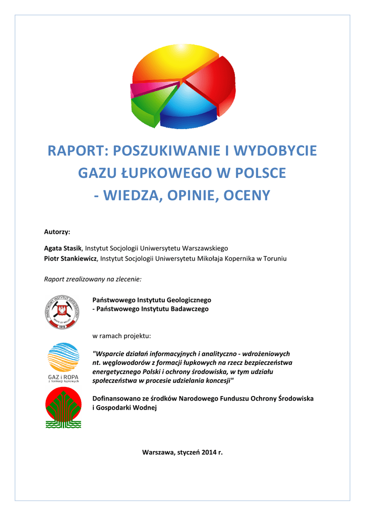 RAPORT: POSZUKIWANIE I WYDOBYCIE GAZU ŁUPKOWEGO W POLSCE - WIEDZA, OPINIE, OCENY OCENY Autorzy: Agata Stasik,, Instytut Socjologii Uniwersytetu Warszawskiego Piotr Stankiewicz,, Instytut Socjologii Uniwersytetu Mikołaja Kopernika w Toruniu Raport zrealizowany na zlecenie: Państwowego Instytutu Geologicznego - Państwowego Instytutu Badawczego w ramach projektu: "Wsparcie działań informacyjnych i analityczno - wdrożeniowych nt. węglowodorów z formacji łupkowych na rzecz bezpieczeństwa energetycznego Polski i ochrony środowiska, w tym udziału społeczeństw w procesie udzielania koncesji" społeczeństwa Dofinansowano ze środków Narodowego Funduszu Ochrony Środowiska i Gospodarki Wodnej Warszawa, styczeń 2014 r. WSTĘP Poszukiwanie i potencjalne wydobycie gazu łupkowego pozostaje ważnym tematem debaty publicznej. Choć poparcie społeczne dla rozwoju tego sektora utrzymuje się na wysokim poziomie, w przestrzeni publicznej nie milkną obawy i wątpliwości dotyczące szans i zagrożeń związanych z rozwojem tego nowego źródła energii. By móc na ich temat dyskutować, niezbędne jest określenie głównych obszarów sporu, poznanie wzbudzających kontrowersje zagadnień oraz identyfikacja potrzeb informacyjnych poszczególnych grup odbiorców. Przedstawione poniżej wyniki badań mają na celu zarysowanie mapy dyskusji wokół gazu łupkowego i pomogą wskazać główne punkty dyskusji, miejsca niepewności i białe plamy. Uzyskane wyniki umożliwią instytucjom publicznym i podmiotom prywatnym uczestniczącym w dialogu o gazie z łupków lepsze i trafniejsze reagowanie na faktyczne potrzeby społeczeństwa w zakresie informacji i edukacji o gazie łupkowego. Badanie przeprowadzono w dniach 6-10.12.2013 r. na reprezentatywnej próbie 1002 mieszkańców Polski w wieku powyżej 18 lat techniką sondażu telefonicznego CATI przez firmę Millward Brown SMG/KRC na zlecenie Państwowego Instytut Geologicznego Państwowego Instytutu Badawczego. Realizacja badania odbyła sie w ramach projektu edukacyjnego Państwowego Instytutu Geologicznego - Państwowego Instytutu Badawczego pt. "Wsparcie działań informacyjnych i analityczno - wdrożeniowych nt. węglowodorów z formacji łupkowych na rzecz bezpieczeństwa energetycznego Polski i ochrony środowiska, w tym udziału społeczeństwa w procesie udzielania koncesji", dofinansowanego ze środków Narodowego Funduszu Ochrony Środowiska i Gospodarki Wodnej. 2 NAJWAŻNIEJSZE WYNIKI 88% dorosłych Polaków zetknęło się z informacją o poszukiwaniu i planach wydobycia gazu łupkowego w Polsce. 80% popiera poszukiwanie i wydobycie gazu łupkowego na terenie Polski. Około połowy Polaków uważa, że ewentualne wydobycie przyniesie więcej korzyści niż strat zarówno dla kraju (51%), jak i gmin, w których prowadzone będą prace (49%). 14% Polaków deklaruje, że samodzielnie szukało informacji związanych z poszukiwaniem i wydobyciem gazu łupkowego; znacznie więcej, bo 38% deklaruje, że chciałoby pogłębić swoją wiedzę w tym obszarze. Jako potencjalnie interesujące najczęściej wskazywane są informacje dotyczące oddziaływania inwestycji na środowisko oraz aspektów ekonomicznych, jednak szczegółowe potrzeby informacyjne różnią się w poszczególnych grupach. Najpopularniejsze źródła wiedzy o temacie to media masowe: telewizja, internet, prasa i radio. Osoby młode i aktywnie zainteresowane tematem częściej korzystają z internetu. Wśród kobiet jest więcej osób, które nie słyszały wcześniej o planach dotyczących wydobycia, są wobec nich sceptycznie nastawione i sprzeciwiałyby się wydobyciu w najbliższej okolicy. Odnosząc się do potencjalnych konsekwencji wydobywania gazu łupkowego, osoby z wyższym wykształceniem częściej wskazują na możliwe zagrożenia dla środowiska naturalnego, a wśród korzyści wymieniają przede wszystkim zwiększenie niezależności energetycznej oraz pozytywny wpływ na gospodarkę. Osoby z niższym poziomem wykształcenia częściej wskazują na zagrożenia związane z bezpieczeństwem wydobycia, a wśród oczekiwanych korzyści najczęściej wymieniają spadek cen gazu. 3 PODSTAWOWA WIEDZA O PLANACH POSZUKIWANIA I WYDOBYCIA GAZU ŁUPKOWEGO Przed opublikowaniem raportu 1 amerykańskiej agencji informacyjnej (EIA, U.S. Energy Information Administration) szacującego światowe zasoby gazu łupkowego, który wskazywał na możliwość istnienia bogatych złóż w Polsce, temat ten znany był tylko wąskiej grupie specjalistów. Obecnie, trzy lata od rozpoczęcia publicznej dyskusji o poszukiwaniu i wydobyciu gazu łupkowego w Polsce zdecydowana większość mieszkańców kraju (88%)2 zetknęła się z tym tematem – pozytywnie odpowiada na pytanie „Czy słyszał\a Pan\i o poszukiwaniu i planowanym wydobyciu gazu łupkowego w Polsce?”. Jednocześnie, poziom wiedzy różni się w się zależności od płci – jest wyraźnie większy wśród mężczyzn (aż 96% słyszało o tych planach), niż wśród kobiet (80%). Wynika to prawdopodobnie ze stwierdzonej w wielu badaniach opinii publicznej prawidłowości, zgodnie z którą wśród mężczyzn więcej osób wyraża zainteresowanie sprawami publicznymi. Odsetek respondentów, którzy słyszeli o poszukiwaniu i wydobyciu wzrasta w grupach lepiej wykształconych. Wykres 1. Zetknięcie się z informacjami o planach dotyczących poszukiwania i wydobywania gazu łupkowego a poziom wykształcenia 93% 95% 90% 90% 87% 85% 80% 80% 75% 70% podstawowe zawodowe średnie wyższe N=1000. Pominięto odpowiedzi „trudno powiedzieć” (n=2) 1 U.S. Energy Information Administration, World Shale Gas Resources: An Initial Assessment of 14 Regions Outside the United States, kwiecień 2011, dostępny w internecie: http://www.eia.gov/analysis/studies/worldshalegas/archive/2011/pdf/fullreport.pdf (dostęp: 20.01.2014) 2 Wszystkie wartości procentowe podano w zaokrągleniu do liczb całkowitych. 4 W dalszych analizach w uzas
