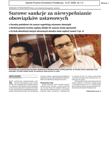 Gazeta Prawna Doradztwo Podatkowe, 14.01.2008, str.1-2 Strona 1 DORADCY PODATKOWI Kary za nieprzestrzeganie ustawy Surowe sankcje za niewypełnianie obowiązków ustawowych ■ Doradcy podatkowi nie zawsze wypełniają ustawowe obowiązki ■ Niedotrzymanie brak aktualizacji danych adresowych doradca może zapłacić nawet 5 tys. zł Fot. Wojciech Górski ■ Za terminu zapłaty składki OC oznacza utratę uprawnień Przewodniczący Krajowej Rady Doradców Podatkowych ZBIGNIEW MACIEJ SZYMIK podkreśla, że doradcy, którzy wypełniają swoje obowiązki, nie tylko unikają sankcji, ale podnoszą swoją wartość na rynku ŁUKASZ ZALEWSKI [email protected] K onsekwencje niedotrzymania ustawowych obowiązków przez doradców podatkowych są bardzo poważne, włącznie ze skreśleniem z listy doradców, a więc utratą uprawnień zawodowych. Mimo to nie wszyscy doradcy wypełniają swoje obowiązki. Najczęściej doradcy nie aktualizują danych o miejscu wykonywania działalności gospodarczej, nie opłacają składek członkowskich oraz składek na ubezpieczenia OC. Nieaktualne listy Każdy doradca, który zmienia miejsce wykonywania zawodu, a zatem przenosi się do innej firmy lub zakłada własną, ma obowiązek poinformowania o tym fakcie Krajową Radę Doradców Podatkowych w terminie 30 dni. Co więcej, musi podać wszystkie aktualne dane teleadresowe. Co, jeśli tego nie zrobi? – W przypadku braku aktualizacji danych można nałożyć na doradcę sankcję karną w wysokości nawet 5 tys. zł – wyjaśnia Zbigniew Maciej Szymik, przewodniczący Krajowej Rady Doradców Podatkowych. dokończenie na str. 2 Strona 2 Surowe sankcje za niewypełnianie obowiązków dokończenie ze str. 1 Jak wskazuje bowiem Brunon Szulc, wiceprzewodniczący Krajowej Rady Doradców Podatkowych, lista doradców, którą ma obowiązek prowadzić Rada, nie jest w pełni aktualna. Jeśli więc podatnik szuka doradcy z listy, a jego dane są nieaktualne, traci potencjalnego klienta. Podobnie jak z listą doradców wygląda sytuacja z listą podmiotów prawnych uprawnionych do doradztwa podatkowego, którą ma obowiązek prowadzić minister finansów. Dane o firmach także nie są więc aktualne. Problem w tym, że nikt właściwie nie egzekwuje obowiązku aktualizacji danych adresowych. Ustawa o doradztwie podatkowym nie mówi bowiem, kto miałby sprawdzać, czy doradca wypełnia ten obowiązek. Skreślenie z listy doradcy Doradca bardzo łatwo może narazić się na utratę swoich uprawnień. Wystarczy, że nie zapłaci w terminie składki obowiązkowego ubezpieczenia OC. Nie jest on jednak automatycznie skreślany z listy. – W momencie, gdy KRDP dowie się, że doradca nie dopełnił obowiązku ubezpieczenia OC, wszczyna postępowanie administracyjne – wyjaśnił Brunon Szulc. Zgodnie bowiem z ustawą o doradztwie podatkowym KRDP ma obowiązek prowadzenia kontroli ubezpieczeń. Jeśli w wyniku takiej kontroli okaże się, że doradca nie był przez jakiś okres ubezpieczony, Rada musi to sprawdzić. – W pierwszej kolejności KRDP podejmuje uchwałę o wszczęciu postępowania, powiadamia o tym fakcie doradcę podatkowego i wzywa go do udzielenia wyjaśnień. Jeśli doradca w postępowaniu udowodni, że posiadał w kwestionowanym okresie polisę ubezpieczeniową, postępowanie jest umarzane – powiedział Brunon Szulc. Może się bowiem zdarzyć, że doradca polisę zgubił, ale jest w stanie udowodnić, że ją posiadał. – Jeśli jednak w toku postępowania okaże się, że doradca nie był lub nie jest ubezpieczony, to na po- „ jednak możliwości umorzenia składek, nawet w części, ponieważ nie pozwala na to ustawa o doradztwie podatkowym. – Rada może natomiast rozłożyć zaległe składki na raty. Może to zrobić raz na cztery lata i rozłożyć spłatę na nie więcej niż sześć rat – poinformował Brunon Szulc. Od czerwca 2007 r. Rada rozłożyła zaległości z tytułu spłaty składek 115 osobom, co pokazuje również skalę zjawiska. Problem stanowi także rozkładanie zaległości na raty w sytuacji, gdy doradca w dalszym ciągu nie płaci bieżących składek. W związku z tym pojawił się pomysł, aby wprowadzić przepisy, zgodnie z którymi Rada rozpatrywałaby tylko te wnioski o rozłożenie na raty, do których będą dołączone dowody zapłaty trzech bieżących składek. i doradca musi ją wpłacić na rachunek bankowy KIDP lub do kasy biura Izby do 20 każdego miesiąca za miesiąc poprzedni. Mimo że składka w porównaniu ze stawkami doradców nie jest wysoka, zdarza się, że doradcy nie opłacają jej miesiącami. Doradcy dostrzegają problem najczęściej dopiero wówczas, gdy zaległości urosną do kilkuset lub nawet kilku tysięcy złotych. Spłata tych zaległości to jedno. Zbigniew Maciej Szymik zwraca jednak uwagę, że nieopłacenie składki członkowskiej może skutkować skierowaniem sprawy do rzecznika dyscyplinarnego KIDP. Brunon Szulc dodaje, że czasem dopiero wtedy doradca jest skłonny uiścić zaległe składki członkowskie. Gdy jednak kwota zaległości jest znaczna, problemem jest spłata zobowiązania. KRDP nie ma Warto wypełniać obowiązki Nasi rozmówcy zwracają uwagę, że doradcy, którzy wypełniają obowiązki, nie tylko unikają określonych sankcji, ale podnoszą swoją wartość na rynku. – Doradca, który wykonuje swoje obowiązki prawidłowo, jest wiarygodnym partnerem zarówno dla klienta, jak i organów podatkowych. W rezultacie popyt na jego usługi na rynku jest duży – uważa Brunon Szulc. Zbigniew Maciej Szymik zwraca też uwagę, że niektóre oddziały KIDP stosują formy zachęty dla doradców, którzy opłacają swoje składki członkowskie w postaci upustu w opłacie za szkolenia. Nieopłacenie składki może natomiast powodować podwyższenie opłaty za szkolenie.■ sankcję za niewykonanie obowiązku ubezpieczenia przenieść z ustawy do zasad etyki lub do statutu KIDP. Twierdzą bowiem, że obecne przepisy są