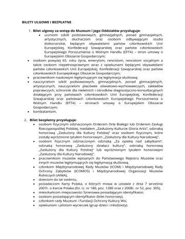 BILETY ULGOWE I BEZPŁATNE 1. Bilet ulgowy za wstęp do Muzeum i jego Oddziałów przysługuje: uczniom szkół podstawowych, gimnazjalnych, ponad gimnazjalnych, artystycznych, słuchaczom oraz osobom odbywającym studia doktoranckie, będącym obywatelami państw członkowskich Unii Europejskiej, Konfederacji Szwajcarskiej oraz państw członkowskich Europejskiego Porozumienia o Wolnym Handlu (EFTA) – stron umowy o Europejskim Obszarze Gospodarczym; osobom powyżej 65. roku życia, emerytom, rencistom, rencistom socjalnym a także osobom niepełnosprawnym wraz z opiekunami będącymi obywatelami państw członkowskich Unii Europejskiej, Konfederacji Szwajcarskiej oraz państw członkowskich Europejskiego Obszarze Gospodarczym; pracownikom naukowym legitymującym się legitymacja służbową; nauczycielom szkół podstawowych, gimnazjalnych, ponad gimnazjalnych, artystycznych, nauczycielom placówek oświatowo-wychowawczych, zakładów poprawczych, schronisk dla nieletnich i ośrodków diagnostyczno-konsultacyjnych działającym przy państwach członkowskich Unii Europejskiej, Konfederacji Szwajcarskiej oraz państwach członkowskich Europejskiego Porozumienia o Wolnym Handlu (EFTA) – stronach umowy o Europejskim Obszarze Gospodarczym; kombatantom. 2. Bilet bezpłatny przysługuje: osobom fizycznym odznaczonym Orderem Orła Białego lub Orderem Zasługi Rzeczypospolitej Polskiej, medalem ,,Zasłużony Kulturze Gloria Artis”, odznaką honorową ,,Zasłużony dla Kultury Polskiej” oraz osobom fizycznym, które zostały wyróżnione tytułem honorowym ,,Zasłużony dla Kultury Narodowej”, osobom fizycznym odznaczonym odznaką „Za opiekę nad zabytkami”, odznaką honorową „Zasłużony działacz kultury”, odznaką honorową „Zasłużony dla Kultury Polskiej” lub wyróżnionym tytułem honorowym „Zasłużony dla Kultury Narodowej”, pracownikom muzeów wpisanych do Państwowego Rejestru Muzeów oraz innych muzeów legitymujących się legitymacją służbową, członkom Międzynarodowej Rady Muzeów (ICOM) i Międzynarodowej Rady Ochrony Zabytków (ICOMOS) i Międzynarodowej Organizacji Muzeów Rolniczych (AIMA), dzieciom do lat siedmiu, posiadaczom Karty Polaka, o których mowa w ustawie z dnia 7 września 2007r. o Karcie Polaka (Dz. U. nr 180, poz. 1280 oraz z 2008r. nr 52, poz. 305), mieszkańcom miejscowości Szreniawa posiadającym identyfikator, osobom posiadającym identyfikator (bilet honorowy), członkom rady Muzeum i Fundacji Ochrony Kultury Wsi, opiekunom i pilotom wycieczek (grup dzieci i młodzieży). 3. Dokumentami potwierdzającymi uprawnienie do korzystania z ulgi w opłacie lub zwolnienia z opłaty za wstęp do muzeów są: legitymacje szkolne, studenckie, słuchaczy, uczestników studiów doktoranckich, doktoranta, legitymacje emeryta – rencisty, legitymacje dokumentujące niepełnosprawność lub stopień niepełnosprawności, zaświadczenia lub legitymacje potwierdzające uprawnienia kombatanckie, legitymacje Membership Card ICOM i Member-ship Card ICOMOS, legitymacja AIMA, Karta Polaka, dokumenty potwierdzające wiek, inne dokumenty potwierdzające uprawnienia osób do korzystania z ulgi w opłacie za wstęp do muzeów w państwach członkowskich Unii Europejskiej, Konfederacji Szwajcarskiej oraz państw członkowskich Europejskiego Porozumienia o Wolnym Handlu (EFTA) – stron umowy o Europejskim Obszarze Gospodarczym