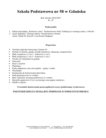 Szkoła Podstawowa nr 58 w Gdańsku Rok szkolny 2016/2017 kl. „0” Podręczniki: 1. Pakiet pięciolatka „Kolorowy start”. Wydawnictwo MAC Edukacja (w katalogu indeks: 1540250) 2. Język angielski: Treetops Starter. Wydawnictwo Oxford Autor: Sarah M. Howell i Lisa Kester-Dadgson Wyprawka: Tornister (plecak) mieszczący format A4 Piórnik (2 ołówki, gumka, kredki ołówkowe, flamastry, temperówka) Blok rysunkowy (1 szt.) + kolorowy (1 szt.) Blok techniczny (1 szt.) + kolorowy (1 szt.) Teczka A4 zamykana na gumkę Nożyczki Klej w sztyfcie Plastelina Farby plakatowe oraz dwa pędzle – gruby i cienki Wycinanki Książeczka do kolorowania (dowolna) Strój gimnastyczny (w worku) Buty zamienne na jasnej podeszwie (w worku) Ręczniki papierowe (2 szt. na miesiąc) oraz papier toaletowy Mydło w płynie O terminie dostarczania poszczególnych rzeczy poinformuje wychowawca WSZYSTKIE RZECZY MUSZĄ BYĆ PODPISANE W WIDOCZNYM MIEJSCU Szkoła Podstawowa nr 58 w Gdańsku ul. Skarpowa 3 tel: 58-3022391 www.sp58gda.internetdsl.pl e-mail: [email protected]