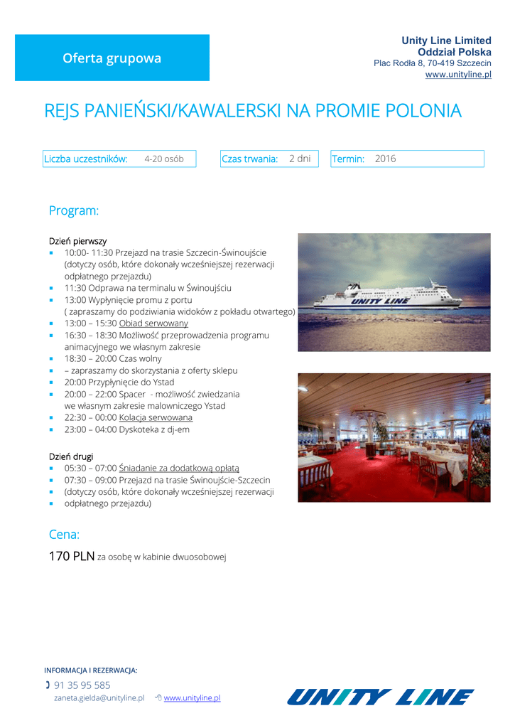 Unity Line Limited Oddział Polska Oferta grupowa Plac Rodła 8, 70-419 Szczecin www.unityline.pl REJS PANIEŃSKI/KAWALERSKI NA PROMIE POLONIA Liczba uczestników: 4-20 osób Czas trwania: 2 dni Program: Dzień pierwszy 10:00- 11:30 Przejazd na trasie Szczecin-Świnoujście (dotyczy osób, które dokonały wcześniejszej rezerwacji odpłatnego przejazdu) 11:30 Odprawa na terminalu w Świnoujściu 13:00 Wypłynięcie promu z portu ( zapraszamy do podziwiania widoków z pokładu otwartego) 13:00 – 15:30 Obiad serwowany 16:30 – 18:30 Możliwość przeprowadzenia programu animacyjnego we własnym zakresie 18:30 – 20:00 Czas wolny – zapraszamy do skorzystania z oferty sklepu 20:00 Przypłynięcie do Ystad 20:00 – 22:00 Spacer - możliwość zwiedzania we własnym zakresie malowniczego Ystad 22:30 – 00:00 Kolacja serwowana 23:00 – 04:00 Dyskoteka z dj-em Dzień drugi 05:30 – 07:00 Śniadanie za dodatkową opłatą 07:30 – 09:00 Przejazd na trasie Świnoujście-Szczecin (dotyczy osób, które dokonały wcześniejszej rezerwacji odpłatnego przejazdu) Cena: 170 PLN za osobę w kabinie dwuosobowej INFORMACJA I REZERWACJA: 91 35 95 585 [email protected] www.unityline.pl Termin: 2016 Oferta grupowa Unity Line Limited Oddział Polska Plac Rodła 8, 70-419 Szczecin www.unityline.pl Świadczenia zawarte w cenie: Przejazd promem Miejsce w kabinie podczas całego rejsu Kolacja (serwowana) Obiad (serwowany) Dyskoteka na promie Opłata paliwowa Uwagi Oferta ważna dla min. 4 osób max. 20 osób Koszt dodatkowy za śniadanie 34 pln Koszt dodatkowy za transport 36 pln Koszt dodatkowy za open bar w nocy 78 pln Oferta po zakupie nie podlega zwrotowi Do zobaczenia na pokładzie! INFORMACJA I REZERWACJA: 91 35 95 585 [email protected] www.unityline.pl
