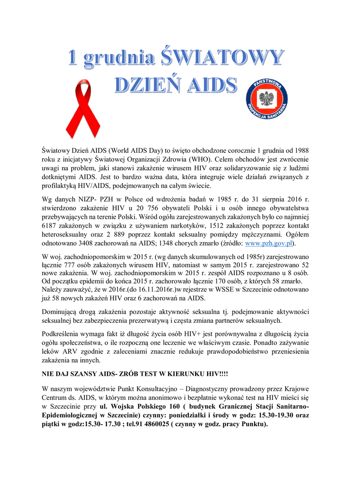 Światowy Dzień AIDS (World AIDS Day) to święto obchodzone corocznie 1 grudnia od 1988 roku z inicjatywy Światowej Organizacji Zdrowia (WHO). Celem obchodów jest zwrócenie uwagi na problem, jaki stanowi zakażenie wirusem HIV oraz solidaryzowanie się z ludźmi dotkniętymi AIDS. Jest to bardzo ważna data, która integruje wiele działań związanych z profilaktyką HIV/AIDS, podejmowanych na całym świecie. Wg danych NIZP- PZH w Polsce od wdrożenia badań w 1985 r. do 31 sierpnia 2016 r. stwierdzono zakażenie HIV u 20 756 obywateli Polski i u osób innego obywatelstwa przebywających na terenie Polski. Wśród ogółu zarejestrowanych zakażonych było co najmniej 6187 zakażonych w związku z używaniem narkotyków, 1512 zakażonych poprzez kontakt heteroseksualny oraz 2 889 poprzez kontakt seksualny pomiędzy mężczyznami. Ogółem odnotowano 3408 zachorowań na AIDS; 1348 chorych zmarło (źródło: www.pzh.gov.pl). W woj. zachodniopomorskim w 2015 r. (wg danych skumulowanych od 1985r) zarejestrowano łącznie 777 osób zakażonych wirusem HIV, natomiast w samym 2015 r. zarejestrowano 52 nowe zakażenia. W woj. zachodniopomorskim w 2015 r. zespół AIDS rozpoznano u 8 osób. Od początku epidemii do końca 2015 r. zachorowało łącznie 170 osób, z których 58 zmarło. Należy zauważyć, że w 2016r.(do 16.11.2016r.)w rejestrze w WSSE w Szczecinie odnotowano już 58 nowych zakażeń HIV oraz 6 zachorowań na AIDS. Dominującą drogą zakażenia pozostaje aktywność seksualna tj. podejmowanie aktywności seksualnej bez zabezpieczenia prezerwatywą i częsta zmiana partnerów seksualnych. Podkreślenia wymaga fakt iż długość życia osób HIV+ jest porównywalna z długością życia ogółu społeczeństwa, o ile rozpoczną one leczenie we właściwym czasie. Ponadto zażywanie leków ARV zgodnie z zaleceniami znacznie redukuje prawdopodobieństwo przeniesienia zakażenia na innych. NIE DAJ SZANSY AIDS- ZRÓB TEST W KIERUNKU HIV!!!! W naszym województwie Punkt Konsultacyjno – Diagnostyczny prowadzony przez Krajowe Centrum ds. AIDS, w którym można anonimowo i bezpłatnie wykonać test na HIV mieści się w Szczecinie przy ul. Wojska Polskiego 160 ( budynek Granicznej Stacji SanitarnoEpidemiologicznej w Szczecinie) czynny: poniedziałki i środy w godz: 15.30-19.30 oraz piątki w godz:15.30- 17.30 ; tel.91 4860025 ( czynny w godz. pracy Punktu). W dniach 05-09 grudnia 2016r. Punkt Konsultacyjno- Diagnostyczny w Szczecinie włącza się w inicjatywę Europejskiego Tygodnia Testowania w kierunku HIV oraz obchody Światowego Dnia AIDS 1 grudnia poprzez zwiększenie dostępności do testowania. W tym okresie Punkt będzie czynny codziennie (od poniedziałku do piątku) w godzinach 15.30-19.30. Każda osoba może skorzystać z możliwości nieodpłatnego wykonania testu w kierunku HIV, poprzedzonego profesjonalną rozmową przed i po teście z doradcą. WARTO PAMIĘTAĆ…… zakażeniu można dowiedzieć się tylko robiąc test w kierunku HIV. Osoby zakażonej nie rozpozna się po wyglądzie. Można wiele lat żyć z zakażeniem HIV i nie zachorować na AIDS pod warunkiem, że wie się o zakażeniu. Wirus HIV przenosi się przez krew, kontakty seksualne i drogą wertykalną tj. z zakażonej matki na dziecko (w czasie ciąży, podczas porodu, karmienia piersią) Komary i inne owady nie przenoszą zakażenia HIV. Również zwierzęta domowe nie są źródłem i nie przenoszą zakażenia. Nie można ulec zakażeniu HIV przez kontakt ze łzami, śliną i potem osoby zakażonej wirusem HIV. Korzystanie z wspólnej toalety, basenu, sprzętów kuchennych nie stanowi ryzyka przeniesienia zakażenia. Bezpieczne jest również przytulanie osoby zakażonej, wspólne mieszkanie, praca, zabawa. Można uniknąć zakażenia HIV…..m.in. poprzez: Zachowanie wierności partnerowi i wymaganie wierności od partnera. Przypadkowe kontakty seksualne są ryzykowne! Każdy nowy partner może być zakażony HIV. Używanie tylko własnych przyborów kosmetycznych np. żyletek, sprzętu do depilacji. Wykonywanie zabiegów kosmetycznych i tatuaży tylko w specjalistycznych gabinetach z użyciem jednorazowego, sterylnego sprzętu. Właściwe używanie prezerwatywy podczas kontaktów seksualnych- co znacznie zmniejsza ryzyko zakażenia HIV i innych chorób przenoszonych drogą seksualną. Odpowiedzialne zachowania! Należy pamiętać, że alkohol, narkotyki i inne środki psychoaktywne zmniejszają krytycyzm w zakresie odpowiedzialności za zachowania w tym także seksualne. Światowy Dzień AIDS przypomina, że epidemia to problem wciąż aktualny. Warto działać na rzecz jego rozwiązania także przez pozostałe dni w roku – poznając i upowszechniając informacje na temat HIV/AIDS, sposobów ograniczania ryzyka zakażenia, testując się w kierunku HIV, działając bez uprzedzeń w życiu prywatnym i zawodowym oraz solidaryzując się z osobami, które cierpią z tego powodu.