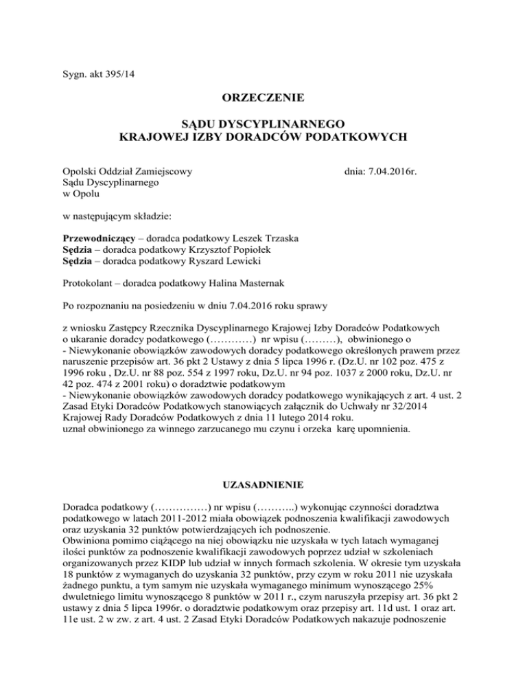 Sygn. akt 395/14 ORZECZENIE SĄDU DYSCYPLINARNEGO KRAJOWEJ IZBY DORADCÓW PODATKOWYCH Opolski Oddział Zamiejscowy Sądu Dyscyplinarnego w Opolu dnia: 7.04.2016r. w następującym składzie: Przewodniczący – doradca podatkowy Leszek Trzaska Sędzia – doradca podatkowy Krzysztof Popiołek Sędzia – doradca podatkowy Ryszard Lewicki Protokolant – doradca podatkowy Halina Masternak Po rozpoznaniu na posiedzeniu w dniu 7.04.2016 roku sprawy z wniosku Zastępcy Rzecznika Dyscyplinarnego Krajowej Izby Doradców Podatkowych o ukaranie doradcy podatkowego (…………) nr wpisu (………), obwinionego o - Niewykonanie obowiązków zawodowych doradcy podatkowego określonych prawem przez naruszenie przepisów art. 36 pkt 2 Ustawy z dnia 5 lipca 1996 r. (Dz.U. nr 102 poz. 475 z 1996 roku , Dz.U. nr 88 poz. 554 z 1997 roku, Dz.U. nr 94 poz. 1037 z 2000 roku, Dz.U. nr 42 poz. 474 z 2001 roku) o doradztwie podatkowym - Niewykonanie obowiązków zawodowych doradcy podatkowego wynikających z art. 4 ust. 2 Zasad Etyki Doradców Podatkowych stanowiących załącznik do Uchwały nr 32/2014 Krajowej Rady Doradców Podatkowych z dnia 11 lutego 2014 roku. uznał obwinionego za winnego zarzucanego mu czynu i orzeka karę upomnienia. UZASADNIENIE Doradca podatkowy (……………) nr wpisu (………..) wykonując czynności doradztwa podatkowego w latach 2011-2012 miała obowiązek podnoszenia kwalifikacji zawodowych oraz uzyskania 32 punktów potwierdzających ich podnoszenie. Obwiniona pomimo ciążącego na niej obowiązku nie uzyskała w tych latach wymaganej ilości punktów za podnoszenie kwalifikacji zawodowych poprzez udział w szkoleniach organizowanych przez KIDP lub udział w innych formach szkolenia. W okresie tym uzyskała 18 punktów z wymaganych do uzyskania 32 punktów, przy czym w roku 2011 nie uzyskała żadnego punktu, a tym samym nie uzyskała wymaganego minimum wynoszącego 25% dwuletniego limitu wynoszącego 8 punktów w 2011 r., czym naruszyła przepisy art. 36 pkt 2 ustawy z dnia 5 lipca 1996r. o doradztwie podatkowym oraz przepisy art. 11d ust. 1 oraz art. 11e ust. 2 w zw. z art. 4 ust. 2 Zasad Etyki Doradców Podatkowych nakazuje podnoszenie kwalifikacji zawodowych poprzez udział w szkoleniach organizowanych przez KIDP oraz innych formach szkolenia. Potwierdzeniem podnoszenia kwalifikacji zawodowych jest udział w szkoleniach organizowanych przez KIDP lub udział w innych formach szkolenia określonych w artykule 11f Zasad Etyki Doradców Podatkowych oraz uzyskania 32 punktów. Obwiniona przyznała się do winy, a w świetle jej wyjaśnień złożonych w trakcie postępowania przygotowawczego wskazała, że cele postępowania zostały osiągnięte. Sąd uznał, że wskazana przez obwinioną samokrytyka oraz wywiązywanie się z obowiązków wynikających z przywołanych powyżej przepisów w następnych latach jest okolicznością łagodzącą. Jednakże jak wynika z przepisów dotyczących podnoszenia kwalifikacji każdy doradca podatkowy winien dokształcać się w punktowanych formach dokształcania celem realizacji obowiązku wynikającego z art. 36 pkt 2 ustawy z dnia 5 lipca 1996r. o doradztwie podatkowym. Natomiast obwiniona tego obowiązku nie wykonała. W związku z powyższym mając na względzie całokształt przedstawionych powyżej wywodów Sąd uznał obwinioną za winną i na podstawie art. 64 ust. 2 pkt 1 ustawy z dnia 5 lipca 1996r. o doradztwie podatkowych orzekł jak w sentencji.