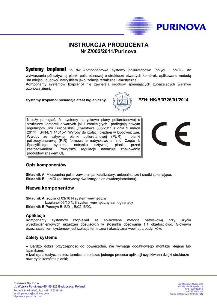 Instrukcja Producenta Nr Z/002/2011/Purinova