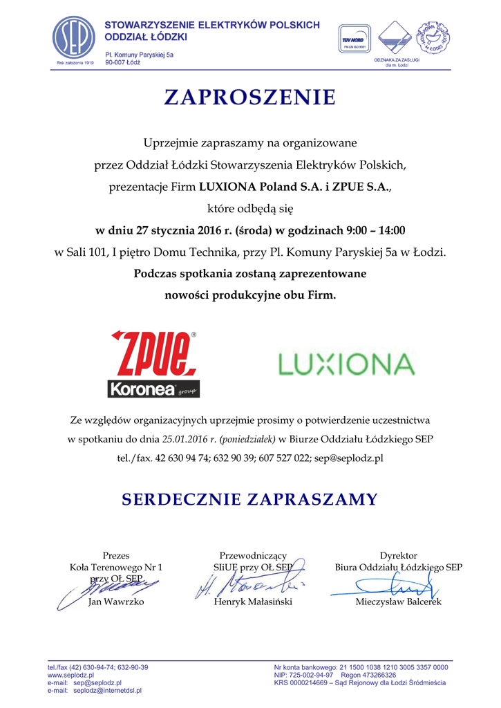 Uprzejmie zapraszamy na organizowane przez Oddział Łódzki Stowarzyszenia Elektryków Polskich, prezentacje Firm LUXIONA Poland S.A. i ZPUE S.A., które odbędą się w dniu 27 stycznia 2016 r. (środa) w godzinach 9:00 – 14:00 w Sali 101, I piętro Domu Technika, przy Pl. Komuny Paryskiej 5a w Łodzi. Podczas spotkania zostaną zaprezentowane nowości produkcyjne obu Firm. Ze względów organizacyjnych uprzejmie prosimy o potwierdzenie uczestnictwa w spotkaniu do dnia 25.01.2016 r. (poniedziałek) w Biurze Oddziału Łódzkiego SEP tel./fax. 42 630 94 74; 632 90 39; 607 527 022; [email protected] SERDECZNIE ZAPRASZAMY Prezes Koła Terenowego Nr 1 przy OŁ SEP Przewodniczący SIiUE przy OŁ SEP Dyrektor Biura Oddziału Łódzkiego SEP Jan Wawrzko Henryk Małasiński Mieczysław Balcerek tel./fax (42) 630-94-74; 632-90-39 www.seplodz.pl e-mail: [email protected] e-mail: [email protected] Nr konta bankowego: 21 1500 1038 1210 3005 3357 0000 NIP: 725-002-94-97 Regon 473266326 KRS 0000214669 – Sąd Rejonowy dla Łodzi Śródmieścia ul. Jędrzejowaka 79c 29-100 Włoszczowa Jacentów 167 27-580 Sadowie HARMONOGRAM PREZENTACJI 27.01.2016 r. Dom Technika w Łodzi Plac Komuny Paryskiej 5 a, I piętro sala 101 PREZENTACJA FIRMY LUXIONA POLAND S.A. 9:00 – 11:00 1. Nowości produktowe Firmy LUXIONA – oprawy oświetleniowe oparte na technologii LED: a) architektoniczne, b) do pomieszczeń czystych (szpitale, zakłady farmaceutyczne, laboratoria), c) biurowe, d) przemysłowe oraz do hal magazynowych wysokiego składowania, e) uliczne. 2. Systemy sterowania oświetleniem w aspekcie: a) Inteligentne instalacje b) Systemy oszczędzania energii elektrycznej c) Systemy monitoringu oświetlenia d) Automatyka sterowania e) Systemy sterowania oświetleniem ulicznym 3. Oprawy do pomieszczeń czystych – klasyfikacja, wymagania, rozwiązania techniczne. a) Oprawy klasyfikacji ISO. b) Oprawy z certyfikatem wyrobów medycznych. 4. Ekspozycja opraw oświetleniowych. PREZENTACJA FIRMY ZPUE S.A. 11:25 – 14:00 1. Ogólna prezentacja Firmy – film przedstawiający Firmę ZPU Koronea Group. 2. Innowacyjny samoczynny napowietrzny wyłącznik próżniowy (autoreklozer) z funkcją automatyki sieciowej „smart gird”. 3. Nowe możliwości wykorzystania sekcjonalizerów na bazie rozłączników THO. 4. Przykład zastosowań nowego wyłącznika VB-4 w zestawach modernizacyjnych „retrofit” w stacjach miejskich.