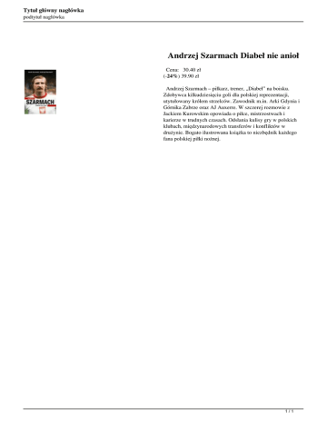 Tytuł główny nagłówka podtytuł nagłówka Andrzej Szarmach Diabeł nie anioł Cena: 30.40 zł (-24%) 39.90 zł Andrzej Szarmach – piłkarz, trener, „Diabeł” na boisku. Zdobywca kilkudziesięciu goli dla polskiej reprezentacji, utytułowany królem strzelców. Zawodnik m.in. Arki Gdynia i Górnika Zabrze oraz AJ Auxerre. W szczerej rozmowie z Jackiem Kurowskim opowiada o piłce, mistrzostwach i karierze w trudnych czasach. Odsłania kulisy gry w polskich klubach, międzynarodowych transferów i konfliktów w drużynie. Bogato ilustrowana książka to niezbędnik każdego fana polskiej piłki nożnej. 1/1 Powered by TCPDF (www.tcpdf.org)