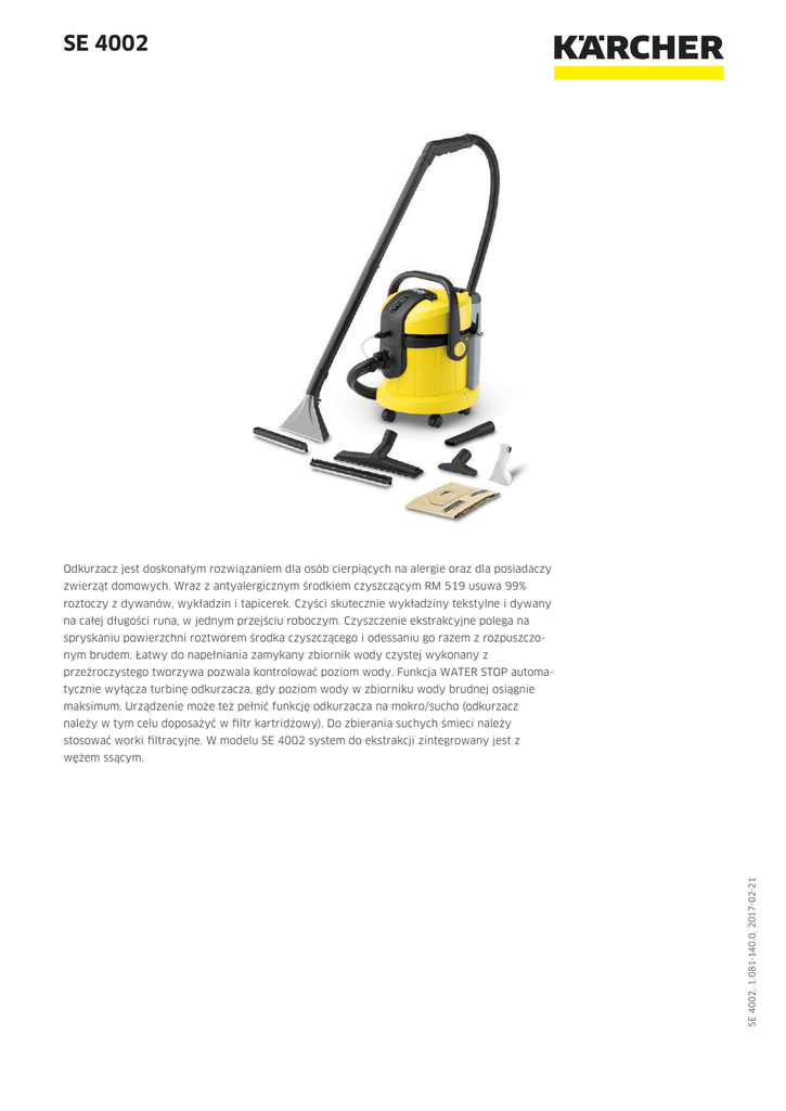 SE 4002 Odkurzacz jest doskonałym rozwiązaniem dla osób cierpiących na alergie oraz dla posiadaczy zwierząt domowych. Wraz z antyalergicznym środkiem czyszczącym RM 519 usuwa 99% roztoczy z dywanów, wykładzin i tapicerek. Czyści skutecznie wykładziny tekstylne i dywany na całej długości runa, w jednym przejściu roboczym. Czyszczenie ekstrakcyjne polega na spryskaniu powierzchni roztworem środka czyszczącego i odessaniu go razem z rozpuszczonym brudem. Łatwy do napełniania zamykany zbiornik wody czystej wykonany z przeźroczystego tworzywa pozwala kontrolować poziom wody. Funkcja WATER STOP automatycznie wyłącza turbinę odkurzacza, gdy poziom wody w zbiorniku wody brudnej osiągnie maksimum. Urządzenie może też pełnić funkcję odkurzacza na mokro/sucho (odkurzacz należy w tym celu doposażyć w filtr kartridżowy). Do zbierania suchych śmieci należy stosować worki filtracyjne. W modelu SE 4002 system do ekstrakcji zintegrowany jest z SE 4002, 1.081-140.0, 2017-02-21 wężem ssącym. SE 4002 System do ekstrakcji zintegrowany z wężem ssącym Technologia dysz Kärcher: czas schnięcia zredukowany o 50% Ssawka spryskująco-odsysająca do tapicerki Dane techniczne 1.081-140.0 Numer katalogowy Podciśnienie mbar / kPa 210 / 21 Wydatek powietrza l/s 70 Zbiornik na wodę czystą / brudną l 4 Moc turbiny / pompy W 1400 / 40 Wydajność spryskiwania l/min 1 Ciśnienie spryskiwania bar 1 Kabel zasilający m 7,5 Ciężar bez wyposażenia kg 7,8 Wyposażenie standardowe Wąż spryskująco-odsysający z uchwy- m / mm tem Rury do ekstrakcji szt. / m / mm Dysza spryskująco-odsysająca z nasadką do podłóg twardych Ssawka do tapicerki 2 / 35 Ssawka uniwersalna Clips Wyposażenie do odkurzania na sucho Clips Ssawka szczelinowa /– Ssawka do tapicerki Papierowa torebka filtracyjna Filtr piankowy Objęte dostawą. szt. 2 × 0,5 / 35 / Elementy z plastiku / – 1 SE 4002, 1.081-140.0, 2017-02-21 4039784346598 Akcesoria dla SE 4002 1.081-140.0 1 2 3 8 9 10 Numer katalogowy 4 5 6 Cena 7 Opis Dysze Ssawka spryskująco-odsysająca do tapicerki 1 2.885-018.0 Uniwersalna przełączana ssawka podłogowa 2 2.863-000.0 Długa ssawka szczelinowa 3 2.863-223.0 Ssawka samochodowa 4 2.863-145.0 Ssawka z twardą szczeciną 5 2.863-146.0 Ssawka szczotkowa z miękką szczeciną 6 2.863-147.0 Długa ssawka szczelinowa (350mm) 7 2.863-144.0 Ssawka spryskująco-odsysająca ręczna do odkurzaczy piorących. Doskonała do dogłębnego czyszczenia tapicerki oraz foteli samochodowych. Ssawka uniwersalna przełączana przeznaczona zarówno do odkurzania podłóg twardych jak i wykładzin tekstylnych. Z zaczepem do "parkowania". Nowa przeprojektowana, bardzo długa i wąska ssawka szczelinowa. Poręczna ssawka samochodowa do szybkiego i łatwego czyszczenia - od dywaników po bagażnik. Ssawka do dokładnego czyszczenia tapicerki i wykładziny dywanowej w samochodzie. Bez problemu usuwa zaschnięte zabrudzenia. Ssawka z dodatkową miękką szczeciną do delikatnego czyszczenia wrażliwych powierzchni w samochodzie, np. deska rozdzielcza lub konsola środkowa. Długa ssawka szczelinowa do czyszczenia trudnodostępnych miejsc takich jak szczeliny, otwory np. pomiędzy fotelami, w kieszeniach bocznych samochodu, między ścianą a meblami. Filtr Papierowe torebki filtracyjne Wkład filtracyjny Cartridge 8 6.959-130.0 9 6.414-552.0 5 wydajnych papierowych torebek filtracyjnych o dwóch warstwach. Wytrzymałe torebki doskonale zatrzymujące drobny pył. Filtr typu Cartridge przeznaczony do odkurzania na sucho i mokro bez wymiany filtra. Zestawy wyposażenia Zestaw do odkurzania domu 10 2.863-002.0 Zestaw akcesoriów do odkurzania w domu. Składa się ze ssawki podłogowej przełączanej do odkurzania podłóg twardych i dywanów oraz ssawki do tapicerki. SE 4002, 1.081-140.0, 2017-02-21 Objęte dostawą. Dostępne akcesoria.