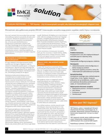 STUDIUM PRZYPADKU | TNT Express - Użyj innowacyjnych narzędzi, aby dokonać transakcyjnych ulepszeń Lean Wewnętrznie zdyscyplinowane projekty DMAIC i innowacyjne narzędzia mogą pomóc zespołom znaleźć lepsze rozwiązania. Strumień wartości lub inna analiza Lean pomaga zidentyfikować główne przeszkody dla płynności w procesie. Ulepszenie projektów przy użyciu narzędzi Lean w środowisku transakcyjnym (np. w biurze) jest skonfrontowane z następującym problemem: zespoły Lean nie mają metodologii do konsekwentnego rozwiązywania problemu usuwania przeszkód ze strumienia wartości. Szczególnie na arenie transakcyjnej uczenie i coaching zespołów do wykorzystania innowacyjnych narzędzi mogą być konstruktywne. Wyzwania w środowisku transakcyjnym W ciągu ostatnich 30 lat dopracowane zostały metody Lean i Six Sigma. Najpierw miało to miejsce w środowisku produkcyjnym, a następnie transakcyjnym. Wyzwań dla tego ostatniego jest wiele i właśnie dlatego główne firmy szkoleniowe oferują specjalistyczne zajęcia “transakcyjny Lean” lub „transakcyjny projekt dla Six Sigma”. Najczęściej środowisko produkcyjne jest scharakteryzowane poprzez dane na temat produktów lub procesów produkcyjnych. Jednak, znacznie mniej danych jest zazwyczaj rejestrowanych w biurze. Należą do nich znaczniki czasowe lub natury kategorycznej (np. pracownik A, B lub C). Procesy biurowe mogą być również przerywane - myślenie o kompilacji miesięcznego raportu - i narażane wielozadaniowym pracownikom na politykę wewnętrzną oraz wymagania zewnętrznej zgodności z przepisami. Szczególnie w środowisku biurowym z niskim poziomem dojrzałości, ludzie mogą tak bardzo zaangażować się w złożoność indywidualnych zadań, że nie dostrzegają przepływu procesu bazowego. W takich przypadkach, które są inaczej nazywane “ukrytą fabryką” może okazać się, że bardzo wartościowe osoby myślą, że dodają poprzez dostrzeganie, radzenie sobie i ostatecznie korygowanie wielu różnych typów błędów. TNT Express jest głównym dostawcą usług logistycznych. Aby szybko i konsekwentnie dostarczać przesyłki w jednym z głównym węzłów lotniczych firmy, zespół doskonalenia skupił się na redukcji czasu potrzebnego od przyjęcia przesyłki do gotowości jej wysłania. Proces ten obejmuje również radzenie sobie z pracą z dokumentami: sprawdzanie spójności sztuk fizycznych i dokumentów, odprawy celnej i wprowadzenie danych, aby zarówno klient, jak i firma mogli śledzić 1 wysyłki. Możliwości dla błędów jest w tym procesie wiele. Jeśli one wystąpią, konsekwencje mogą być poważne, szczególnie gdy gotowość do wysyłki jest błędnie podana dla przewozów towarów, które muszą być sprawdzone poprzez Urząd Celny, zanim wysyłka może być kontynuowana. Proces charakteryzuje się również wysoką interakcją wśród pracowników biura oraz magazynowych, gdzie ma miejsce fizyczna wysyłka. W tym kontekście innowacyjne narzędzia, takie jak The Innovator’s Toolkit (Wiley, 2008), Davida Silversteina, Philipa Samuela i Neila DeCarlo pomagają zespołom przezwyciężyć przeszkody bardziej konsekwentnie. Naucz ludzi, aby widzieli swoje procesy Projekt TNT skupił się na procesie, który przeszedł kilka prób poprawy w ciągu ostatnich kilku lat. Przegląd dokumentacji tego projektu pokazał, że próby te skoncentrowane były bardziej na wydajności kroków indywidualnych procesów niż na konsekwentnym ulepszaniu wydajności procesu od końca do końca. Aby zwiększyć szanse na osiągnięcie sukcesu, zespół zdecydował się na skorzystanie z metodologii Zdefiniuj, Zmierz, Zanalizuj, Ulepsz i Kontroluj (DMAIC). Znaleźli oni mierzenie pracochłonności fazy, szczególnie gdy zespół pracował nad stworzeniem mapy procesu bazującego na obserwacjach i rozmowach. Obserwując osoby wykonujące swoje zadania naprzeciw ekranów komputerowych, zespół zobaczył ich umiejętnie poruszających się pomiędzy bazami danych, Internetem, plikami Excel i innymi dokumentami. Jednak, ponieważ zespół nie miał konkretnej wiedzy na temat obszaru, jego członkowie nie byli w stanie zrozumieć zadań, które te osoby faktycznie wykonywały. Na przykład, podczas rozmów poznali osoby potrzebujące otworzyć bazę danych A, aby znaleźć liczbę sztuk, jako wyniki skanowania z procedury przyjęcia. Pracownicy następnie przechodzili do bazy danych B i sprawdzali w niej wyszczególnione sztuki. Gdy oba wyniki nie pasowały do siebie, wyszukiwanie było podejmowane w bazie danych C lub w zależności od typu wysyłki, w aplikacji internetowej. Jedynie po uporczywych rozmowach zespół zrozumiał, że te zadania tworzą razem etap procesu “sprawdzania fizycznej spójności sztuk obecnych PODSUMOWANIE Branża Logistyka Problem biznesowy Przyśpieszenie czasu dla międzynarodowych przesyłek poprzez odprawę celną Metodologia Dopasowana konfiguracja programu szkolenia Rozwiązanie • Zakwestionowanie samej konfiguracji, w której występuje problem • Stworzenie zgodnej procedury celnej dla niekompletnych jednostkowych przesyłek Korzyści/rezultaty Zmniejszenie średniego czasu realizacji poprzez Urząd Celny z 14 do 7 godzin. Krytyczne połączenia nie są nieodebrane, a jedna osoba jest uwolniona dla bardziej wartościowych zadań, niż “przeszukiwanie sieci.” Wykorzystane kluczowe narzędzia • Mapowanie procesu i strumienia wartości • Głos klienta • Kreatywne wyzwanie • Standaryzacja Kim jest TNT Express? TNT Express, jedna z największych firmach ekspresowej dostawy, upewniająca się, że przesyłki, dokumenty i pozycje frachtowe są dostarczane bezpiecznie i na czas na całym świecie. TNT zapewnia szeroki zakres zdefiniowanego czasu i ekspresowe usługi dostawy w zdefiniowanym dniu w ponad 200 krajach. Kapitalizacja rynkowa: 5 bilionów Euro. BMGI in Europe | +44 (0) 8703 892 221 | [email protected] | www.bmgi.com/pl | © BMGI