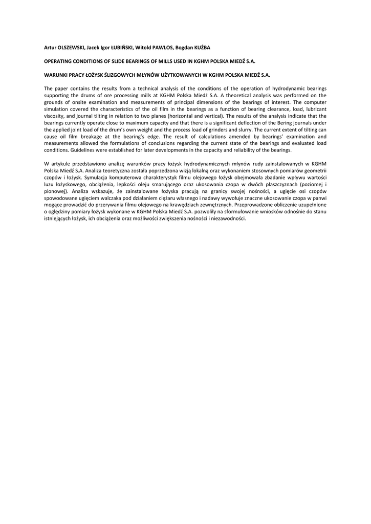 Artur OLSZEWSKI, Jacek Igor ŁUBIŃSKI, Witold PAWLOS, Bogdan KUŹBA OPERATING CONDITIONS OF SLIDE BEARINGS OF MILLS USED IN KGHM POLSKA MIEDŹ S.A. WARUNKI PRACY ŁOŻYSK ŚLIZGOWYCH MŁYNÓW UŻYTKOWANYCH W KGHM POLSKA MIEDŹ S.A. The paper contains the results from a technical analysis of the conditions of the operation of hydrodynamic bearings supporting the drums of ore processing mills at KGHM Polska Miedź S.A. A theoretical analysis was performed on the grounds of onsite examination and measurements of principal dimensions of the bearings of interest. The computer simulation covered the characteristics of the oil film in the bearings as a function of bearing clearance, load, lubricant viscosity, and journal tilting in relation to two planes (horizontal and vertical). The results of the analysis indicate that the bearings currently operate close to maximum capacity and that there is a significant deflection of the Bering journals under the applied joint load of the drum’s own weight and the process load of grinders and slurry. The current extent of tilting can cause oil film breakage at the bearing’s edge. The result of calculations amended by bearings’ examination and measurements allowed the formulations of conclusions regarding the current state of the bearings and evaluated load conditions. Guidelines were established for later developments in the capacity and reliability of the bearings. W artykule przedstawiono analizę warunków pracy łożysk hydrodynamicznych młynów rudy zainstalowanych w KGHM Polska Miedź S.A. Analiza teoretyczna została poprzedzona wizją lokalną oraz wykonaniem stosownych pomiarów geometrii czopów i łożysk. Symulacja komputerowa charakterystyk filmu olejowego łożysk obejmowała zbadanie wpływu wartości luzu łożyskowego, obciążenia, lepkości oleju smarującego oraz ukosowania czopa w dwóch płaszczyznach (poziomej i pionowej). Analiza wskazuje, że zainstalowane łożyska pracują na granicy swojej nośności, a ugięcie osi czopów spowodowane ugięciem walczaka pod działaniem ciężaru własnego i nadawy wywołuje znaczne ukosowanie czopa w panwi mogące prowadzić do przerywania filmu olejowego na krawędziach zewnętrznych. Przeprowadzone obliczenie uzupełnione o oględziny pomiary łożysk wykonane w KGHM Polska Miedź S.A. pozwoliły na sformułowanie wniosków odnośnie do stanu istniejących łożysk, ich obciążenia oraz możliwości zwiększenia nośności i niezawodności.