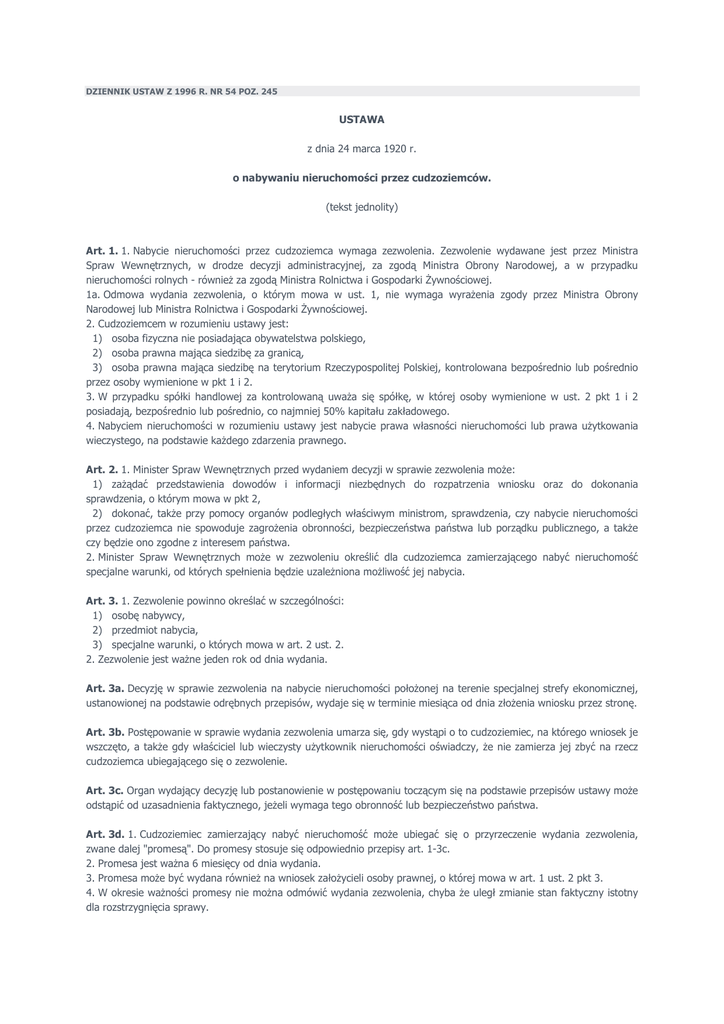 DZIENNIK USTAW Z 1996 R. NR 54 POZ. 245 USTAWA z dnia 24 marca 1920 r. o nabywaniu nieruchomości przez cudzoziemców. (tekst jednolity) Art. 1. 1. Nabycie nieruchomości przez cudzoziemca wymaga zezwolenia. Zezwolenie wydawane jest przez Ministra Spraw Wewnętrznych, w drodze decyzji administracyjnej, za zgodą Ministra Obrony Narodowej, a w przypadku nieruchomości rolnych - równieŜ za zgodą Ministra Rolnictwa i Gospodarki śywnościowej. 1a. Odmowa wydania zezwolenia, o którym mowa w ust. 1, nie wymaga wyraŜenia zgody przez Ministra Obrony Narodowej lub Ministra Rolnictwa i Gospodarki śywnościowej. 2. Cudzoziemcem w rozumieniu ustawy jest: 1) osoba fizyczna nie posiadająca obywatelstwa polskiego, 2) osoba prawna mająca siedzibę za granicą, 3) osoba prawna mająca siedzibę na terytorium Rzeczypospolitej Polskiej, kontrolowana bezpośrednio lub pośrednio przez osoby wymienione w pkt 1 i 2. 3. W przypadku spółki handlowej za kontrolowaną uwaŜa się spółkę, w której osoby wymienione w ust. 2 pkt 1 i 2 posiadają, bezpośrednio lub pośrednio, co najmniej 50% kapitału zakładowego. 4. Nabyciem nieruchomości w rozumieniu ustawy jest nabycie prawa własności nieruchomości lub prawa uŜytkowania wieczystego, na podstawie kaŜdego zdarzenia prawnego. Art. 2. 1. Minister Spraw Wewnętrznych przed wydaniem decyzji w sprawie zezwolenia moŜe: 1) zaŜądać przedstawienia dowodów i informacji niezbędnych do rozpatrzenia wniosku oraz do dokonania sprawdzenia, o którym mowa w pkt 2, 2) dokonać, takŜe przy pomocy organów podległych właściwym ministrom, sprawdzenia, czy nabycie nieruchomości przez cudzoziemca nie spowoduje zagroŜenia obronności, bezpieczeństwa państwa lub porządku publicznego, a takŜe czy będzie ono zgodne z interesem państwa. 2. Minister Spraw Wewnętrznych moŜe w zezwoleniu określić dla cudzoziemca zamierzającego nabyć nieruchomość specjalne warunki, od których spełnienia będzie uzaleŜniona moŜliwość jej nabycia. Art. 3. 1. Zezwolenie powinno określać w szczególności: 1) osobę nabywcy, 2) przedmiot nabycia, 3) specjalne warunki, o których mowa w art. 2 ust. 2. 2. Zezwolenie jest waŜne jeden rok od dnia wydania. Art. 3a. Decyzję w sprawie zezwolenia na nabycie nieruchomości połoŜonej na terenie specjalnej strefy ekonomicznej, ustanowionej na podstawie odrębnych przepisów, wydaje się w terminie miesiąca od dnia złoŜenia wniosku przez stronę. Art. 3b. Postępowanie w sprawie wydania zezwolenia umarza się, gdy wystąpi o to cudzoziemiec, na którego wniosek je wszczęto, a takŜe gdy właściciel lub wieczysty uŜytkownik nieruchomości oświadczy, Ŝe nie zamierza jej zbyć na rzecz cudzoziemca ubiegającego się o zezwolenie. Art. 3c. Organ wydający decyzję lub postanowienie w postępowaniu toczącym się na podstawie przepisów ustawy moŜe odstąpić od uzasadnienia faktycznego, jeŜeli wymaga tego obronność lub bezpieczeństwo państwa. Art. 3d. 1. Cudzoziemiec zamierzający nabyć nieruchomość moŜe ubiegać się o przyrzeczenie wydania zezwolenia, zwane dalej "promesą". Do promesy stosuje się odpowiednio przepisy art. 1-3c. 2. Promesa jest waŜna 6 miesięcy od dnia wydania. 3. Promesa moŜe być wydana równieŜ na wniosek załoŜycieli osoby prawnej, o której mowa w art. 1 ust. 2 pkt 3. 4. W okresie waŜności promesy nie moŜna odmówić wydania zezwolenia, chyba Ŝe uległ zmianie stan faktyczny istotny dla rozstrzygnięcia sprawy. Art. 3e. 1. Nabycie lub objęcie przez cudzoziemca udziałów lub akcji w spółce handlowej z siedzibą na terytorium Rzeczypospolitej Polskiej, będącej właścicielem lub wieczystym uŜytkownikiem nieruchomości, wymaga zezwolenia Ministra Spraw Wewnętrznych, jeŜeli: 1) w wyniku nabycia lub objęcia udziałów lub akcji spółka stanie się spółką kontrolowaną w rozumieniu art. 1 ust. 3; 2) spółka jest spółką kontrolowaną, a udziały lub akcje nabywa lub obejmuje cudzoziemiec nie będący udziałowcem lub akcjonariuszem spółki. 2. Przepis ust. 1 nie dotyczy przypadków, gdy spółka jest właścicielem lub wieczystym uŜytkownikiem nieruchomości określonej w art. 8 ust. 1 pkt 1 i 5 lub ust. 2, z zastrzeŜeniem art. 8 ust. 3. 3. Minister Spraw Wewnętrznych na wniosek spółki, o której mowa w ust. 1, moŜe udzielić zezwolenia na nabywanie lub obejmowanie w niej udziałów lub akcji przez cudzoziemców, jeŜeli nie występuje prawdopodobieństwo zagroŜenia obronności, bezpieczeństwa państwa lub porządku publicznego, a takŜe gdy będzie to zgodne z interesem państwa. W takim przypadku przepisu ust. 1 nie stosuje się. 4. Do zezwoleń, o których mowa w ust. 1, przepisy art. 1-3d stosuje się odpowiednio. Art. 4. Minister Spraw Wewnętrznych przedstawia Sejmowi corocznie, w terminie do dnia 31 marca, szczegółowe sprawozdanie z realizacji ustawy, a w szczególności o liczbie udzielonych zezwoleń, rodzaju i obszarze oraz terytorialnym rozmieszczeniu nieruchomości, których one dotyczą, liczbie decyzji odmawiających udzielenia zezwolenia oraz o zasadach, jakimi kierowano się przy podejmowaniu decyzji. Art. 5. Bez przedstawienia zezwolenia Ministra Spraw Wewnętrznych, a w przypadku ustanowienia w zezwoleniu specjalnych warunków - takŜe dowodu z dokumentu urzędowego o ich spełnieniu, nie moŜna dokonywać czynności prawnych oraz wpisów prawa własności i prawa uŜytkowania wieczystego. Art. 6. 1. Nabycie nieruchomości przez cudzoziemca wbrew przepisom ustawy jest niewaŜne. 2. W razie nabycia nieruchomości wbrew przepisom ustawy, o niewaŜności nabycia orzeka sąd takŜe na Ŝądanie wójta (burmistrza, prezydenta miasta) lub kierownika urzędu rejonowego, właściwych ze względu na miejsce połoŜenia nieruchomości, albo na Ŝądanie Ministra Spraw Wewnętrznych. 3. Przepisy ust. 1 i 2 stosuje się odpowiednio do nabycia lub objęcia udziałów lub akcji w spółce handlowej wbrew przepisom art. 3e, z tym Ŝe Ŝądanie, o 