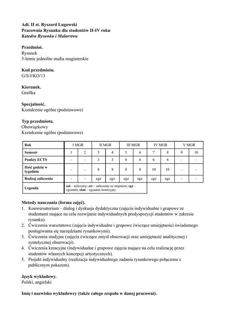Adi. II st. Ryszard Ługowski Pracownia Rysunku dla studentów II-IV roku Katedra Rysunku i Malarstwa Przedmiot. Rysunek 5-letnie jednolite studia magisterskie Kod przedmiotu. G/S/J/KO/13 Kierunek. Grafika Specjalność. Kształcenie ogólne (podstawowe) Typ przedmiotu. Obowiązkowy Kształcenie ogólne (podstawowe) Rok I MGR II MGR III MGR IV MGR V MGR Semestr 1 2 3 4 5 6 7 8 9 10 Punkty ECTS – – 3 3 6 6 6 6 – – Ilość godzin w tygodniu – – 8 8 8 8 10 10 – – Rodzaj zaliczenia – – egz egz egz egz egz egz – – Legenda zal – zaliczony; zst – zaliczenie ze stopniem; egz – egzamin; ekm – egzamin komisyjny Metody nauczania (forma zajęć). 1. Konwersatorium – dialog i dyskusja dydaktyczna (zajęcia indywidualne i grupowe ze studentami mające na celu rozwijanie indywidualnych predyspozycji studentów w zakresie rysunku). 2. Ćwiczenia warsztatowe (zajęcia indywidualne i grupowe ćwiczące umiejętności świadomego posługiwania się narzędziami rysunkowymi). 3. Ćwiczenia studyjne (zajęcia ćwiczące zmysł obserwacji oraz umiejętność analitycznej i syntetycznej obserwacji). 4. Ćwiczenia kreacyjne (indywidualne i grupowe zajęcia mające na celu realizację przez studentów własnych koncepcji artystycznych). 5. Projekt indywidualny (realizacja indywidualnego zadania rysunkowego połączona z publicznym pokazem). Język wykładowy. Polski, angielski Imię i nazwisko wykładowcy (także całego zespołu w danej pracowni). adi. II st. Ryszard Ługowski mgr Aleksander Myjak Wymagania wstępne. Zaliczony komisyjny przegląd po pierwszym roku studiów. Wymagania końcowe. 1. Umiejętność oryginalnej, autorskiej wypowiedzi artystycznej w obrębie rysunku. 2. Świadome stosowanie warsztatu rysunkowego we własnej wypowiedzi artystycznej. 3. Zaliczenie połączone z oceną oryginalności wypowiedzi artystycznej na przeglądzie kończącym każdy semestr studiów. 4. Publiczna prezentacja własnej twórczości podczas wystawy każdorazowo podsumowującej rok akademicki. Treści programowe nauczania (treść zajęć). Nauka osobistego postrzeganie świata jako droga do poszukiwania twórczego języka sztuki. Wykształcenie umiejętności analitycznego i syntetycznego rozwiązywania problemów artystycznych. Twórcze podejście do materiału, przełamanie klasycznego paradygmatu sztuki. Nauka realizowania projektów na zadany temat – np: ,,gra jako forma szeroko rozumianej aktywności artystycznej”. W zależności od odpowiedzi studenta na zadany temat, pozostałe problemy stawiane są indywidualnie do możliwości i wrażliwości studenta. Dialog rysunku z przestrzenią, jako działanie w przestrzeni „realnej”. Dialog rysunku z obiektem. Dialog rysunku z filmem video. Dialog rysunku z działaniem performatywnym. Rysunek jako proces w czasie; dziennik, pamiętnik, zapis akcji. Budowa przestrzeni rysunkowej środkami niekonwencjonalnymi dla technik klasycznych rysunku. Społeczne treści przekazu obrazowego jako zaangażowanie artysty w dyskurs o współczesnym świecie. Praca na młodszych latach będzie prowadzona przede wszystkim w oparciu o obserwacje. Ćwiczenia z wykorzystaniem obecności modela: studium postaci, które może stać się portretem psychologicznym, studium postaci jako autorski komunikat, studium postaci jako pretekst do eksperymentów formalnych (collage, frottage, inne narzędzia – inne środki wyrazu), postać jako „konieczny“ element obrazu. Ćwiczenia będące próbą rozpoznania podstawowych elementów rysunkowego zapisu: linia, punkt, plama, płaszczyzna oraz kompozycja jako cel rysunkowych rozważań , wielość przestrzeni rysunku, energia rysunku, przypadek w rysunku. Ćwiczenia dotyczące możliwości użycia przedmiotu i jego wizerunku w akcie rysowania. Przedmiot zobaczony, przedmiot w zróżnicowanych układach przestrzennych (kompozycje wieloelementowe z natury, z wyobraźni, rysunki układu przestrzennego w negatywie itp.), przedmiot realny – obiekt. Ćwiczenia, które dotykać mogą wszelkich możliwych związków z pojęciem czasu, przemijania, przestrzeni. Starsze lata będą miały większą dowolność, ćwiczenia zadawane będą mogły być realizowane w innych technikach wywodzących się od szeroko rozumianego rysunku. Kształtowanie umiejętności łączenia najnowszych technik i mediów z tradycyjnym warsztatem artystycznym. Kształcenie umiejętności kreowania przestrzeni wizualnej z autonomicznym wykorzystaniem technologii cyfrowych: audio, wideo i fotograficznych. Poszukiwanie indywidualnych, pozarysunkowych środków wypowiedzi uzupełniających, dopełniających lub zastępujących rysunek. Nabycie umiejętności prowadzenia działań artystycznych na bazie rysunku w kontekście społecznym. Kryteria oceny. 1. Ocena aktywnego uczestnictwa w procesie dydaktycznym. 2. Ocena poziomu realizacji obligatoryjnych ćwiczeń po konsultacji z prowadzącym zajęcia. 3. Ocena poziomu artystycznego i warsztatowego prac wykonanych przez studenta i osiągniętych w nich rezultatów twórczych podczas przeglądów semestralnych. 4. Skala ocen określona jest według obowiązującej na Wydziale Grafiki skali punktacji. Praca magisterska. Pracownia nie jest pracownią dyplomującą, natomiast istnieje możliwość wykonania aneksu rysunkowego do dyplomowej pracy magisterskiej. Aneks rysunkowy jest indywidualnym projektem o wysokich walorach artystycznych i jest niezależny od właściwej pracy magisterskiej. O gotowości studenta do wykonania aneksu decyduje Komisja dyplomowa na wniosek prowadzącego pracownię. Ta sama Komisja dyplomowa dokonuje oceny aneksu podczas publicznej prezentacji w chwili obrony pracy magisterskiej. Literatura (piśmiennictwo). 1. Francois Julien, Pochwała nieokreśloności. Zapiski o myśli i estetyce, Wydawnictwo Uniwersytetu Jagiellońskiego, Kraków 2007 2. Jasiński Bogusław, Estetyka po estetyce, Ethos, Warszawa, 2008 3. Anna Ambroziakowa, Obraz i metanarracje, Instytut Kultur