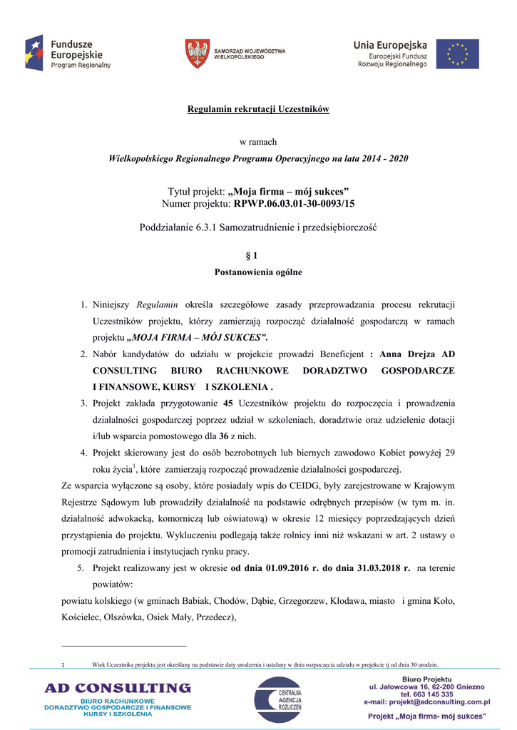 Regulamin rekrutacji Uczestników w ramach Wielkopolskiego Regionalnego Programu Operacyjnego na lata 2014 - 2020 Tytuł projekt: „Moja firma – mój sukces” Numer projektu: RPWP.06.03.01-30-0093/15 Poddziałanie 6.3.1 Samozatrudnienie i przedsiębiorczość §1 Postanowienia ogólne 1. Niniejszy Regulamin określa szczegółowe zasady przeprowadzania procesu rekrutacji Uczestników projektu, którzy zamierzają rozpocząć działalność gospodarczą w ramach projektu „MOJA FIRMA – MÓJ SUKCES”. 2. Nabór kandydatów do udziału w projekcie prowadzi Beneficjent : Anna Drejza AD CONSULTING BIURO RACHUNKOWE DORADZTWO GOSPODARCZE I FINANSOWE, KURSY I SZKOLENIA . 3. Projekt zakłada przygotowanie 45 Uczestników projektu do rozpoczęcia i prowadzenia działalności gospodarczej poprzez udział w szkoleniach, doradztwie oraz udzielenie dotacji i/lub wsparcia pomostowego dla 36 z nich. 4. Projekt skierowany jest do osób bezrobotnych lub biernych zawodowo Kobiet powyżej 29 roku życia1, które zamierzają rozpocząć prowadzenie działalności gospodarczej. Ze wsparcia wyłączone są osoby, które posiadały wpis do CEIDG, były zarejestrowane w Krajowym Rejestrze Sądowym lub prowadziły działalność na podstawie odrębnych przepisów (w tym m. in. działalność adwokacką, komorniczą lub oświatową) w okresie 12 miesięcy poprzedzających dzień przystąpienia do projektu. Wykluczeniu podlegają także rolnicy inni niż wskazani w art. 2 ustawy o promocji zatrudnienia i instytucjach rynku pracy. 5. Projekt realizowany jest w okresie od dnia 01.09.2016 r. do dnia 31.03.2018 r. na terenie powiatów: powiatu kolskiego (w gminach Babiak, Chodów, Dąbie, Grzegorzew, Kłodawa, miasto i gmina Koło, Kościelec, Olszówka, Osiek Mały, Przedecz), 1 Wiek Uczestnika projektu jest określany na podstawie daty urodzenia i ustalany w dniu rozpoczęcia udziału w projekcie tj od dnia 30 urodzin. powiatu konińskiego ( w gminach Golina, Grodziec, Kazimierz Biskupi, Kleczew, Kramsk, Krzymów, Rychwał, Rzgów, Skulsk, Stare Miasto, Ślesin, Wierzbinek, Wilczyn, Sompolno , w mieście Konin), powiatu gnieźnieńskiego (w gminie Kiszkowo), powiatu tureckiego (w gminach Brudzew, Dobra, Kawęczyn, Malanów, Przykona, Tuliszków, Turek – miasto i gmina, Władysławów), powiatu wrzesińskiego (w gminach Miłosław, Pyzdry), powiatu słupeckiego (w gminie Orchowo). 6. Regulamin rekrutacji uczestników oraz Formularz rekrutacyjny podawany jest do publicznej wiadomości na stronie internetowej www.adconsulting.com.pl oraz w biurze projektu Beneficjenta. 7. Uczestnicy Projektu, zobowiązani są do przekazania informacji dotyczących ich sytuacji po zakończeniu udziału w Projekcie (do 4 tygodni od zakończenia udziału). §2 Proces rekrutacji 1. Nabór Uczestników projektu odbywa się przed planowanym etapem szkoleniowo-doradczym. 2. Rekrutacja prowadzona jest przez Komisję Oceny Koncepcji Biznesowych, powoływaną przez Beneficjenta,w składzie: - Doradca Zawodowy - Doradca Zawodowy - Ekspert w zakresie przedsiębiorczości - Ekspert w zakresie przedsiębiorczości - Ekspert w zakresie przedsiębiorczości - Ekspert w zakresie przedsiębiorczości. 3. Rekrutacja prowadzona jest w terminie od dnia 01.09.2016 r. do dnia 30.09.2016 r. z możliwością przedłużenia. 4. Termin podany w pkt. 3 umieszczany jest na stronie internetowej www.adconsulting.com.pl. 5. Formularze rekrutacyjne złożone poza terminem rekrutacji, podanym na stronie internetowej, nie podlegają ocenie w procesie rekrutacji. 6. Informacje o wszystkich etapach realizacji projektu, w tym w szczególności dotyczące rekrutacji, umieszczane są na bieżąco na stronie internetowej. 7. W przypadku niewyłonienia spośród zgłoszonych aplikacji, wymaganej liczby Uczestników projektu lub w przypadku dużej liczby złożonych Formularzy rekrutacyjnych termin rekrutacji i/lub oceny może zostać zmieniony. Informacja o zmianie terminu, przedłużeniu lub zakończeniu rekrutacji jest umieszczana na stronie internetowej www.adconsulting.com.pl . 8. Beneficjent zastrzega sobie możliwość zawieszenia naboru kandydatów, w przypadku gdy liczba złożonych Formularzy rekrutacyjnych przekroczy 80. 9. Rekrutacja do projektu odbywa się dwuetapowo: - I etap: ocena formalna Formularza rekrutacyjnego oraz ocena merytoryczna Formularza rekrutacyjnego pod kątem planowanej działalności gospodarczej, prowadzona przez Komisję rekrutacyjną w postaci 2 ekspertów w zakresie przedsiębiorczości. - II etap: weryfikacja predyspozycji (w tym np. osobowościowych, poziom motywacji, samodzielność, przedsiębiorczość, odpowiedzialność, umiejętność planowania i analitycznego myślenia, sumienność) do samodzielnego założenia i prowadzenia działalności gospodarczej, przeprowadzana przez doradcę zawodowego. 10. Osoby zainteresowane udziałem w projekcie składają w biurze projektu, w siedzibie AD CONSULTING BIURO RACHUNKOWE DORADZTWO GOSPODARCZE I FINANSOWE, KURSY I SZKOLENIA, 62-200 Gniezno, ul. Jałowcowa 16, tel. + 48 663 145 335,w określonym terminie, wypełniony i podpisany Formularz rekrutacyjny. 11. Formularz rekrutacyjny składany jest za pośrednictwem poczty/firmy kurierskiej lub dostarczany jest osobiście do biura projektu : 663 145 335 , uznaje się dzień, 12. W 62-200 Gniezno, ul. Jałowcowa 16, tel. +48 w godzinach od 8.00 do 15.00. Za dzień złożenia Formularza rekrutacyjnego w którym formularz zostanie złożony u Beneficjenta. przypadku osobistego złożenia dokumentów rekrutacyjnych kandydat otrzymuje poświadczenie wpływu opatrzone datą przyjęcia. Dokumenty nie podlegają rozpatrzeniu, gdy zostaną złożone przed ogłoszonym terminem rekrutacji , bądź po zamknięciu rekrutacji. 13. Formularz rekrutacyjny dostępny jest na stronie internetowej www.adconsulting.com.pl oraz w biurze projektu : 62-200 Gniezno, ul. Jałowcowa 16 , tel. + 48 663 145 335, w godzinach od 8.00 do 15.00. 14. Formularz rekrutacyj