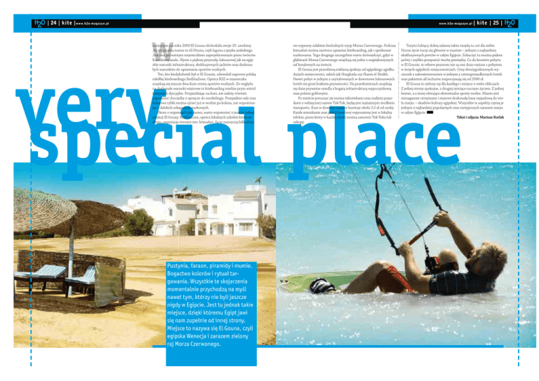 | 24 | kite |www.h2o-magazyn.pl www.h2o-magazyn.pl W minionym już roku 2009 El Gouna obchodziła swoje 20. urodziny. Jej oryginalna nazwa to Al-Dżuna, czyli laguna z języka arabskiego. Jest ona prywatnym miasteczkiem zaprojektowanym przez twórców Eurodisneylandu. Słynie z pięknej przyrody, luksusowej jak na egipskie warunki infrastruktury, ekskluzywnych jachtów oraz doskonałych warunków do uprawiania sportów wodnych. Ten, kto kiedykolwiek był w El Gounie, odwiedził zapewne polską szkółkę kiteboardingu RedSeaZone. Oprócz RSZ w miasteczku znajdują się jeszcze dwa duże centra sportów wodnych. Ze względu na doskonałe warunki wiatrowe to kiteboarding wiedzie prym wśród tutejszych dyscyplin. Przyjeżdżając na kurs, nie należy również zapomnieć chociażby o sprzęcie do snorkelingu. Przepiękne rafy oraz kolorowe rybki można ujrzeć już w wodzie po kolana, nie wspominając o dalekich eskapadach nurkowych. Skoro o wyprawach już mowa, warto wspomnieć o jeszcze jednej atrakcji El Gouny. RedSeaZone, oprócz lokalnych szkoleń kiteboardingu, organizuje również tzw. kitesafari. Są to zazwyczaj kilkudnio- we wyprawy szlakiem bezludnych wysp Morza Czerwonego. Podczas kitesafari można zarówno uprawiać kiteboarding, jak i spróbować nurkowania. Tego drugiego szczególnie warto doświadczyć, gdyż w głębinach Morza Czerwonego znajdują się jedne z najpiękniejszych raf koralowych na świecie. El Gouna jest prawdziwą enklawą spokoju od egipskiego zgiełku dużych miejscowości, takich jak Hurghada czy Sharm el Sheikh. Nawet pobyt w jednym z usytułowanych w downtown luksusowych hoteli nie grozi brakiem prywatności. Na przedmieściach znajdują się duże prywatne osiedla z bogatą infrastrukturą wypoczynkową oraz polami golfowymi. Po mieście poruszać się można taksówkami oraz małymi pojazdami o wdzięcznej nazwie Tok-Tok, będącymi najtańszym środkiem transportu. Kurs w dowolne miejsce kosztuje około 2,5 zł od osoby. Każde mieszkanie oraz pokój hotelowy wyposażony jest w lokalny telefon, przez który w każdej chwili można zamówić Tok-Toka lub zakupy. Turyści lubiący dobrą zabawę także znajdą tu coś dla siebie. Nocne życie toczy się głównie w marinie – jednym z najbardziej ekskluzywnych portów w całym Egipcie. Zobaczyć tu można piękne jachty i szybko przepuścić trochę pieniędzy. Co do kosztów pobytu w El Gounie, to wbrew pozorom nie są one dużo wyższe z pobytem w innych egipskich miejscowościach. Ceny dwutygodniowych wycieczek z zakwaterowaniem w jednym z czterogwiazdkowych hoteli oraz pakietem all inclusive rozpoczynają się od 2000 zł. El Gouna to zielony raj dla każdego i miejsce o wielu obliczach. Z jednej strony spokojne, z drugiej tętniące nocnym życiem. Z jednej leniwe, a z innej oferujące ekstremalne sporty wodne. Miasto jest nienagannie utrzymane i stanowi doskonałą bazę wypadową do wielu miejsc – skarbów kultury egipskiej. Wszystkie te aspekty czynią je jednym z najbardziej popularnych oraz nietypowych zarazem miejsc w całym Egipcie. ❚❚❚❚❚ Tekst i zdjęcia: Mariusz Korlak very special place Pustynia, faraon, piramidy i mumie. Bogactwo kolorów i rytuał targowania. Wszystkie te skojarzenia momentalnie przychodzą na myśl nawet tym, którzy nie byli jeszcze nigdy w Egipcie. Jest tu jednak takie miejsce, dzięki któremu Egipt jawi się nam zupełnie od innej strony. Miejsce to nazywa się El Gouna, czyli egipska Wenecja i zarazem zielony raj Morza Czerwonego. | kite | 25 |