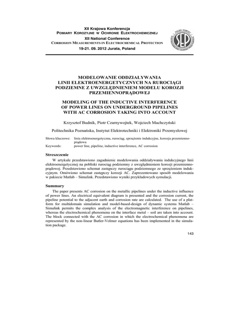 XII Krajowa Konferencja POMIARY KOROZYJNE W OCHRONIE ELEKTROCHEMICZNEJ XII National Conference CORROSION MEASUREMENTS IN ELECTROCHEMICAL PROTECTION 19-21. 09. 2012 Jurata, Poland MODELOWANIE ODDZIAŁYWANIA LINII ELEKTROENERGETYCZNYCH NA RUROCIĄGI PODZIEMNE Z UWZGLĘDNIENIEM MODELU KOROZJI PRZEMIENNOPRĄDOWEJ MODELING OF THE INDUCTIVE INTERFERENCE OF POWER LINES ON UNDERGROUND PIPELINES WITH AC CORROSION TAKING INTO ACCOUNT Krzysztof Budnik, Piotr Czarnywojtek, Wojciech Machczyński Politechnika Poznańska, Instytut Elektrotechniki i Elektroniki Przemysłowej Słowa kluczowe: Keywords: linia elektroenergetyczna, rurociąg, sprzężenie indukcyjne, korozja przemiennoprądowa power line, pipeline, inductive interference, AC corrosion Streszczenie W artykule przedstawiono zagadnienie modelowania oddziaływania indukcyjnego linii elektroenergetycznej na pobliski rurociąg podziemny z uwzględnieniem korozji przemiennoprądowej. Przedstawiono schemat zastępczy rurociągu podziemnego ze sprzężeniem indukcyjnym. Omówiono schemat zastępczy korozji AC. Zaprezentowano sposób modelowania w pakiecie Matlab – Simulink. Przedstawiono wyniki przykładowych symulacji. Summary The paper presents AC corrosion on the metallic pipelines under the inductive influence of power lines. An electrical equivalent diagram is presented and the corrosion current, the pipeline potential to the adjacent earth and corrosion rate are calculated. The use of a platform for multidomain simulation and model-based-design of dynamic systems Matlab – Simulink permits the complex analysis of the electromagnetic interference on pipelines, whereas the electrochemical phenomena on the interface metal – soil are taken into account. The block connected with the AC corrosion in which the electrochemical phenomena are represented by the non-linear Butler-Volmer equations has been implemented in the simulation package. 143 1. Wprowadzenie W rejonach zbliżenia tras rurociągów podziemnych i napowietrznych linii elektroenergetycznych prądu przemiennego istnieje niebezpieczeństwo indukowania się w rurociągu napięć przemiennych o wartościach, które mogą stanowić zagrożenie porażeniowe i korozyjne. Intensywność zjawiska wiąże się ze stosowaniem coraz doskonalszych powłok izolacyjnych rurociągów i nasila się ze wzrostem wartości prądów roboczych linii elektroenergetycznych oraz długości odcinków, na jakich następuje zbliżenie tras [1, 2]. Pierwsze przypadki uszkodzeń rurociągów podziemnych korozją przemiennoprądową (AC) zaobserwowano na latach osiemdziesiątych ubiegłego wieku. Charakterystyczną cechą uszkodzenia są lejkowate wżery w ściance rurociągu. Badania i analiza tego zjawiska pozwoliły stwierdzić, że pierwsze przypadki uszkodzeń i realne zagrożenie korozyjne rurociągów pojawiły się wraz ze wzrostem jakości powłok izolacyjnych. W przypadku nowoczesnych powłok, na przestrzeni wielu kilometrów występują nieliczne punktowe uszkodzenia izolacji. Rejestrowane gęstości prądu przemiennego upływającego z rurociągu w miejscu tych uszkodzeń stały się na tyle duże, że zaczęło stanowić to realne zagrożenie [3, 4]. Niniejszy artykuł rozszerza zagadnienie modelowania obwodów ziemnopowrotnych o zjawisko korozji AC, tzn. wywołanej przepływem prądu przemiennego z części stalowej rurociągu mającej kontakt z ziemią. 2. Schemat zastępczy rurociągu podziemnego Rurociąg podziemny znajdujący się w zasięgu zewnętrznego pola elektromagnetycznego, pochodzącego np. od prądu przepływającego w pobliskiej linii elektroenergetycznej, jest obwodem ziemnopowrotnym stykającym się z ziemią przez niedoskonałą izolację. W modelowaniu stosuje się teorię linii długiej. W linii długiej znajdującej się w zewnętrznym polu elektromagnetycznym indukuje się siła elektromotoryczna, która powoduje przepływ prądu wzdłuż linii [1, 2]. Na rys. 1 przedstawiono schemat zastępczy elementarnego odcinka linii długiej o długości ∆L w postaci czwórnika symetrycznego typu π o parametrach skupionych. Wielkości Z0 i Y0 to odpowiednio jednostkowa impedancja wzdłużna oraz jednostkowa admitancja poprzeczna rurociągu podziemnego, które zależą od parametrów rurociągu (wymiarów geometrycznych przekroju poprzecznego rurociągu oraz materiałów, z jakich jest wykonany), właściwości otaczającego gruntu, głębokości ułożenia rurociągu, częstotliwości czynników wymuszających itp. E jest siłą elektromotoryczną indukowaną w odcinku rurociągu o długości ∆L przez czynniki zewnętrzne. Obwód zastępczy rurociągu podziemnego dla warunków quasi-stacjonarnych, powstaje poprzez łańcuchowe połączenie n obwodów elementarnych [1, 2]. Obliczanie siły elektromotorycznej indukowanej w rurociągu wymaga obliczenia impedancji wzajemnej Zm w układzie rurociąg podziemny napowietrzna linia elektroenergetyczna oraz znajomości prądów roboczych I. Impedancja wzajemna zależy od geometrii zbliżenia tras oraz konduktywności gruntu [5, 6]. 3. Korozja przemiennoprądowa Na rys. 2 przedstawiono obwód zastępczy Randlesa dla korozji AC, nieosłoniętej części stalowej rurociągu, narażonej na bezpośredni kontakt z elektrolitem glebowym [7, 8, 9, 10]. 144 Jako e oznaczono potencjał rurociągu względem ziemi bliskiej, v to potencjał rurociągu względem ziemi dalekiej. Wypadkowy prąd wypływający z uszkodzenia ik jest sumą dwóch składowych: ic składowej związanej z obecnością podwójnej warstwy elektrycznej i iF prądu faradajowskiego związanego z kinetyką procesu korozji. Małe litery oznaczają, że są to sygnały zależne od czasu. E Cdl ic (Y0∆L)/2 Rs ik (Y0∆L)/2 rurociąg Z0 ∆L e uRs iF W Zw Rp v ∆L Rys. 1. Schemat zastępczy elementarnego odcinka rurociągu podziemnego Rys. 2. Obwód Randlesa dla korozji AC Rezystancja przejścia RS (rezystancja rozpływu), związana jest z upływem prądu z rurociągu do otaczającego ś