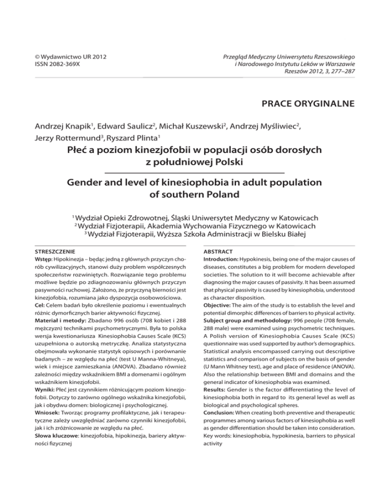 Knapik, Saulicz, Kuszewski, Myśliwiec, Rottermund, Plinta Płeć a poziom kinezjofobii w populacji osób dorosłych z południowej Polski © Wydawnictwo UR 2012 ISSN 2082-369X 277 Przegląd Medyczny Uniwersytetu Rzeszowskiego i Narodowego Instytutu Leków w Warszawie Rzeszów 2012, 3, 277–287 Prace oryginalne Andrzej Knapik1, Edward Saulicz2, Michał Kuszewski2, Andrzej Myśliwiec2, Jerzy Rottermund3, Ryszard Plinta1 Płeć a poziom kinezjofobii w populacji osób dorosłych z południowej Polski Gender and level of kinesiophobia in adult population of southern Poland 1 Wydział Opieki Zdrowotnej, Śląski Uniwersytet Medyczny w Katowicach Wydział Fizjoterapii, Akademia Wychowania Fizycznego w Katowicach 3 Wydział Fizjoterapii, Wyższa Szkoła Administracji w Bielsku Białej 2 Streszczenie Wstęp: Hipokinezja – będąc jedną z głównych przyczyn chorób cywilizacyjnych, stanowi duży problem współczesnych społeczeństw rozwiniętych. Rozwiązanie tego problemu możliwe będzie po zdiagnozowaniu głównych przyczyn pasywności ruchowej. Założono, że przyczyną bierności jest kinezjofobia, rozumiana jako dyspozycja osobowościowa. Cel: Celem badań było określenie poziomu i ewentualnych różnic dymorficznych barier aktywności fizycznej. Materiał i metody: Zbadano 996 osób (708 kobiet i 288 mężczyzn) technikami psychometrycznymi. Była to polska wersja kwestionariusza Kinesiophobia Causes Scale (KCS) uzupełniona o autorską metryczkę. Analiza statystyczna obejmowała wykonanie statystyk opisowych i porównanie badanych – ze względu na płeć (test U Manna-Whitneya), wiek i miejsce zamieszkania (ANOVA). Zbadano również zależności między wskaźnikiem BMI a domenami i ogólnym wskaźnikiem kinezjofobii. Wyniki: Płeć jest czynnikiem różnicującym poziom kinezjofobii. Dotyczy to zarówno ogólnego wskaźnika kinezjofobii, jak i obydwu domen: biologicznej i psychologicznej. Wniosek: Tworząc programy profilaktyczne, jak i terapeutyczne zależy uwzględniać zarówno czynniki kinezjofobii, jak i ich zróżnicowanie ze względu na płeć. Słowa kluczowe: kinezjofobia, hipokinezja, bariery aktywności fizycznej Abstract Introduction: Hypokinesis, being one of the major causes of diseases, constitutes a big problem for modern developed societies. The solution to it will become achievable after diagnosing the major causes of passivity. It has been assumed that physical passivity is caused by kinesiophobia, understood as character disposition. Objective: The aim of the study is to establish the level and potential dimorphic differences of barriers to physical activity. Subject group and methodology: 996 people (708 female, 288 male) were examined using psychometric techniques. A Polish version of Kinesiophobia Causes Scale (KCS) questionnaire was used supported by author’s demographics. Statistical analysis encompassed carrying out descriptive statistics and comparison of subjects on the basis of gender (U Mann Whitney test), age and place of residence (ANOVA). Also the relationship between BMI and domains and the general indicator of kinesiophobia was examined. Results: Gender is the factor differentiating the level of kinesiophobia both in regard to its general level as well as biological and psychological spheres. Conclusion: When creating both preventive and therapeutic programmes among various factors of kinesiophobia as well as gender differentiation should be taken into consideration. Key words: kinesiophobia, hypokinesia, barriers to physical activity