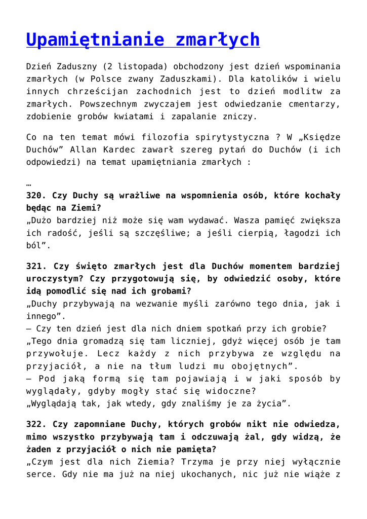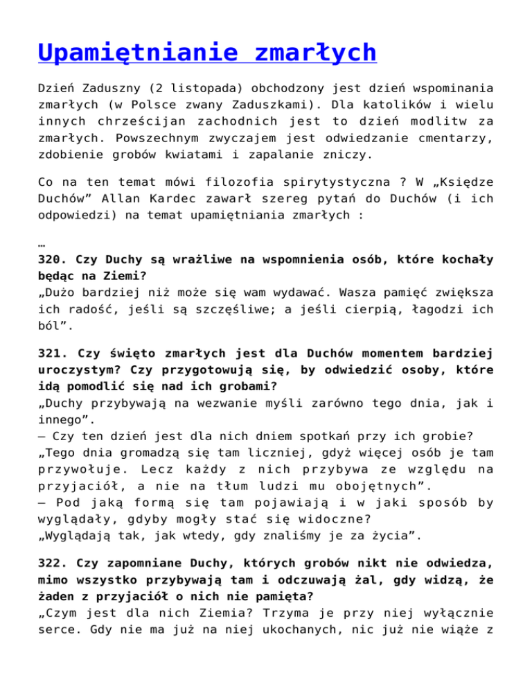 Upamiętnianie zmarłych Dzień Zaduszny (2 listopada) obchodzony jest dzień wspominania zmarłych (w Polsce zwany Zaduszkami). Dla katolików i wielu innych chrześcijan zachodnich jest to dzień modlitw za zmarłych. Powszechnym zwyczajem jest odwiedzanie cmentarzy, zdobienie grobów kwiatami i zapalanie zniczy. Co na ten temat mówi filozofia spirytystyczna ? W „Księdze Duchów” Allan Kardec zawarł szereg pytań do Duchów (i ich odpowiedzi) na temat upamiętniania zmarłych : … 320. Czy Duchy są wrażliwe na wspomnienia osób, które kochały będąc na Ziemi? „Dużo bardziej niż może się wam wydawać. Wasza pamięć zwiększa ich radość, jeśli są szczęśliwe; a jeśli cierpią, łagodzi ich ból”. 321. Czy święto zmarłych jest dla Duchów momentem bardziej uroczystym? Czy przygotowują się, by odwiedzić osoby, które idą pomodlić się nad ich grobami? „Duchy przybywają na wezwanie myśli zarówno tego dnia, jak i innego”. – Czy ten dzień jest dla nich dniem spotkań przy ich grobie? „Tego dnia gromadzą się tam liczniej, gdyż więcej osób je tam przywołuje. Lecz każdy z nich przybywa ze względu na przyjaciół, a nie na tłum ludzi mu obojętnych”. – Pod jaką formą się tam pojawiają i w jaki sposób by wyglądały, gdyby mogły stać się widoczne? „Wyglądają tak, jak wtedy, gdy znaliśmy je za życia”. 322. Czy zapomniane Duchy, których grobów nikt nie odwiedza, mimo wszystko przybywają tam i odczuwają żal, gdy widzą, że żaden z przyjaciół o nich nie pamięta? „Czym jest dla nich Ziemia? Trzyma je przy niej wyłącznie serce. Gdy nie ma już na niej ukochanych, nic już nie wiąże z nią Ducha: wówczas wszechświat stoi przed nim otworem”. 323. Czy kiedy przychodzimy na jego grób Duch cieszy się bardziej niż wtedy, gdy odmawiamy za niego modlitwę w naszym domu? „Odwiedzenie grobu jest sposobem pokazania, że myślimy o nieobecnym Duchu: to pewien obraz. Powiedziałem wam – to modlitwa uświęca pamięć. Nie liczy się miejsce, jeśli modlitwa płynie z serca”. 324. Czy Duchy osób, którym wznosi się statuy i pomniki, uczestniczą w tego rodzaju inauguracjach i przyglądają się im z lubością? „Wiele z nich pojawia się tam, jeśli mogą; są jednak mniej wrażliwe na oddawaną im cześć niż na fakt, że ktoś o nich pamięta”. 325. Skąd u pewnych osób bierze się pragnienie, by zostać pochowanym w danym miejscu, a nie innym? Czy chętniej powracają tam po śmierci? Czy przywiązywanie wagi do materialnej rzeczy jest oznaką niższości ich Ducha? „To oznaka przywiązania Ducha do pewnych miejsc, niższości moralnej. Czym różni się jeden zakątek Ziemi od drugiego w oczach rozwiniętego Ducha? Czyż nie wie, że jego dusza połączy się z tymi, których kocha, choć ich kości znajdują się w różnych miejscach?” – Czy pochowanie w tym samym miejscu szczątków wszystkich członków jednej rodziny powinno być postrzegane jako coś nieistotnego? „Nie. To zwyczaj religijny świadczący o sympatii dla osób, które kochaliśmy. Nawet jeśli to zgromadzenie szczątków nie jest zbyt istotne dla Duchów, dla ludzi pozostaje użyteczne: ich wspomnienia są zebrane w jednym miejscu”. 326. Czy dusza powracająca do życia duchowego jest wrażliwa na honory składane jej szczątkom? „Gdy Duch osiągnął już pewien stopień doskonałości, nie ma w nim już ziemskiej próżności i rozumie jak niewiele znaczą wszystkie te rzeczy. Ale wiedz, że niektóre Duchy w pierwszych chwilach po fizycznej śmierci czerpią ogromną przyjemność z honorów, które są im oddawane i martwią się, że pozostawiły swoją powłokę. Zachowują wciąż niektóre z ziemskich stereotypów”. 327. Czy Duch uczestniczy w swoim pogrzebie? „Bardzo często w nim uczestniczy, ale niekiedy nie zdaje sobie sprawy z tego, co się wówczas dzieje, jeśli wciąż doświadcza zaburzeń”. – Czy pochlebia mu, gdy wiele osób uczestniczy w jego pogrzebie? „Mniej lub bardziej, w zależności od uczuć, które go tam sprowadzają”. 328. Czy Duch niedawno zmarłej osoby uczestniczy w spotkaniach swoich spadkobierców? „Niemal zawsze. Bóg chce, aby w ten sposób nauczył się czegoś i poniósł karę za swoje przewinienia. To tam może ocenić, ile warte były ich zapewnienia; jest w stanie dostrzec wszystkie uczucia, a rozczarowanie, jakie odczuwa, widząc pazerność tych, którzy dzielą się spadkiem na jego grobie, pokazuje mu, co tak naprawdę nimi kieruje. Lecz i na nich przyjdzie czas”. 329. Czy instynktowny szacunek, z jakim w każdej epoce przedstawiciele wszystkich ludów traktowali zmarłych wynika z ich intuicyjnego przeczucia o istnieniu życia po śmierci? „To jego naturalna konsekwencja. W przeciwnym razie ów szacunek byłby bezpodstawny”. Źródło: „Księga Duchów” Allan Kardec