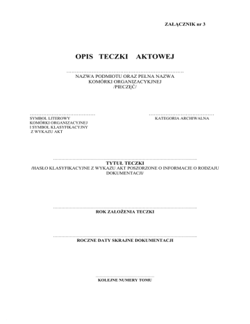 ZAŁĄCZNIK nr 3 OPIS TECZKI AKTOWEJ ……………………………………………………………. NAZWA PODMIOTU ORAZ PEŁNA NAZWA KOMÓRKI ORGANIZACYKJNEJ /PIECZĘĆ/ ………………………………… ………………………………… SYMBOL LITEROWY KOMÓRKI ORGANIZACYJNEJ I SYMBOL KLASYFIKACYJNY Z WYKAZU AKT KATEGORIA ARCHIWALNA …………………………………………………………………………………………. TYTUŁ TECZKI /HASŁO KLASYFIKACYJNE Z WYKAZU AKT POSZORZONE O INFORMACJE O RODZAJU DOKUMENTACJI/ …………………………………………………………………………………………. ROK ZAŁOŻENIA TECZKI …………………………………………………………………………………………. ROCZNE DATY SKRAJNE DOKUMENTACJI …………………………………… KOLEJNE NUMERY TOMU