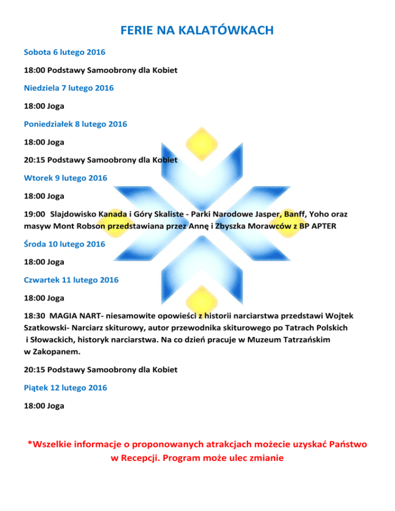 FERIE NA KALATÓWKACH Sobota 6 lutego 2016 18:00 Podstawy Samoobrony dla Kobiet Niedziela 7 lutego 2016 18:00 Joga Poniedziałek 8 lutego 2016 18:00 Joga 20:15 Podstawy Samoobrony dla Kobiet Wtorek 9 lutego 2016 18:00 Joga 19:00 Slajdowisko Kanada i Góry Skaliste - Parki Narodowe Jasper, Banff, Yoho oraz masyw Mont Robson przedstawiana przez Annę i Zbyszka Morawców z BP APTER Środa 10 lutego 2016 18:00 Joga Czwartek 11 lutego 2016 18:00 Joga 18:30 MAGIA NART- niesamowite opowieści z historii narciarstwa przedstawi Wojtek Szatkowski- Narciarz skiturowy, autor przewodnika skiturowego po Tatrach Polskich i Słowackich, historyk narciarstwa. Na co dzień pracuje w Muzeum Tatrzańskim w Zakopanem. 20:15 Podstawy Samoobrony dla Kobiet Piątek 12 lutego 2016 18:00 Joga *Wszelkie informacje o proponowanych atrakcjach możecie uzyskać Państwo w Recepcji. Program może ulec zmianie