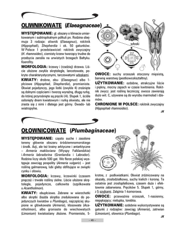 OLIWNIKOWATE (Elaeagnaceae) WYSTĘPOWANIE: gł. obszary o klimacie umiarkowanym i subtropikalnym półkuli pn. Rodzina obejmuje 3 rodzaje: oliwnik (Elaeagnus), rokitnik (Hippophaë), Shepherdia i ok. 50 gatunków. W Polsce 1 przedstawiciel: rokitnik zwyczajny (H. rhamnoides), ciernisty krzew tworzący trudne do przebycia zarośla na urwistych brzegach Bałtyku. Kserofity. MORFOLOGIA: krzewy i (rzadziej) drzewa. Liście ułożone zwykle skrętolegle, lancetowate, pokryte charakterystycznymi, tarczowatymi włoskami. KWIATY: drobne, obu- (Elaeagnus) albo 1płciowe (Hippophaë, Shepherdia), promieniste. Okwiat pojedynczy, jego listki (zwykle 4) zrośnięte są dolnymi częściami i tworzą wyraźną, długą rurkę, do której przyrośnięte są pręciki (4). Słupek 1, ściśle osłonięty dnem kwiatowym i rurką okwiatu, ale nie zrasta się z nimi i dlatego jest górny. Owado- lub wiatropylne. włoski OWOCE: suchy orzeszek otoczony mięsistą, barwną warstwą (pestkowcokształtny). UŻYTKOWANIE: ozdobne, atrakcyjne liście i piękny, mocny zapach w czasie kwitnienia. Rokitnik zwycz. jest rośliną leczniczą; owoce zawierają dużo wit. C, używane są do wyrobu marmolad i dżemów. CHRONIONE W POLSCE: rokitnik zwyczajny (Hippophaë rhamnoides). JK OŁOWNICOWATE (Plumbaginaceae) WYSTĘPOWANIE: często suche i zasolone tereny głównie obszaru śródziemnomorskiego i środk. Azji, ale też krainy arktyczne i antarktyczne – Armeria makloviana (Wyspy Falklandzkie) i Armeria labradorina (Grenlandia i Labrador). Rodzina liczy około 500 gat. We florze polskiej występuje zawciąg pospolity (Armeria vulgaris) – jest rośliną galmanową, lubi gleby obfitujące w związki cynku i ołowiu. MORFOLOGIA: krzewy, krzewinki (czasem pnącza) i trwałe rośliny zielne. Liście ułożone skrętolegle, pojedyncze, całkowite (szpilkowate u Acantholimon). KWIATY: obupłciowe. Zebrane w wierzchotki albo skrętki (każda skrętka zredukowana do pojedynczych kwiatów u Plumbago), najczęściej skupione w główkowate (Armeria), kłosowate (Acantholimon), albo groniaste do wiechowatych (Limonium) kwiatostany złożone. Promieniste, 5- krotne, z podkwiatkami. Okwiat zróżnicowany na okazały, zrosłodziałkowy, suchy kielich i koronę. Ta ostatnia jest zrosłopłatkowa, czasem duża i efektownie zabarwiona. Pręcików 5. Słupek 1, górny, z 5 szyjkami. Zalążnia 1-komorowa. OWOCE: przeważnie orzeszek, 1-nasienny, niepękający; niełupka, torebka. UŻYTKOWANIE: ozdobnie wykorzystywane są gatunki z rodzajów: zawciąg (Armeria), zatrwian (Limonium), ołownica (Plumbago). JK – 45 –