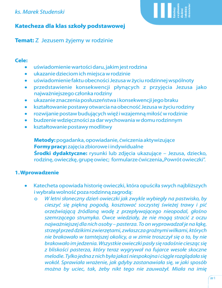 /dla katechetów/ III Katechezy o wychowaniu dla dzieci i młodzieży ks. Marek Studenski Katecheza dla klas szkoły podstawowej Temat: Z Jezusem żyjemy w rodzinie Cele: uświadomienie wartości daru, jakim jest rodzina · · ukazanie dzieciom ich miejsca w rodzinie · uświadomienie faktu obecności Jezusa w życiu rodzinnej wspólnoty · przedstawienie konsekwencji płynących z przyjęcia Jezusa jako najważniejszego członka rodziny · ukazanie znaczenia posłuszeństwa i konsekwencji jego braku · kształtowanie postawy otwarcia na obecność Jezusa w życiu rodziny · rozwijanie postaw budujących więź i wzajemną miłość w rodzinie · budzenie wdzięczności za dar wychowania w domu rodzinnym · kształtowanie postawy modlitwy Metody: pogadanka, opowiadanie, ćwiczenia aktywizujące Formy pracy: zajęcia zbiorowe i indywidualne Środki dydaktyczne: rysunki lub zdjęcia ukazujące – Jezusa, dziecko, rodzinę, owieczkę, grupę owiec; formularze ćwiczenia„Powrót owieczki”. 1. Wprowadzenie · Katecheta opowiada historię owieczki, która opuściła swych najbliższych i wybrała wolność poza rodzinną zagrodą: o W letni słoneczny dzień owieczki jak zwykle wybiegły na pastwisko, by cieszyć się piękną pogodą, kosztować soczystej świeżej trawy i pić orzeźwiającą źródlaną wodę z przepływającego nieopodal, głośno szemrzącego strumyka. Owce wiedziały, że nie mogą stracić z oczu najważniejszej dla nich osoby – pasterza. To on wyprowadzał je na łąkę, strzegł przed dzikimi zwierzętami, zwłaszcza groźnymi wilkami, których nie brakowało w tamtejszej okolicy, a w zimie troszczył się o to, by nie brakowało im jedzenia. Wszystkie owieczki pasły się radośnie ciesząc się z bliskości pasterza, który teraz wygrywał na fujarce wesołe skoczne melodie. Tylko jedna z nich była jakaś niespokojna i ciągle rozglądała się wokół. Sprawiała wrażenie, jak gdyby zastanawiała się, w jaki sposób można by uciec, tak, żeby nikt tego nie zauważył. Miała na imię str 1 Agnieszka. Obok Agnieszki stał• jej ojciec i zatroskana mama. Kochali bardzo swoją córkę i bardzo się o nią martwili. W przeciwieństwie do reszty rodzeństwa, Agnieszka sprawiała im wiele problemów. Także dziś, przed wyjściem z zagrody, upierała się, że chce zostać na miejscu i rodzice musieli długo ją przekonywać, by zgodziła się wyruszyć wraz z nimi na pastwisko. Te problemy nie powodowały jednak, że miłość jaką obdarzali córeczkę była mniejsza. Wręcz przeciwnie – poświęcali jej więcej czasu i uczuć, marząc o tym, że kiedyś dorośnie i przestanie przysparzać im trosk i zmartwień. Nagle rozległ się głuchy huk. Pasterz przestał grać. Owce jakby zamarły ze strachu. Okazało się, że sprawcą tego zamieszania był suchy konar, który złamał się i spadł z trzaskiem na ziemię. Tę chwilę natychmiast wykorzystała Agnieszka – ruszyła pędem przed siebie, minęła polanę, przeskoczyła przez strumyk, i biegła dalej pomiędzy drzewami, chcąc jak najszybciej znaleźć się daleko od swoich rodziców, sióstr i braci, a także pasterza, który ciągle o czymś przypominał i przed czymś przestrzegał. Owieczka stanęła i rozejrzała się wokół. Nie rozpoznawała okolicy, w której się znalazła, nigdy wcześniej tu nie była. Jej uwagę przyciągnęły natomiast czerwone plamki wyraźnie odcinające się od zielonej trawy. Polana pełna była aromatycznych poziomek. Agnieszka zaczęła je kosztować. Były bardzo apetyczne i słodkie. Gdy już nie mogła dłużej jeść, poczuła, że jest zmęczona. Położyła się i zaraz zasnęła. Po przebudzeniu spostrzegła, że na zewnątrz zrobiło się szaro. Było już późne popołudnie. Trzeba wracać do domu – pomyślała owieczka – ale którędy? Z miejsca, w którym się znajdowała odchodziło wiele ścieżek, niestety wszystkie były do siebie podobne. Agnieszka wybrała jedną z nich. Po godzinie drogi w dalszym ciągu nie wiedziała, gdzie się znajduje. Słońce zaczęło zachodzić i robiło się coraz ciemniej. Owieczkę opanował lęk. Żałowała, że uciekła z pastwiska. Tam przecież zostali jej rodzice i rodzeństwo. Jak teraz ma do nich wrócić? Wtem usłyszała dobiegające z daleka złowrogie dźwięki – czyżby w okolicy były wilki? Zaczęła płakać. Pochyliła się ku ziemi, nie mając sił, by iść dalej. Nie wiedziała co robić, była przerażona. Nagle poczuła, że ktoś ją dotknął – podniosła głowę i zobaczyła spoglądające na nią oczy. Od razu rozpoznała ten wzrok - to był pasterz. Objął ją rękami, podniósł z ziemi i wziął na ramiona. Poczuła, że jest bezpieczna i już nic jej nie grozi. Dobry pasterz uśmiechał się pomimo trudnych poszukiwań, które miał za sobą – cieszył się, że ją odnalazł. Weszli na drogę prowadzącą do domu… str 2 Uczący przeprowadza pogadankę utrwalającą treść opowiadania i stawia · następujące pytania: o Kim była Agnieszka i co można powiedzieć o jej rodzinie? o Jaki błąd popełniła owieczka? o Co odczuwała Agnieszka, gdy znalazła się poza swoim stadem? o Jakie niebezpieczeństwa groziły owieczce? o Kto przyszedł Agnieszce z pomocą? o Jakie uczucia zagościły w sercu owieczki, gdy znalazła się z powrotem wśród najbliższych? o Co prawdopodobnie postanowiła Agnieszka po powrocie do domu? 2. Rozwinięcie · Katecheta umieszcza na tablicy (lub na planszy brystolu) obraz owieczki, grupy owiec i pasterza. Prosi kolejnych uczniów o podejście i przyporządkowanie do tych rysunków odpowiednich postaci (dziecko, rodzina, Jezus). Powstaje schemat: OWIECZKA - DZIECKO GRUPA OWIEC - RODZINA PASTERZ - JEZUS · Prowadzący zajęcia stara się uświadomić dzieciom, że podobnie jak bohaterka opowiadania - owieczka Agnieszka – i one mają rodzinę – rodziców i rodzeństwo, którzy ich kochają. Zdarza się jednak, że nie potrafią okazać mił