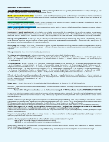 Wyjaśnienia do harmonogramu: Bioodpady – pojemnik, worek koloru czarnego - resztki żywności, przeterminowana żywność, obierki z owoców i warzyw, skorupki jaj, fusy po kawie i herbacie, skoszona trawa, liście, drobne gałęzie, trociny Plastik – pojemnik albo worek żółty - zgniecione i puste butelki po napojach, puste opakowania po kosmetykach, chemii gospodarczej i środkach czystości, czyste kanistry plastikowe, torebki foliowe, plastikowe opakowania po żywności (czyste kubki po jogurtach, koszyczki po owocach), plastikowe zakrętki Szkło – pojemnik albo worek zielony - butelki i szklane opakowania po napojach i żywności, butelki po napojach alkoholowych, słoiki (bez nakrętek, zacisków, gumowych uszczelek, inne opakowania szklane Papier – pojemnik albo worek niebieski - gazety, czasopisma, papier szkolny i biurowy, książki, torebki i worki papierowe, papier pakowy, tektura i kartony, ścinki drukarskie Problemowe – worek przeźroczysty - chemikalia, w tym farby, rozpuszczalniki, oleje odpadowe itd., wszelkiego rodzaju lampy żarowe, halogenowe, świetlówki, opakowania metalowe po olejach, farbach, klejach, środkach owado- i chwastobójczych, aerozolach itd., inne odpady metalowe, tekstylia, w tym ubrania, obuwie – odbierane 3 razy w ciągu roku na zasadzie „wystawek” z miejsc odbierania pozostałych odpadów Odpady wielkogabarytowe - to odpady o dużych lub nietypowych rozmiarach, takie jak: meble (szafy, stoły, krzesła, sofy, komody), dywany, wózki dziecięce, materace, pierzyny, rowery, zabawki dużych rozmiarów, opakowania wielomateriałowe – odbierane 3 razy w ciągu roku na zasadzie „wystawek” z miejsc odbierania pozostałych odpadów Elektryczne - zużyty sprzęt elektryczny i elektroniczny – pralki, lodówki, komputery, telefony, telewizory, radia, odtwarzacze mp3, żelazka, wiertarki, telefony komórkowe i inne podobne sprzęty – odbierane 3 razy w ciągu roku na zasadzie „wystawek” z miejsc odbierania pozostałych odpadów Odpady zmieszane – inne niewymienione odpady problemowe Tu oddasz przeterminowane leki – należy umieszczać w oznaczonych pojemnikach zlokalizowanych: Apteka w Rynku – ul. Rynek 23, Apteka Piastowska – ul. Piastów 5, Apteka Nowa – ul. Teatralna 11, Apteka Pałacowa – ul. Piłsudskiego 2, Apteka Marcus – ul. Szpitalna 2, Apteka Gerber – ul. Świdnicka 40, Apteka Familia – ul. Kłodzka 13, Apteka Centrum – ul. Kłodzka 10a, Apteka Aspirynka – ul. Radkowska 22 Tu oddasz baterie - „HERMES” sklep RTV – ul. Kolejowa 6, Intermarche – ul. Kłodzka 14c, Bricomarche – ul. Kłodzka 14b, Hurtownia elektryczna – ul. Armii Krajowej 15, Urząd Miejski – ul. Rynek 11, Noworudzkie Usługi Komunalne – ul. Żeromskiego 2, Szkoła Podstawowa nr 2 – ul. Sportowa 1a, Szkoła Podstawowa nr 3 – ul. Srebrna 11, Miejski Zespół Szkół nr 1 – ul. Stara Droga 39, Szkoła Podstawowa nr 7 – ul. Szkolna 3, Miejski Zespół Szkół nr 1 – ul. Stara Droga 39, Gimnazjum nr 1 – ul. M. Kopernika 4–6, Gimnazjum nr 2 – ul. Akacjowa 8, Przedszkole Miejskie nr 1 – ul. Kolejowa 15, Przedszkole Miejskie nr 2, Zespól Szkół – ul. Kopernika 3, Zespół Szkół Ponadgimnazjalnych – ul. Stara Droga 4, ZSO – os. Piastowskie 17, Przedszkole Niepubliczne „Bajka” – ul. Słupiecka 5, Przedszkole Niepubliczne Sióstr Salezjanek – ul. Kościelna 13 Odpady z drobnych remontów prowadzonych przez osoby fizyczne – mogą być dostarczone nieodpłatnie, we własnym zakresie, na nieczynne składowisko odpadów komunalnych przy ul. Niepodległości 45 C. Istnieje również możliwość zamówienia płatnego transportu w Noworudzkich Usługach Komunalnych Sp. z o.o. Nr telefonu 74 872 2388 Zużyte opony – Serwis Ogumienia S.C. Urszula Belowska, Zbigniew Belowski, ul. Słupiecka 32 a, 57-402 Nowa Ruda Odbiorem i zagospodarowaniem odpadów komunalnych od właścicieli nieruchomości położonych na terenie Gminy Miejskiej Nowa Ruda zajmuje się firma: Noworudzkie Usługi Komunalne Sp. z o.o., ul. Stefana Żeromskiego 2, 57-400 Nowa Ruda – telefon: 74 872 2388, 74 872 9426 Przypominamy, że do obowiązków właściciela nieruchomości należy wyposażenie jej w pojemnik. Pojemnik może być zakupiony na własność lub udostępniony odpłatnie (wydzierżawiony) od firmy odbierającej odpady na zlecenie gminy lub od innej firmy, która w swojej ofercie posiada taką usługę. Osobom zainteresowanym dalszym użytkowaniem pojemników dostarczonych przez NUK Sp. z o.o. przypominamy o konieczności zawarcia z firmą nowej umowy dzierżawy. Miesięczny koszt dzierżawy pojemnika o poj. 120 l wynosi 2,50 zł. Nowa umowa zostanie dostarczona przez NUK Sp. z o.o. Można ją również podpisać i odebrać w siedzibie Spółki w Nowej Rudzie przy ul. S. Żeromskiego 2. Opłatę za pojemniki właściciele mogą wnosić na dotychczasowe konta za okres dłuższy niż jeden miesiąc (np. za kwartał bądź 6 miesięcy). UWAGA: Informujemy, iż w trosce o bezpieczeństwo dokonywanych przez Państwa wpłat od miesiąca stycznia 2014 roku zostały uruchomione indywidualne konta bankowe dla opłaty za gospodarowanie odpadami komunalnymi. Każdy właściciel nieruchomości zamieszkanej i niezamieszkanej, który złożył deklarację, otrzyma przesyłkę listową z informacją o indywidualnym numerze konta bankowego. Przypominamy, że opłatę za odbiór odpadów należy uiszczać na indywidualne konto bankowe zgodnie ze złożoną deklaracją o wysokości opłaty za gospodarowanie odpadami komunalnymi. Zgodnie z obowiązującą Uchwałą Rady Miasta w Nowej Rudzie opłata za odbiór odpadów wynosi: – 13,50 zł – w przypadku zadeklarowania segregacji odpadów, – 20,00 zł – w przypadku zadeklarowania niesegregowania odpadów. W razie uwag dotyczących funkcjonowania systemu odbierania odpadów komunalnych prosimy o ich zgłaszanie na numery telefonów Urzędu Miejskiego w Nowej Rudzie: 74 872 032