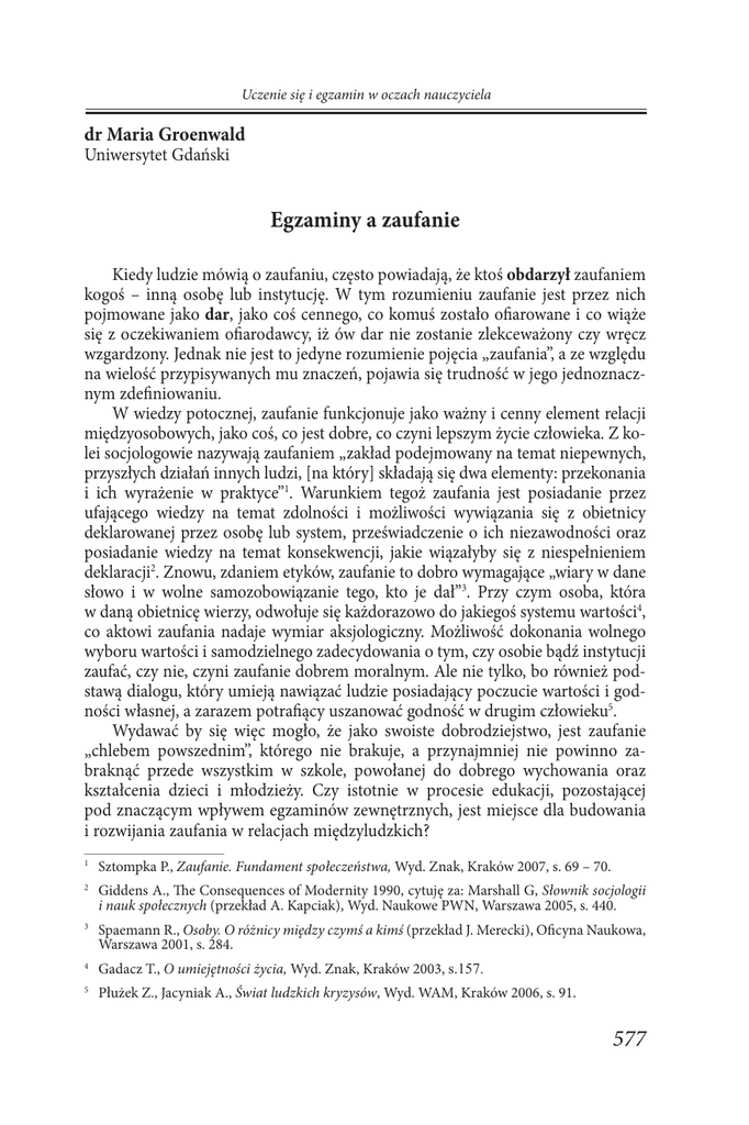 Uczenie się i egzamin w oczach nauczyciela dr Maria Groenwald Uniwersytet Gdański Egzaminy a zaufanie Kiedy ludzie mówią o zaufaniu, często powiadają, że ktoś obdarzył zaufaniem kogoś – inną osobę lub instytucję. W tym rozumieniu zaufanie jest przez nich pojmowane jako dar, jako coś cennego, co komuś zostało ofiarowane i co wiąże się z oczekiwaniem ofiarodawcy, iż ów dar nie zostanie zlekceważony czy wręcz wzgardzony. Jednak nie jest to jedyne rozumienie pojęcia „zaufania”, a ze względu na wielość przypisywanych mu znaczeń, pojawia się trudność w jego jednoznacznym zdefiniowaniu. W wiedzy potocznej, zaufanie funkcjonuje jako ważny i cenny element relacji międzyosobowych, jako coś, co jest dobre, co czyni lepszym życie człowieka. Z kolei socjologowie nazywają zaufaniem „zakład podejmowany na temat niepewnych, przyszłych działań innych ludzi, [na który] składają się dwa elementy: przekonania i ich wyrażenie w praktyce”1. Warunkiem tegoż zaufania jest posiadanie przez ufającego wiedzy na temat zdolności i możliwości wywiązania się z obietnicy deklarowanej przez osobę lub system, przeświadczenie o ich niezawodności oraz posiadanie wiedzy na temat konsekwencji, jakie wiązałyby się z niespełnieniem deklaracji2. Znowu, zdaniem etyków, zaufanie to dobro wymagające „wiary w dane słowo i w wolne samozobowiązanie tego, kto je dał”3. Przy czym osoba, która w daną obietnicę wierzy, odwołuje się każdorazowo do jakiegoś systemu wartości4, co aktowi zaufania nadaje wymiar aksjologiczny. Możliwość dokonania wolnego wyboru wartości i samodzielnego zadecydowania o tym, czy osobie bądź instytucji zaufać, czy nie, czyni zaufanie dobrem moralnym. Ale nie tylko, bo również podstawą dialogu, który umieją nawiązać ludzie posiadający poczucie wartości i godności własnej, a zarazem potrafiący uszanować godność w drugim człowieku5. Wydawać by się więc mogło, że jako swoiste dobrodziejstwo, jest zaufanie „chlebem powszednim”, którego nie brakuje, a przynajmniej nie powinno zabraknąć przede wszystkim w szkole, powołanej do dobrego wychowania oraz kształcenia dzieci i młodzieży. Czy istotnie w procesie edukacji, pozostającej pod znaczącym wpływem egzaminów zewnętrznych, jest miejsce dla budowania i rozwijania zaufania w relacjach międzyludzkich? Sztompka P., Zaufanie. Fundament społeczeństwa, Wyd. Znak, Kraków 2007, s. 69 – 70. 1 Giddens A., The Consequences of Modernity 1990, cytuję za: Marshall G, Słownik socjologii i nauk społecznych (przekład A. Kapciak), Wyd. Naukowe PWN, Warszawa 2005, s. 440. 2 Spaemann R., Osoby. O różnicy między czymś a kimś (przekład J. Merecki), Oficyna Naukowa, Warszawa 2001, s. 284. 3 Gadacz T., O umiejętności życia, Wyd. Znak, Kraków 2003, s.157. 4 Płużek Z., Jacyniak A., Świat ludzkich kryzysów, Wyd. WAM, Kraków 2006, s. 91. 5 577 XIV Konferencja Diagnostyki Edukacyjnej, Opole 2008 Komu ufają uczniowie i kto im ufa P. Sztompka osoby, którym ludzie ufają, dzieli na dwie grupy: na adresatów pierwotnych i na adresatów wtórnych6. Wśród członków szkolnej społeczności pierwotnymi adresatami zaufania są osoby, które pozostają ze sobą w bezpośrednim i codziennym kontakcie: dziewczęta i chłopcy tak ze szkoły, jak i spoza niej, ich rodzice oraz nauczyciele. W otoczeniu najbliższej rodziny oraz towarzyszy zabaw, dzieci nauczyły się ufać (lub nie). Toteż kiedy rozpoczęły uczenie się w szkole, były gotowe obdarzyć wstępnym „kredytem zaufania” nauczycieli, wierząc, że ci będą ich wspierać w urzeczywistnianiu nadziei i w realizacji życiowych celów. Nauczycielom zawierzyli także rodzice uczniów, powierzając opiece pedagogów osoby im drogie i dla nich ważne7. Tym samym zobligowali i wychowawców, i szkołę, do odpowiedzialnej pracy na rzecz wspierania wychowanków. Jednak nauczyciele często nie chcą lub nie umieją sprostać oczekiwaniom uczniów i rodziców. Popełniają błędy, do których J. Tischner zalicza: nieliczenie się z nadzieją powierzonych ich opiece osób; autorytaryzm w nauczaniu i wychowaniu; zawłaszczanie uczniowskiej przestrzeni wolnego wyboru; poniżanie, napiętnowanie młodych; okłamywanie i nieszanowanie ich; niedotrzymywanie obietnic; całkowite podporządkowanie się wydawanym przez instytucje rozporządzeniom, a przez to niejako wyrażenie zgody na podejmowanie przez nie decyzji dotyczących wychowania i własne ubezwłasnowolnienie8. Jednak takie postępowanie nauczycieli niweczy pokładane w nich przez uczniów zaufanie. Czy wobec tego uczniowie ufają sobie nawzajem? Wydawać by się mogło, że tak, gdyż dzięki zaufaniu mogą nawiązywać i podtrzymywać przyjaźnie, wspierać się w dobrych i złych chwilach. Tymczasem akty przemocy, których na co dzień dopuszczają się między sobą (wymuszenia, szantaż, pobicia), temu przekonaniu przeczą. Z powodu wzajemnej agresji w szkole nie czują się bezpiecznie przede wszystkim uczniowie szkół podstawowych i gimnazjów9. Zamiast ze sobą współpracować – rywalizują o pozycję w grupie, o oceny, o uniknięcie napiętnowania i wykluczenia przez wychowawców i kolegów, a egzaminy zewnętrzne są wskazywane jako znacząca determinanta tego zjawiska10. Sztompka P., op. cit., s. 103 – 104. 6 Groenwald M., Nauczyciel i uczeń – między zaufaniem a nieufnością, [w:] A. Hibszer (red.), Polska dydaktyka geografii. Idee – tradycje – wyzwania, Wyd. Wydziału Nauk o Ziemi Uniwersytetu Śląskiego, Sosnowiec 2008, s. 70 – 71. 7 Tischner J., Etyka solidarności, Wyd. Znak, Kraków 2000, s. 87 – 92. 8 Kowalski M.W., Jasiński M., Prawa ucznia w szkole, Wyd. CODN, Warszawa 2006, s. 86 – 89. 9 Szkudlarek T., Ekonomia i społeczne skutki reform oświatowych, [w:] B. Niemierko, G. Szyling (red.), Holistyczne i analityczne metody diagnostyki edukacyjne, Wyd. Fundacja Rozwoju Uniwersytetu Gdańskiego, Gdańsk 2005, s